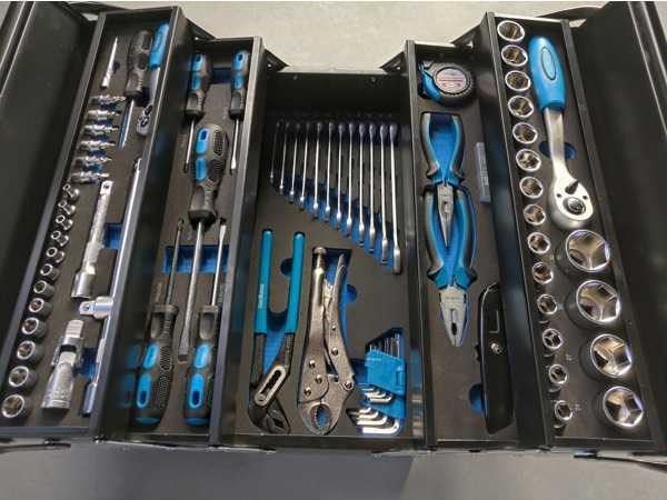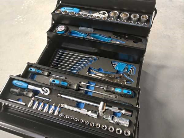 86 delige gereedschapskist gevuld met kwaliteits gereedschap Nieuw in doos, StahlKaiser-gereedschappen chroom-vanadium-staal, 12 ringsteeksleutels: 6-8-9-10-11-12-13-14-15-16-17-19 mm, 1 griptang (lastang) ca. 22 cm lang, 1 waterpomptang ca. 24,5 cm lang, Inbussleutel set 9 stuks (1.5 - 10mm), 1 punttang ongeveer 16 cm lang, 1 combinatietang ca. 18 cm lang, 5 schroevendraaiers (1x PH1x75, 1xPH2x100, 1xSL5x75, 1xSL6x100, 1xSL8x150), 1 ratel met fijne tanden 0,635 cm (1/4 inch), 6 bit-doppen 0,635 cm (1/4 inch) 1x PH1, 1x PH2, 1x PZ1, 1x PZ2, 1x SL3, 1x SL4, 1 schroevendraaiergreep voor bitdoppen 0,635 cm (1/4 inch), 1 verlengstuk 0,635 cm (1/4 inch) 7,5 cm lang, 12 doppen 0,635 cm (1/4 inch) 4-4.5-5-5.5-6-7-8-9-10-11-12-13mm, 1 fijngetande ratel met snelsluiting 1,27 cm (1/2 inch) 18 doppen 1,27 cm (1/2 inch) 10-11-12-13-14-15-16-17-18-19-20-21-22-23-24-27-30-32mm, 1 verlengstuk 1,27 cm (1/2 inch) 12,7 cm lang, 1 verlengstuk 1,27 cm (1/2 in.) 25,4 cm lang met T-schuifhandvat, 1 kruiskoppeling 1,27 cm (1/2 inch) nieuw Nee Merk: Stahlkaiser Metaal: true Met inhoud: true