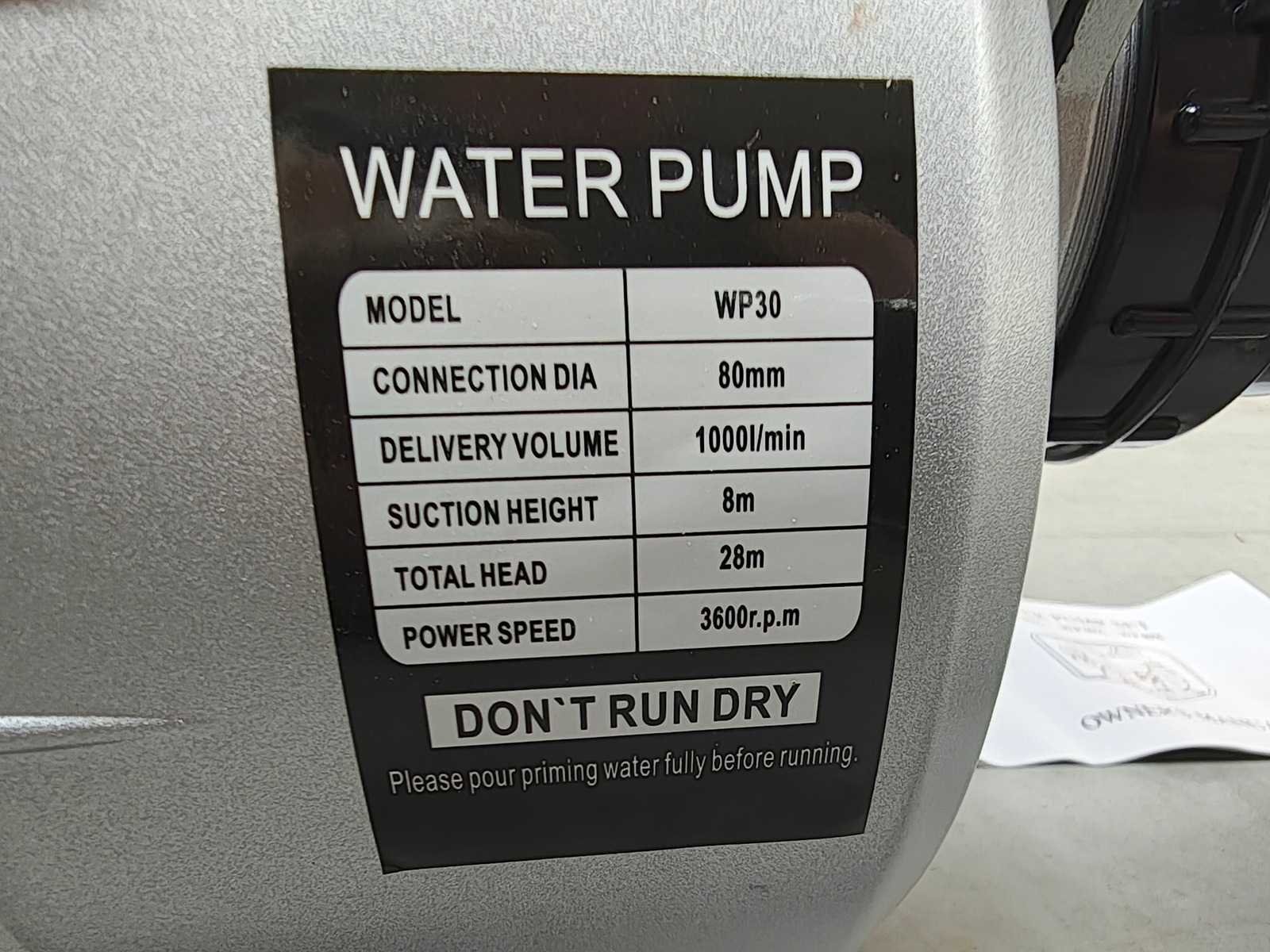 Waterpomp met benzine motor. ongebruikt 30M3/uur Nee Merk: DW Type: 30M3 Bouwjaar: 2024 Capaciteit.: 3000l/hr