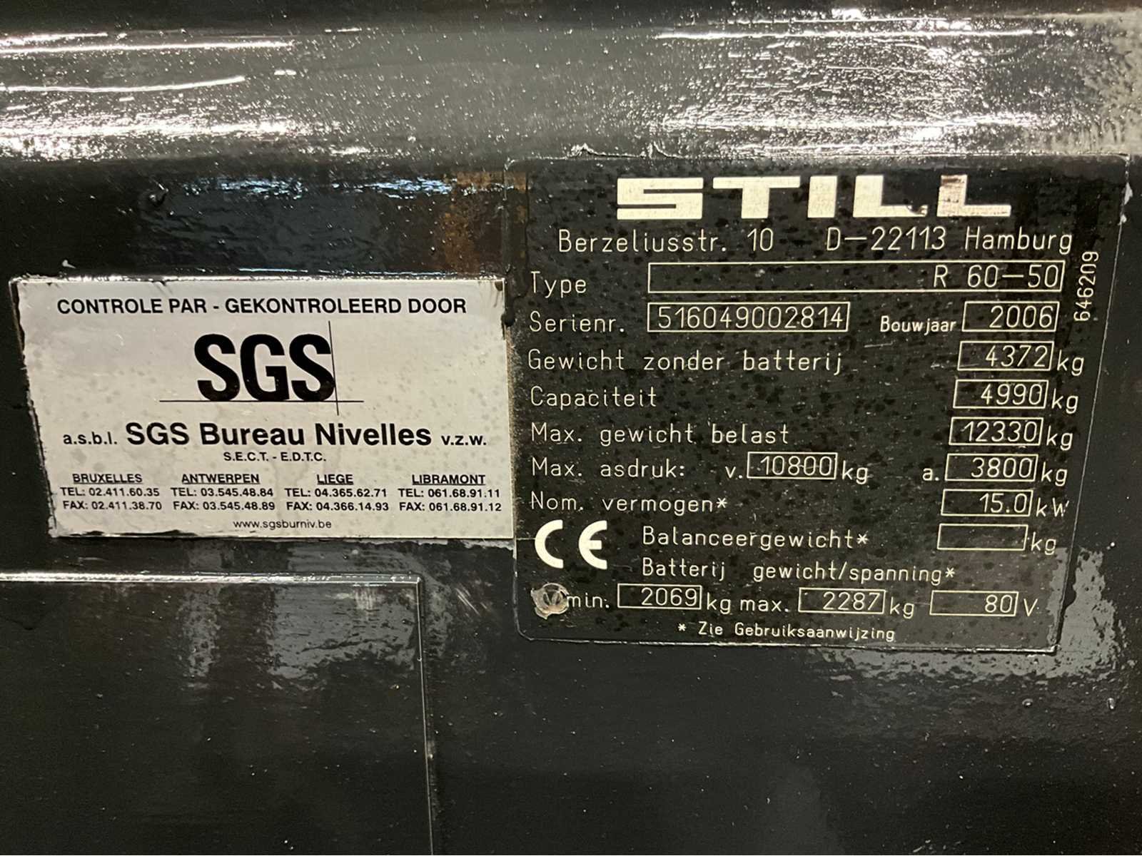 Nee Merk: Still Type: R60-50 Bouwjaar: 2006 Serienummer: 516049002814 Brandstof: Elektrisch Mast: Duplex Soort band: Volrubber banden Aantal wielen: 4 Afgelezen urenstand: 10130 Hydraulisch verstelbare lepels: true Duplex mast: true Eigen gewicht: 6400kg Hefvermogen: 5000kg Lepellengte: 2400mm Max. hefhoogte: 3500mm Hefhoogte: 3500mm Vol rubber banden: true Minimale doorrijhoogte: 2700mm Totale afmeting L: 5200mm Totale afmeting Breedte: 1400mm Totale afmeting Hoogte: 2700mm