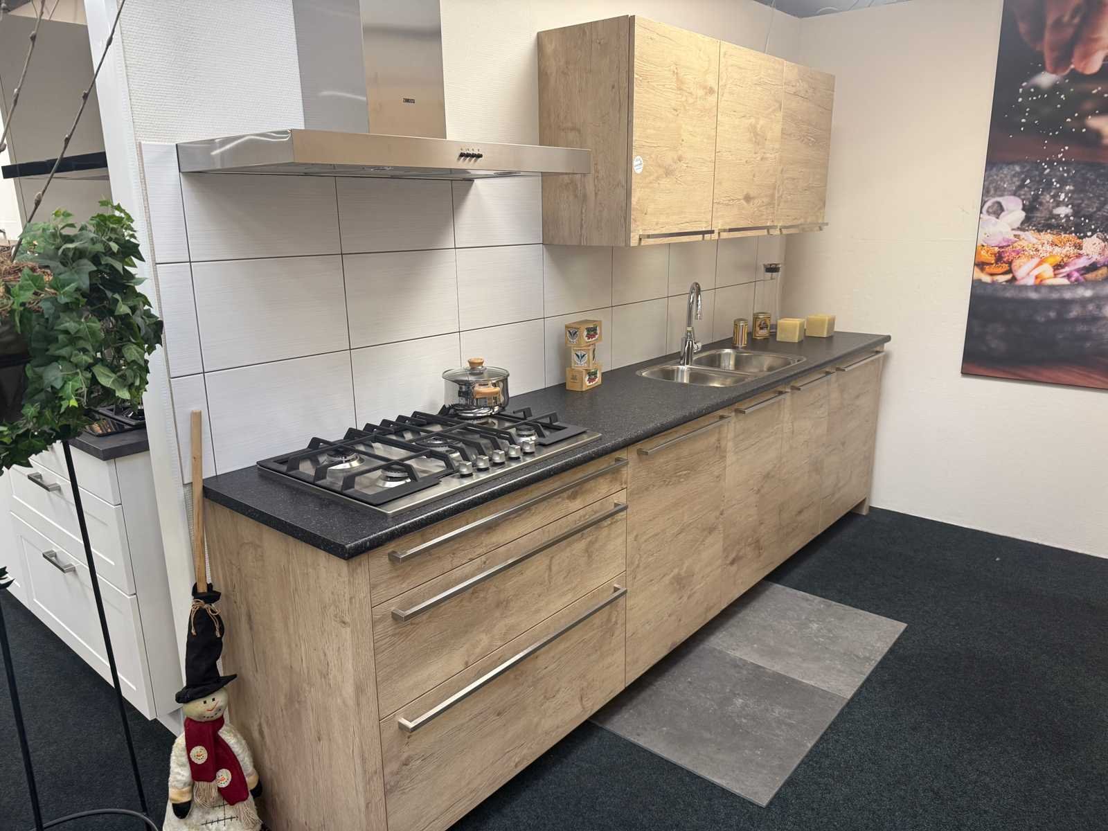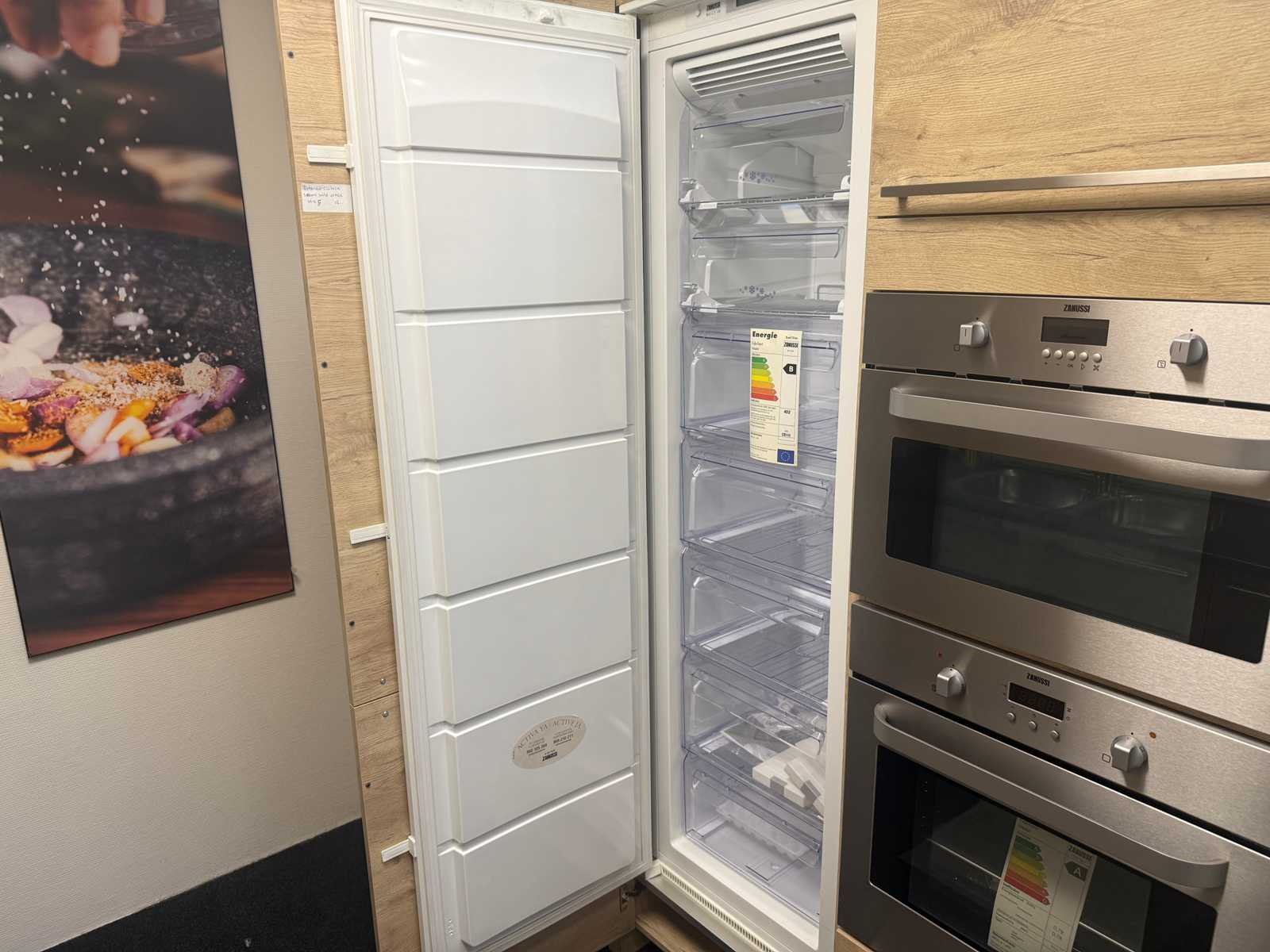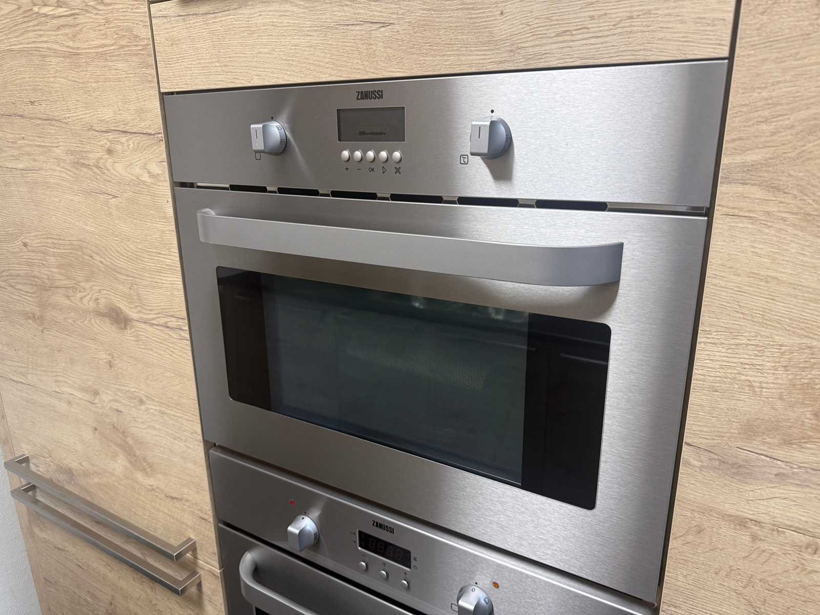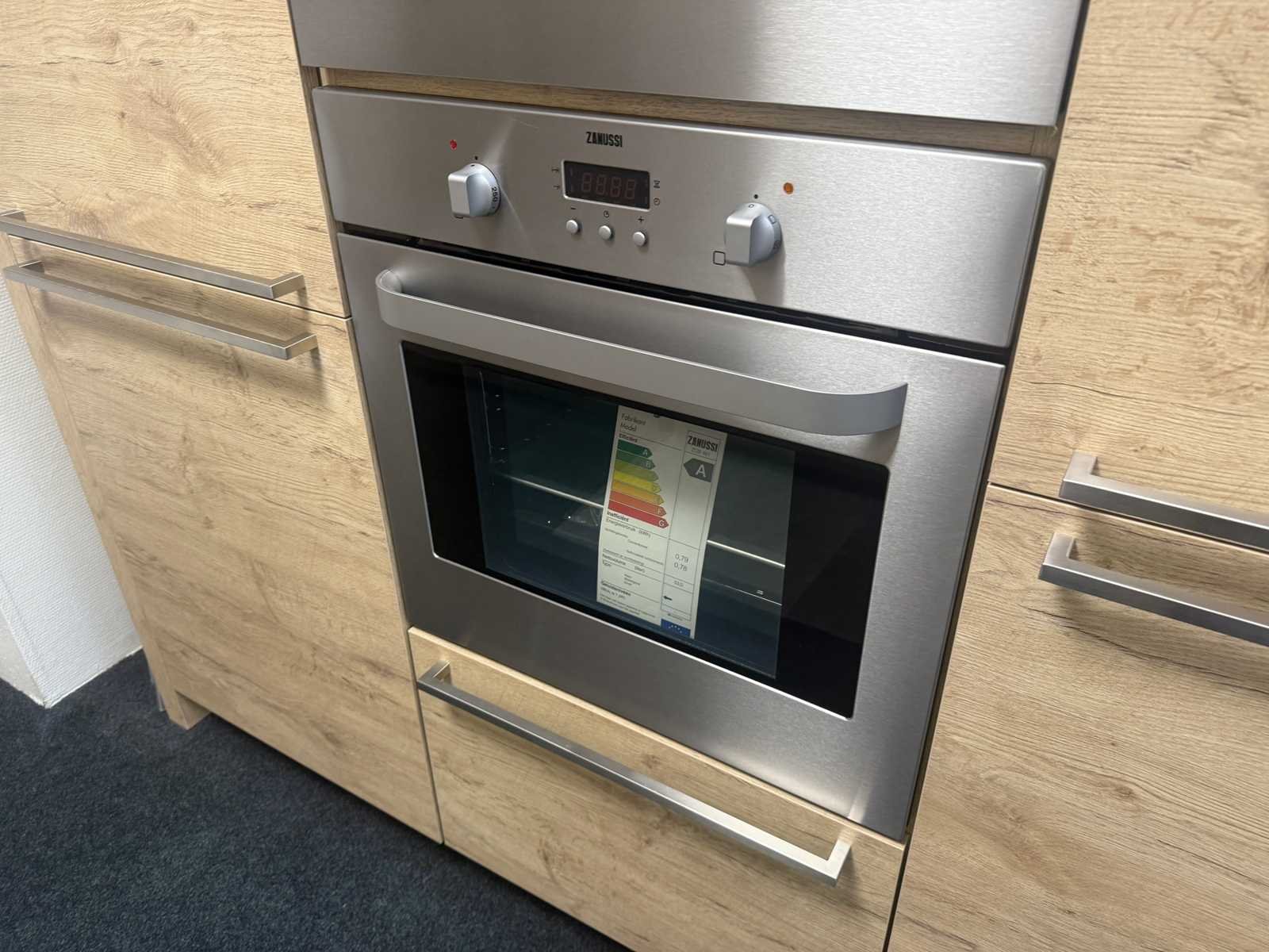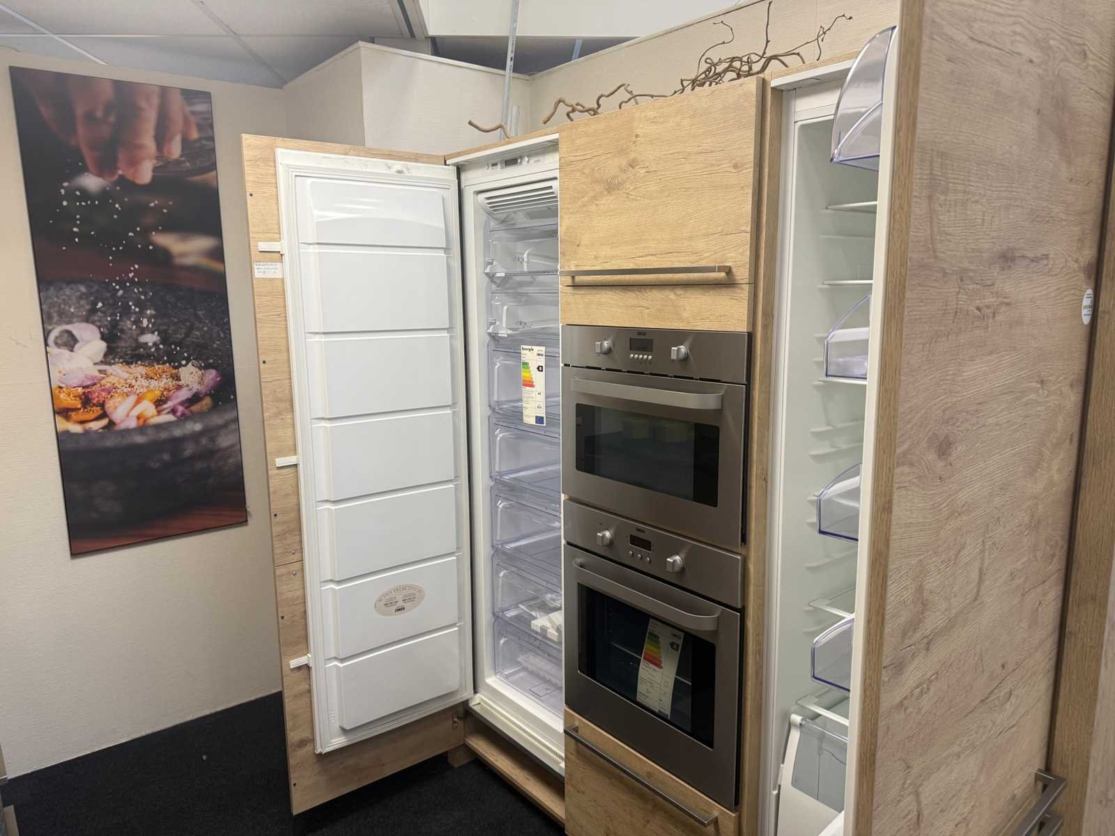 Afmetingen kastenwand circa 188x60x224 cm; keuken dient gedemonteerd te worden op locatie Nee Merk: Rotpunkt Type keukenopstelling: Recht Lengte: 298cm Breedte: 60cm Hoogte: 93cm Aanrechtblad: Kunststof Magnetron: Zanussi BH32Cf2 Fornuis: Zanussi Koelkast: Zanussi ZBA7330 Vriezer: Zanussi ZBF7226 Softclose: true Oven: Zanussi ZOB 461 Afzuigkap: Zanussi E076B Kleur: Eiken gelamineerd