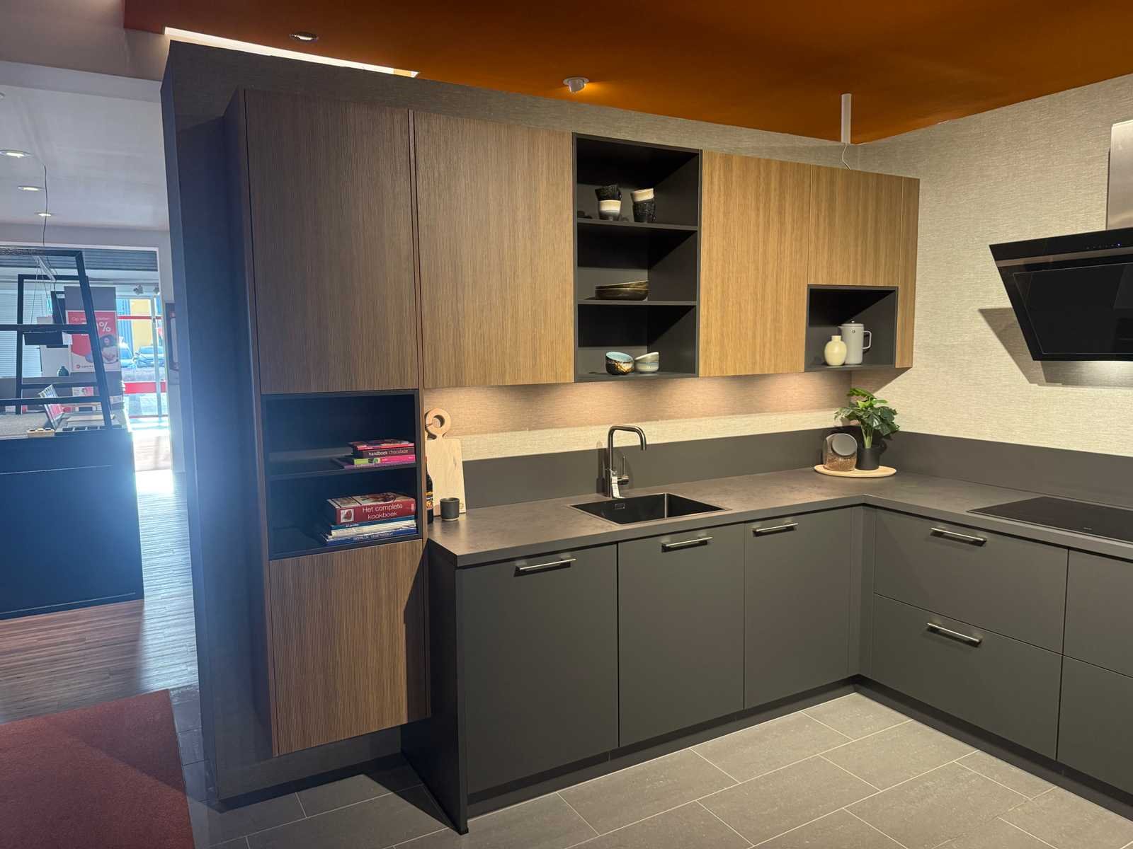 Afmetingen linkerdeel circa 304,1x60x220 cm; afmetingen rechterdeel circa 292,5x60x200 cm; reeds gedemonteerd en ingepakt op pallets. (afstapelen, omruilen of statiegeld per pallet); Pallets zijn niet inbegrepen; statiegeld betalen bij afhalen, of pallets afstapelen; werkblad niet ingepakt op pallets (25-SKR-03006) Nee Merk: Schüller Type keukenopstelling: Hoek Kraan: Lanesto Gootsteen: Lanesto Aanrechtblad: Kunststof Fornuis: AEG Koelkast: Juno JCN102F0S1 Softclose: true Oven: AEG KMK761080B Afzuigkap: Siemens Vaatwasser: Juno JGVX608D1 Kleur: Lavazwart + donker eiken rillen optiek