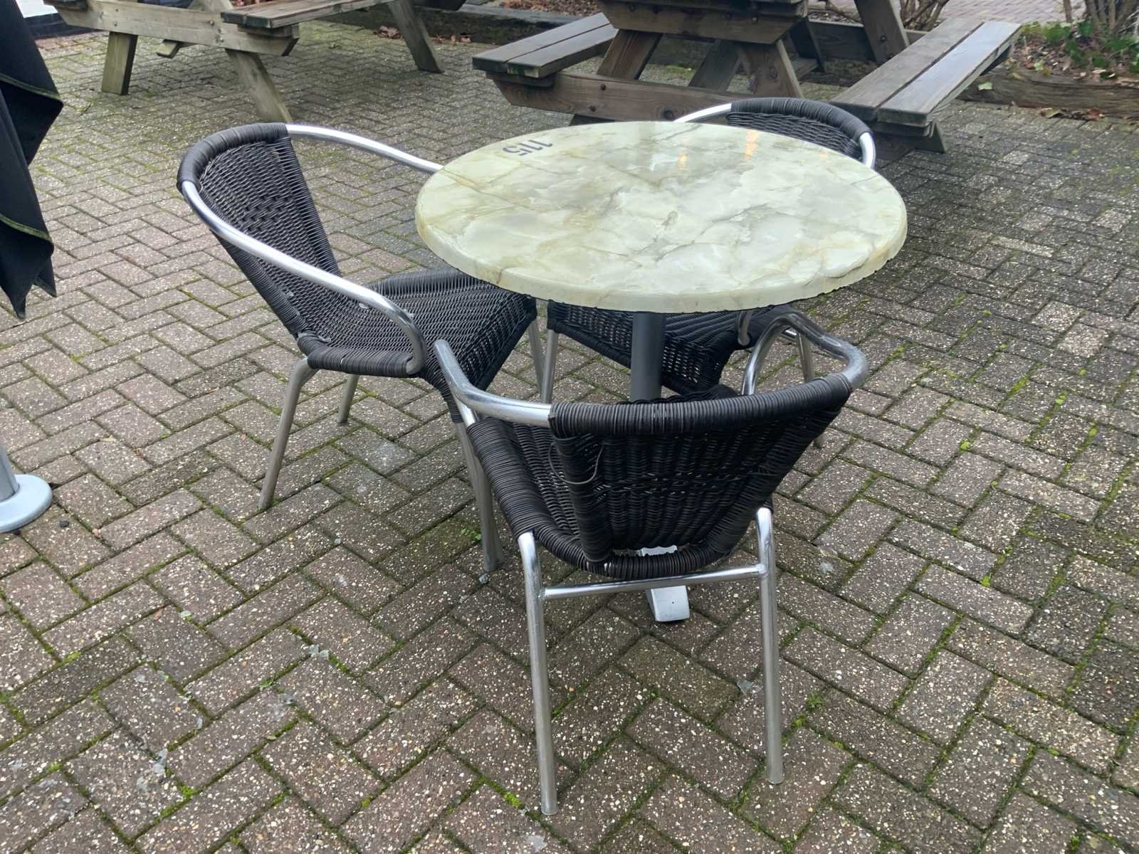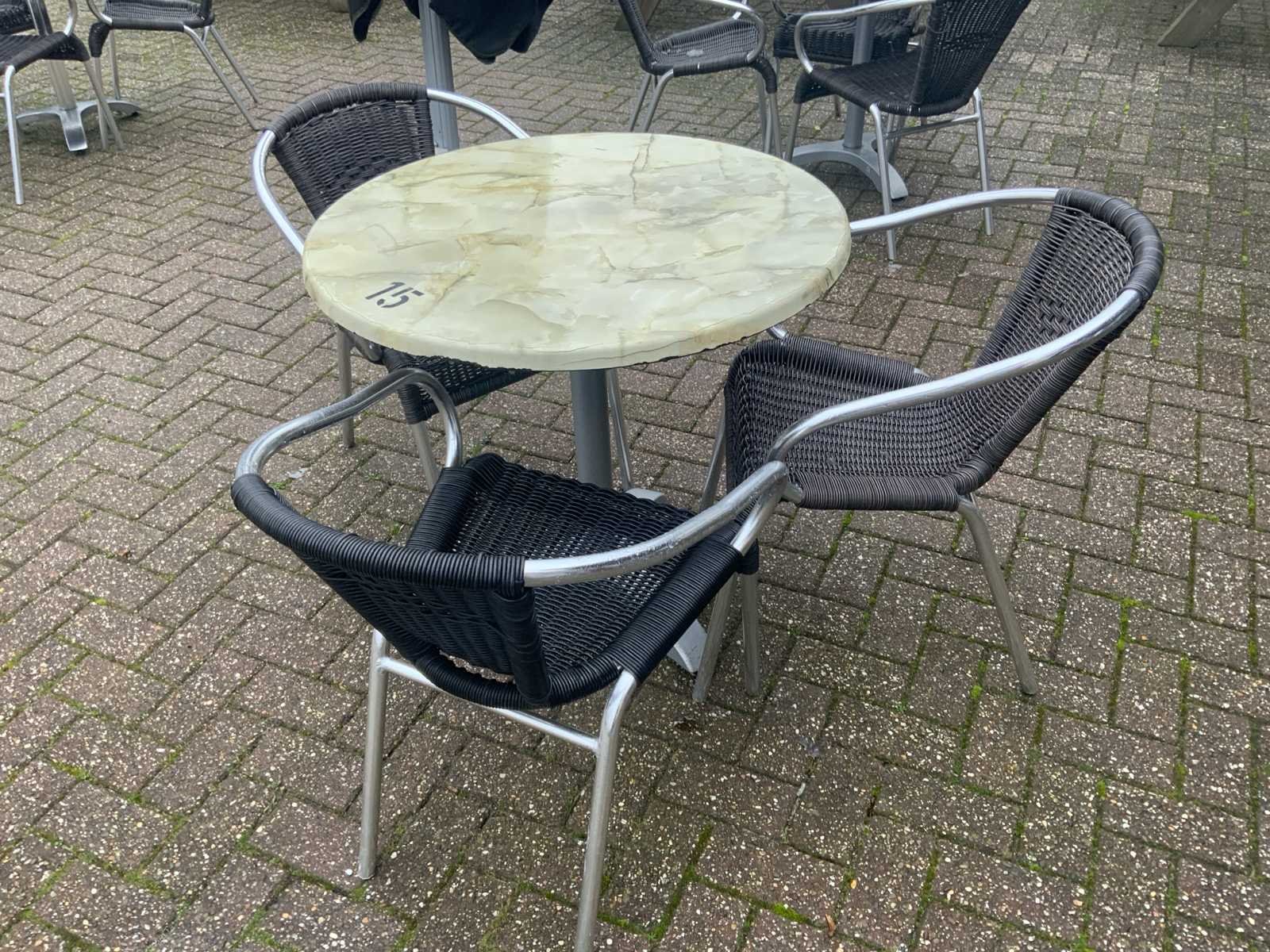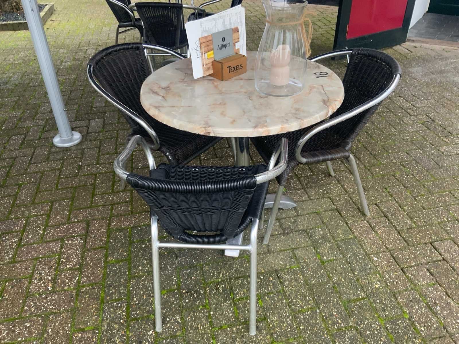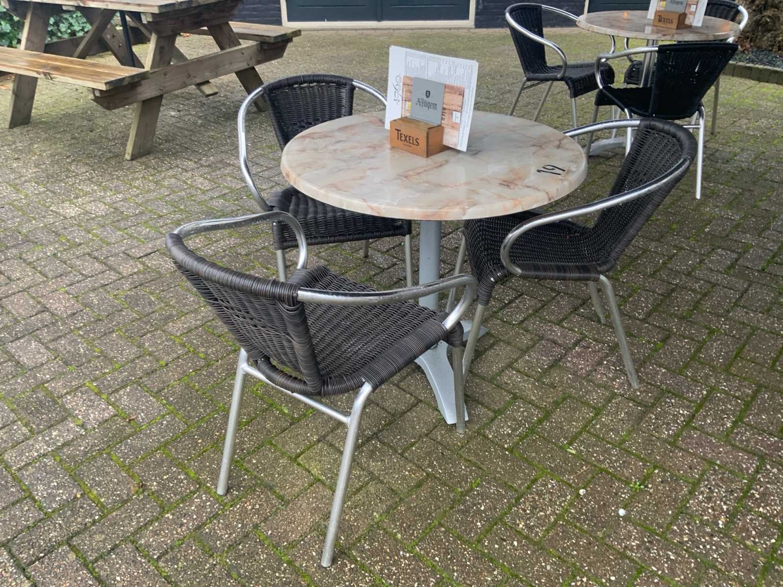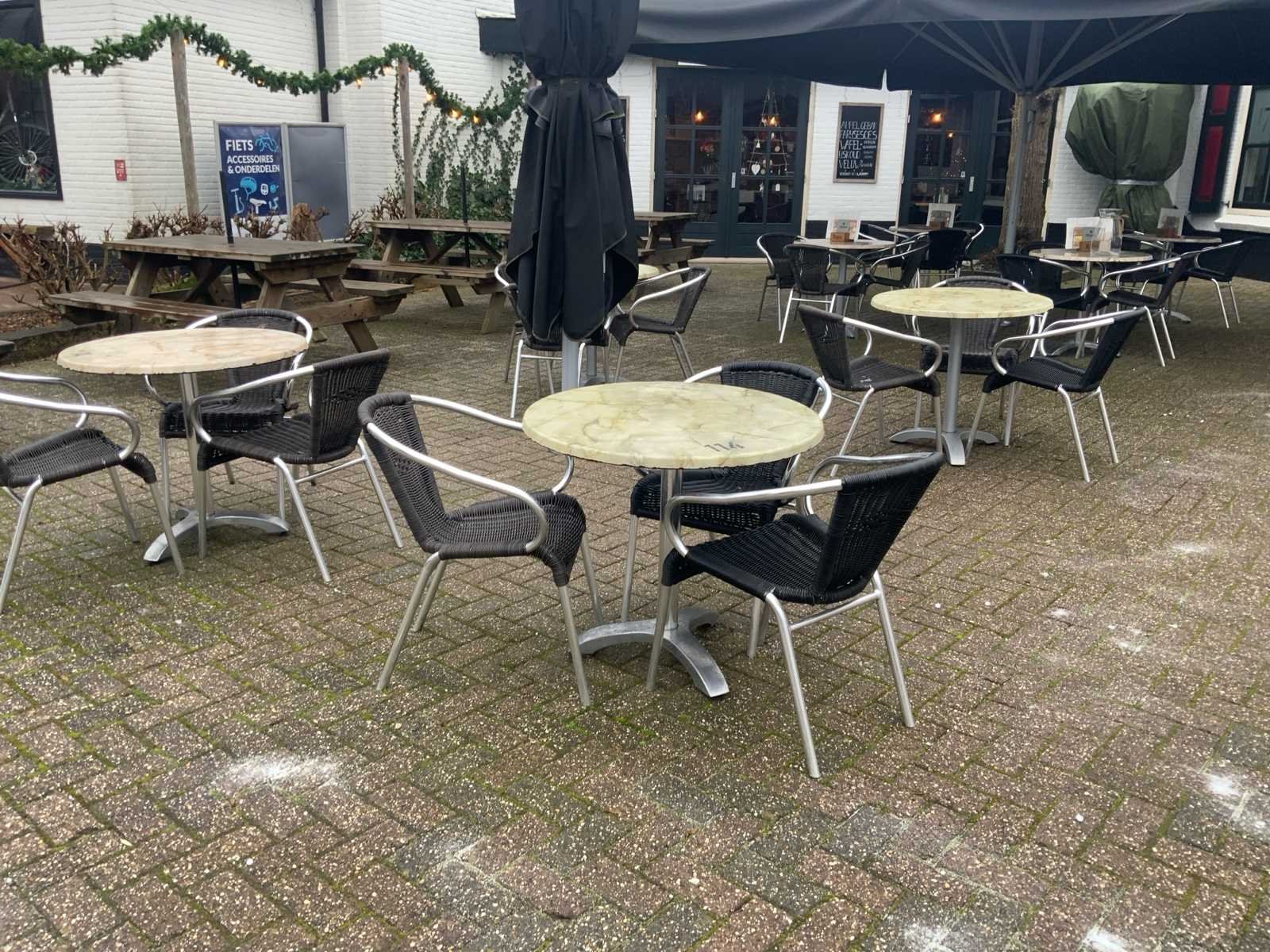 Bestaande uit 25 tafels Voorzien van circa 75 terrasstoelen * inclusief 2x parasol van circa 5x5 meter (let op voet in de grond niet inbegrepen) * inclusief 4 picknicktafels 160x160cm Nee Breedte: 80cm