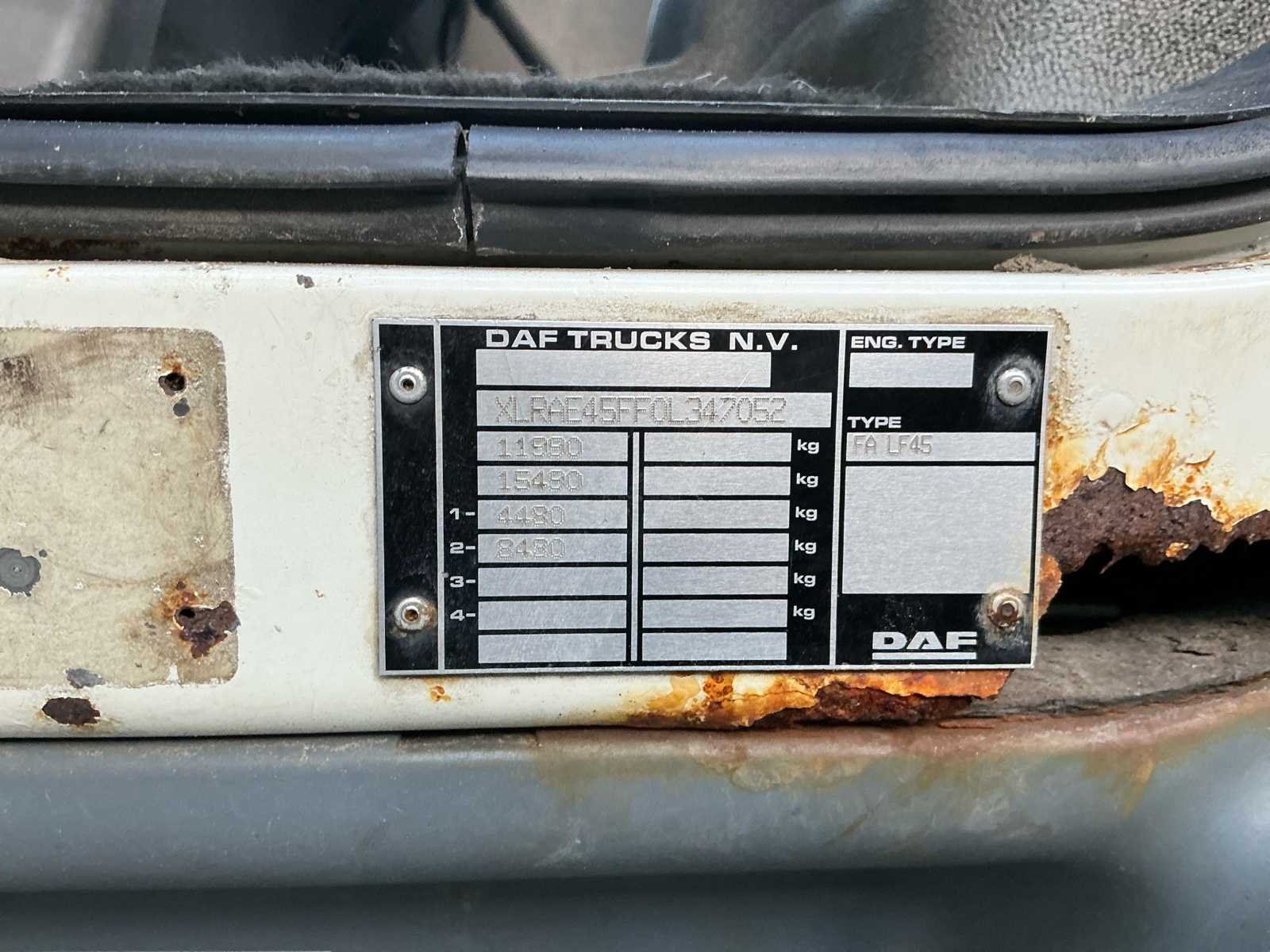 Taggograaf, karkit, elektrische spiegels, lucht geveerde stoel. (LET OP! dit voertuig heeft een kenteken registratie, bij afhalen dient u dit ter plaatste bij een derde partij te naam te stellen of te exporteren, hier zijn extra kosten aan verbonden) Nee Kenteken: JKS-52-P Merk: DAF Model: LF Type: 45 Handelsbenaming: FA LF45G12 Aantal zitplaatsen: 2 Aantal sleutels: 1 Bruto BPM (NL): 9369€ Transmissie: Handgeschakeld Datum eerste toelating (NL): 2008-10-30 Datum eerste toelating: 2008-10-30 APK vervaldatum: 2026-08-21 Bouwjaar: 2008 Afgelezen kilometerstand: 122070km Vermogen (kW): 117kW Vermogen (pk): 160hp Cilinderinhoud: 4462cc Emissieklasse: 5 Brandstof: Diesel Aantal deuren: 2 Kleur: wit Carrosserie: kampeerwagen Ledig gewicht: 5797 Zelf rijdend exporteren: Mogelijk Self drive export possible : true