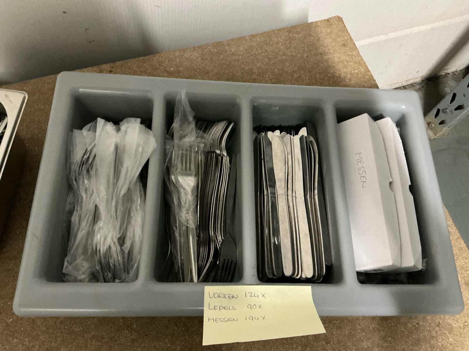 152x Grote borden 57x Kleine borden 20x kom 198x soepkommen 30x crème Brule schaaltjes 301x kleine lepel 124x vorken 90x lepels 194x messen 5x bestekbakken No