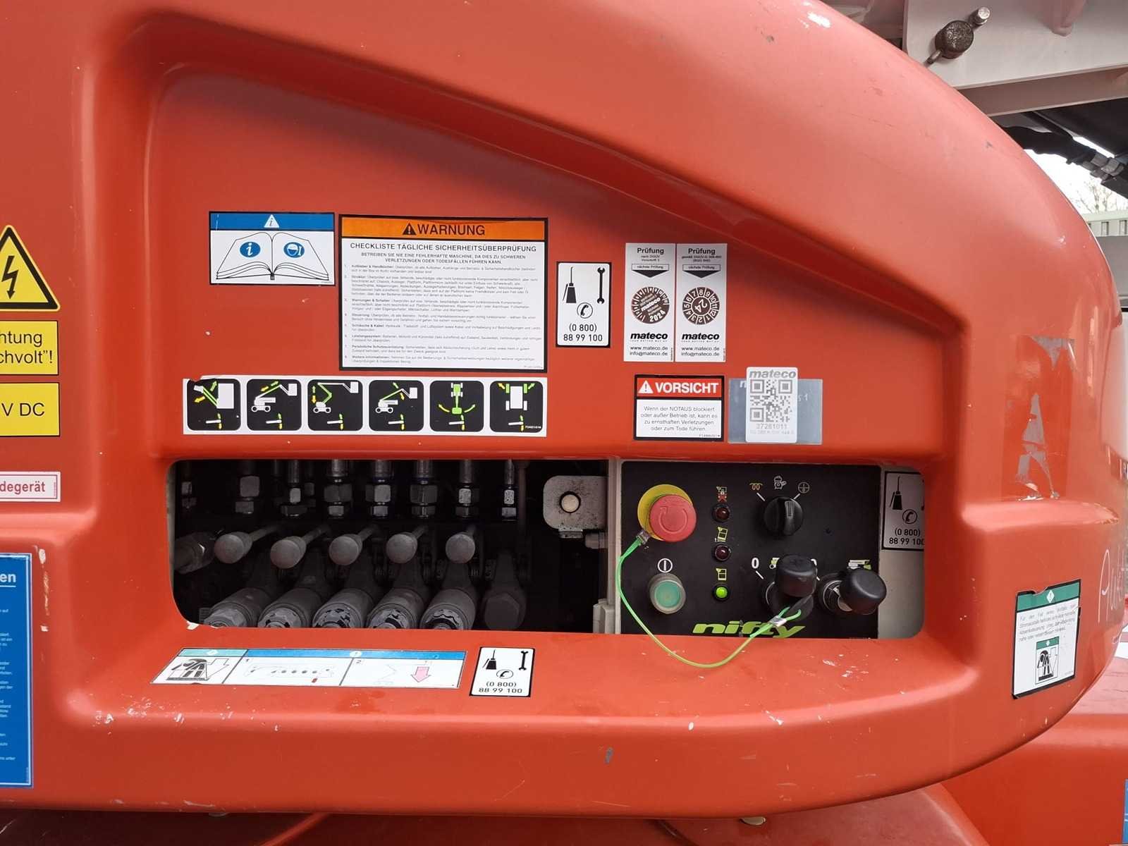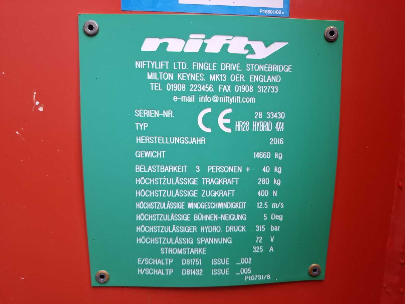 Accupakket is niet getest. Nee Merk: Nifty Type: HR28 Hybrid 4X4 Bouwjaar: 2016 Serienummer: 28 33430 Diesel: true Elektrisch: true Motorvermogen (kW): 35kW Telescoop hoogwerker: true Werkhoogte: 28000mm Horizontale rijkwijdte: 19000mm Plateau afm. l: 2400mm Plateau afm. b: 900mm Platform capaciteit: 280kg Afgelezen urenstand: 1317 Eigen gewicht: 14460kg Totale afmeting L: 9280mm Totale afmeting Breedte: 2490mm Totale afmeting Hoogte: 2700mm