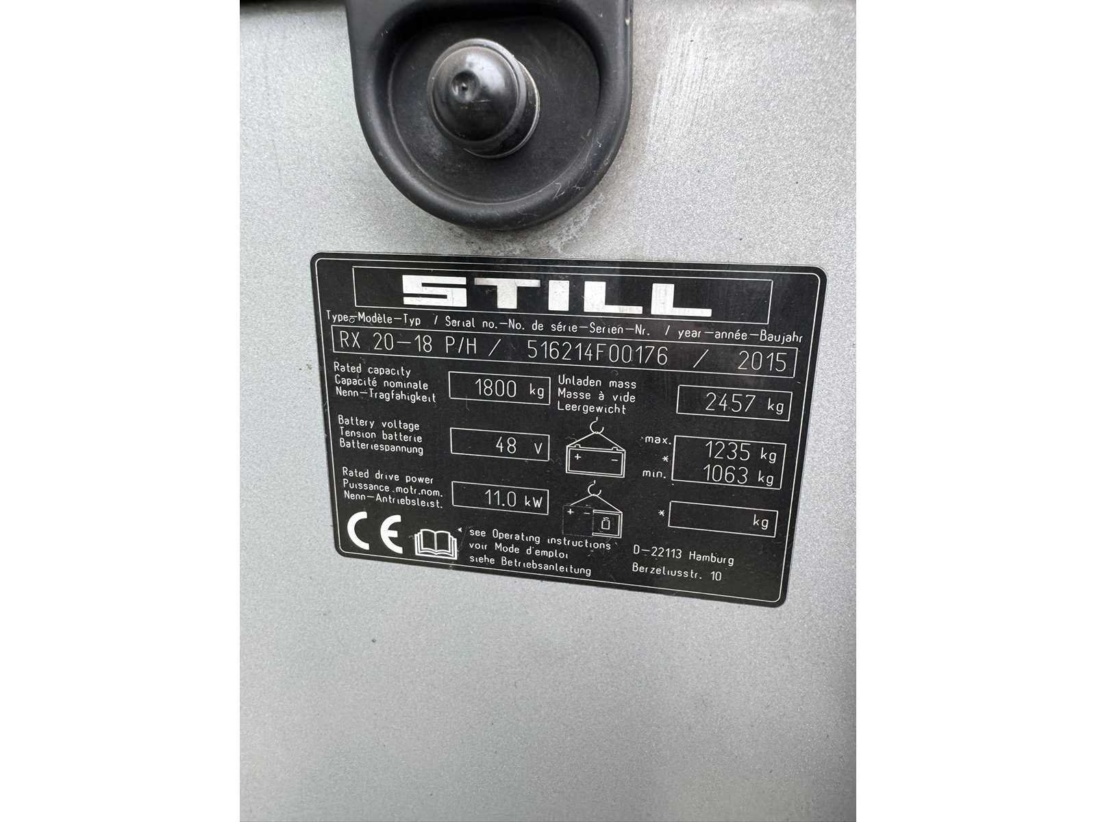 Rondom nieuwe banden! Bezichtiging op afspraak!! Nee Merk: Still Type: RX20-18PH Bouwjaar: 2015 Serienummer: 516315-E-00064 Brandstof: Elektrisch Mast: Duplex Aantal wielen: 4 Afgelezen urenstand: 9115 Accu lader: true Side-shift: true Duplex mast: true Eigen gewicht: 3692kg Hefvermogen: 1800kg Hefhoogte: 3230mm Vol rubber banden: true Totale afmeting L: 3200mm Totale afmeting Breedte: 1100mm Totale afmeting Hoogte: 2300mm
