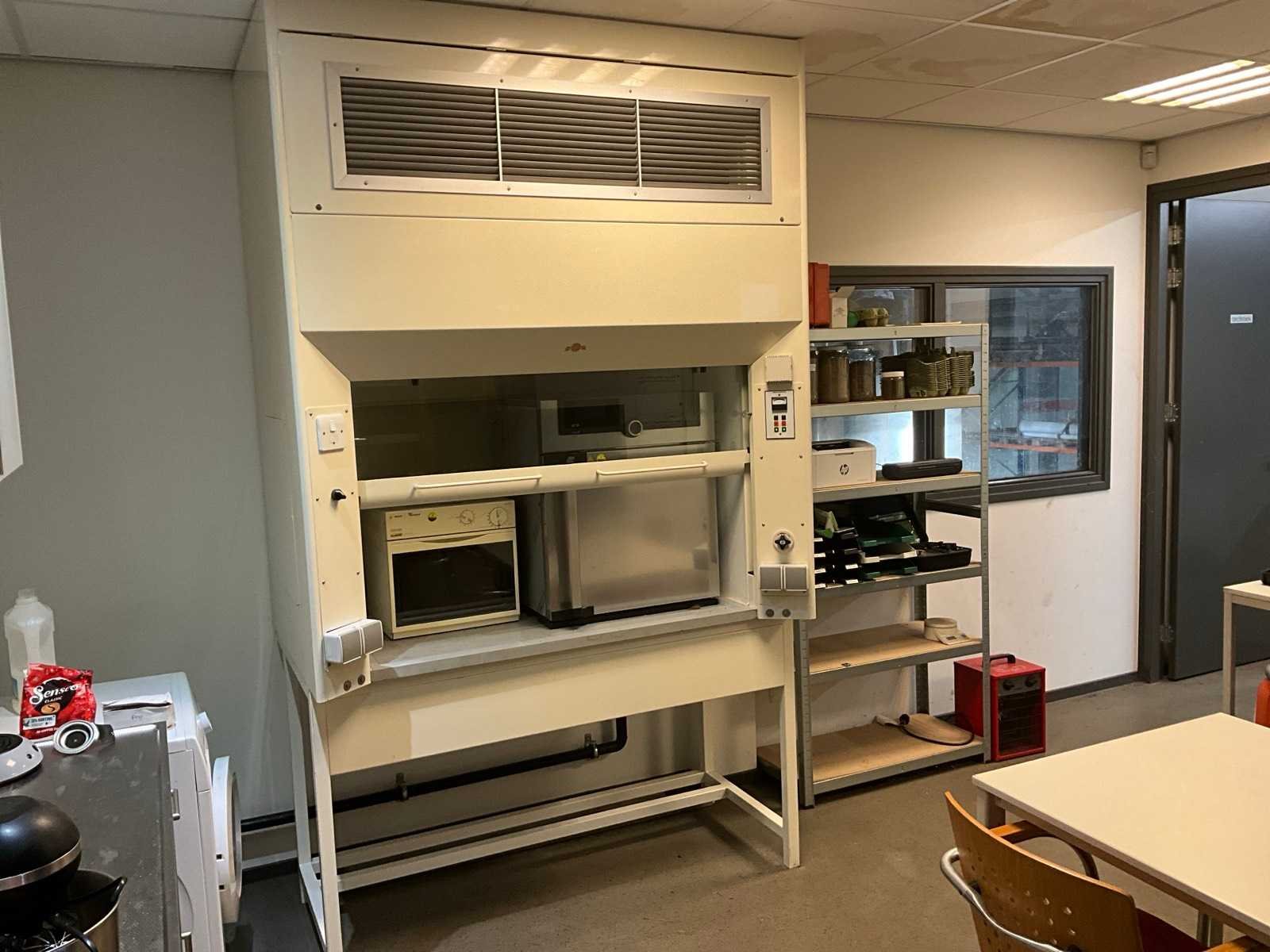 Voorzien van afzuiging, magnetron inbegrepen, laboratorium oven niet inbegrepen Nee Totale afmeting L: 1500mm Totale afmeting Breedte: 900mm Totale afmeting Hoogte: 2600mm