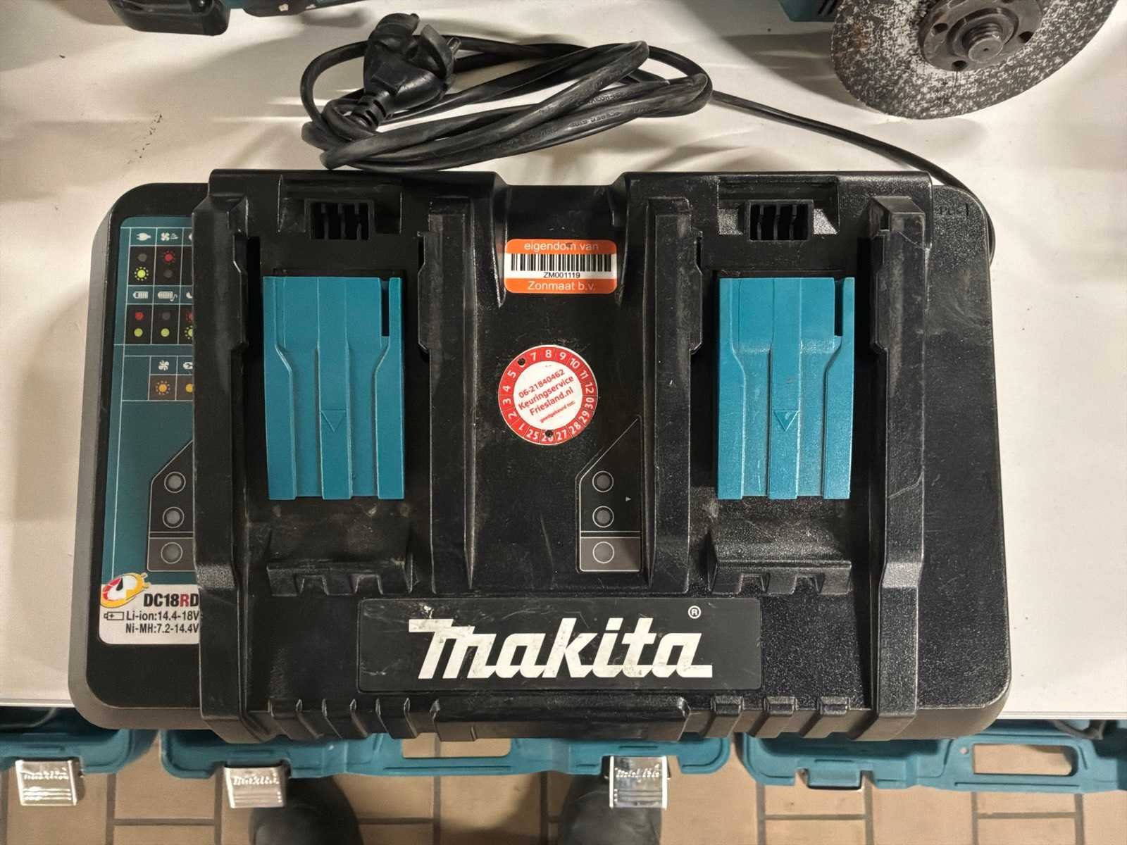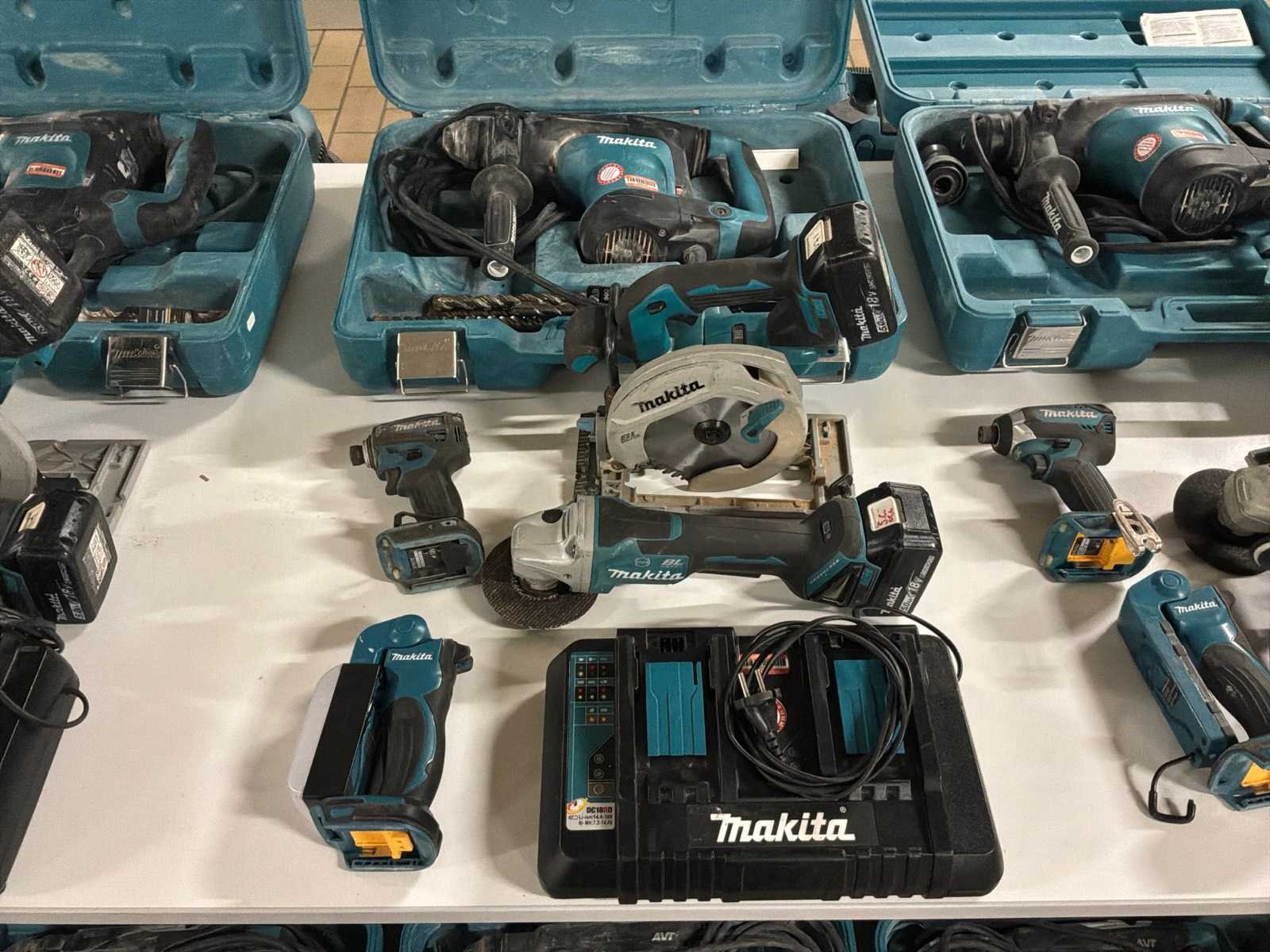 Bestaande uit: DML 801 accu zaklamp, DGA 508 accu haakse slijpmachine , accu slagschroevendraaier, DHS 680 accu cirkelzaag en een HR 3210C elektrische boorhamer. Inclusief twee 18V 5.0Ah accu’s met DC18RD acculader. Nee Merk: Makita Delig: 5