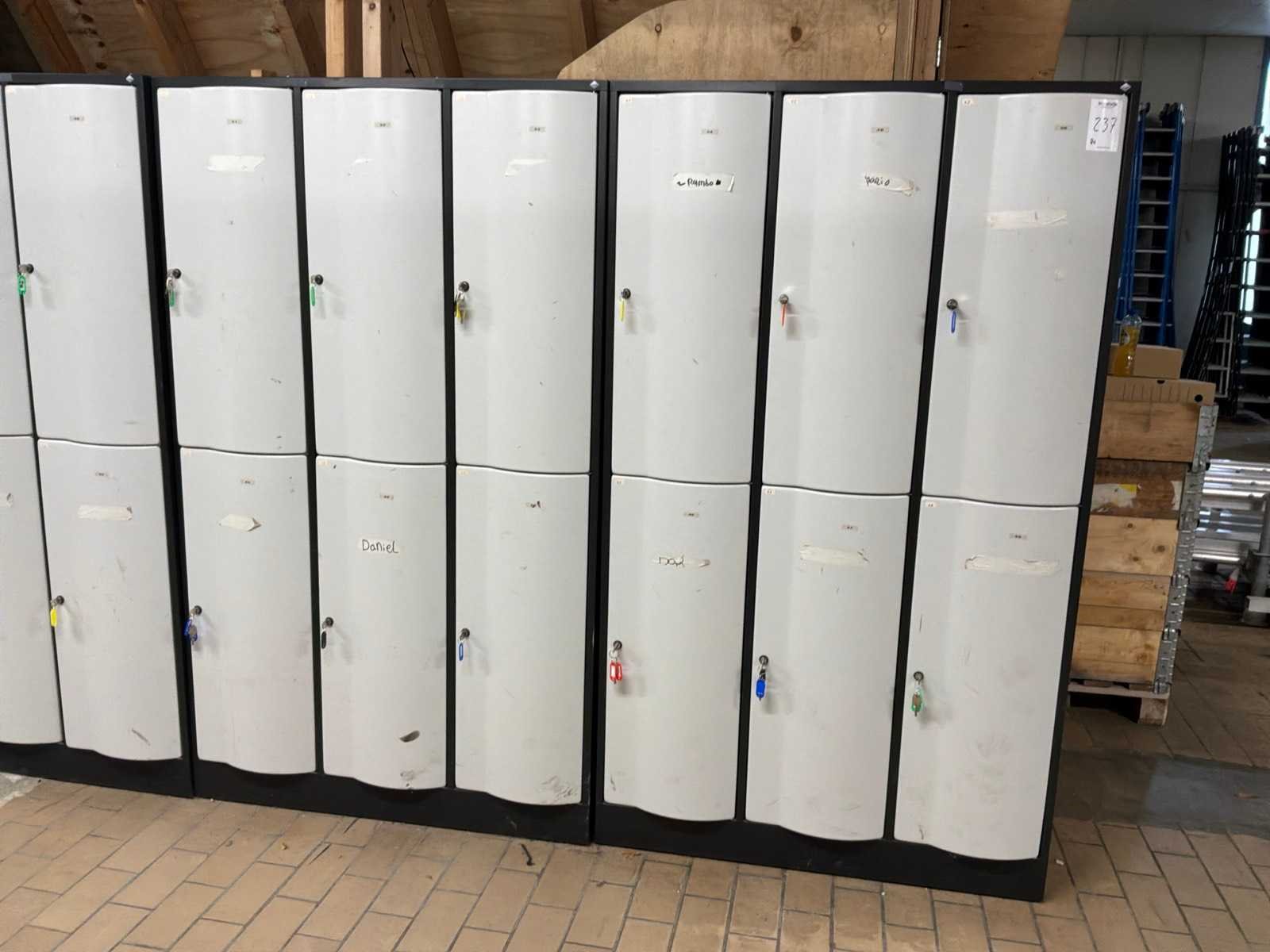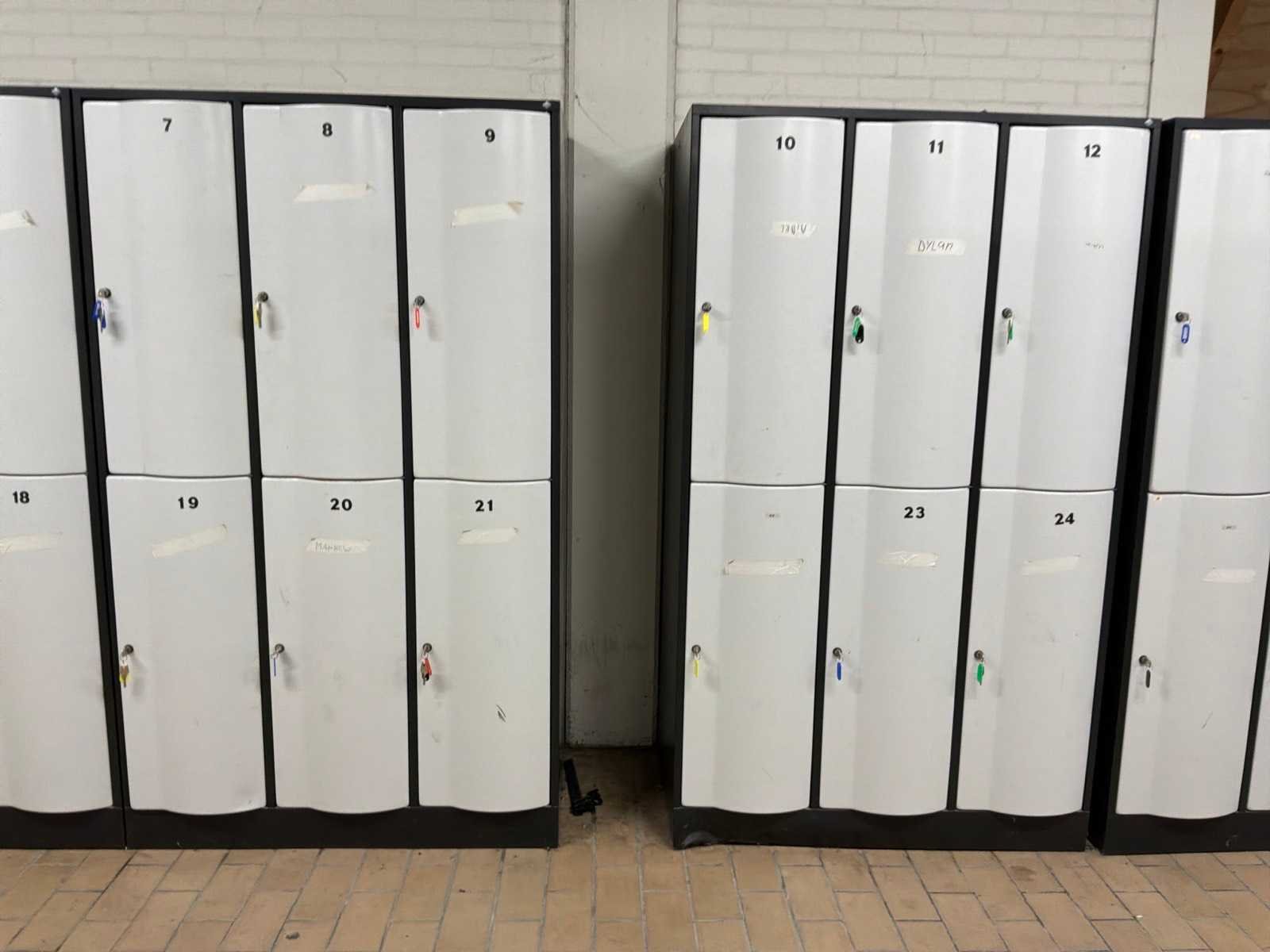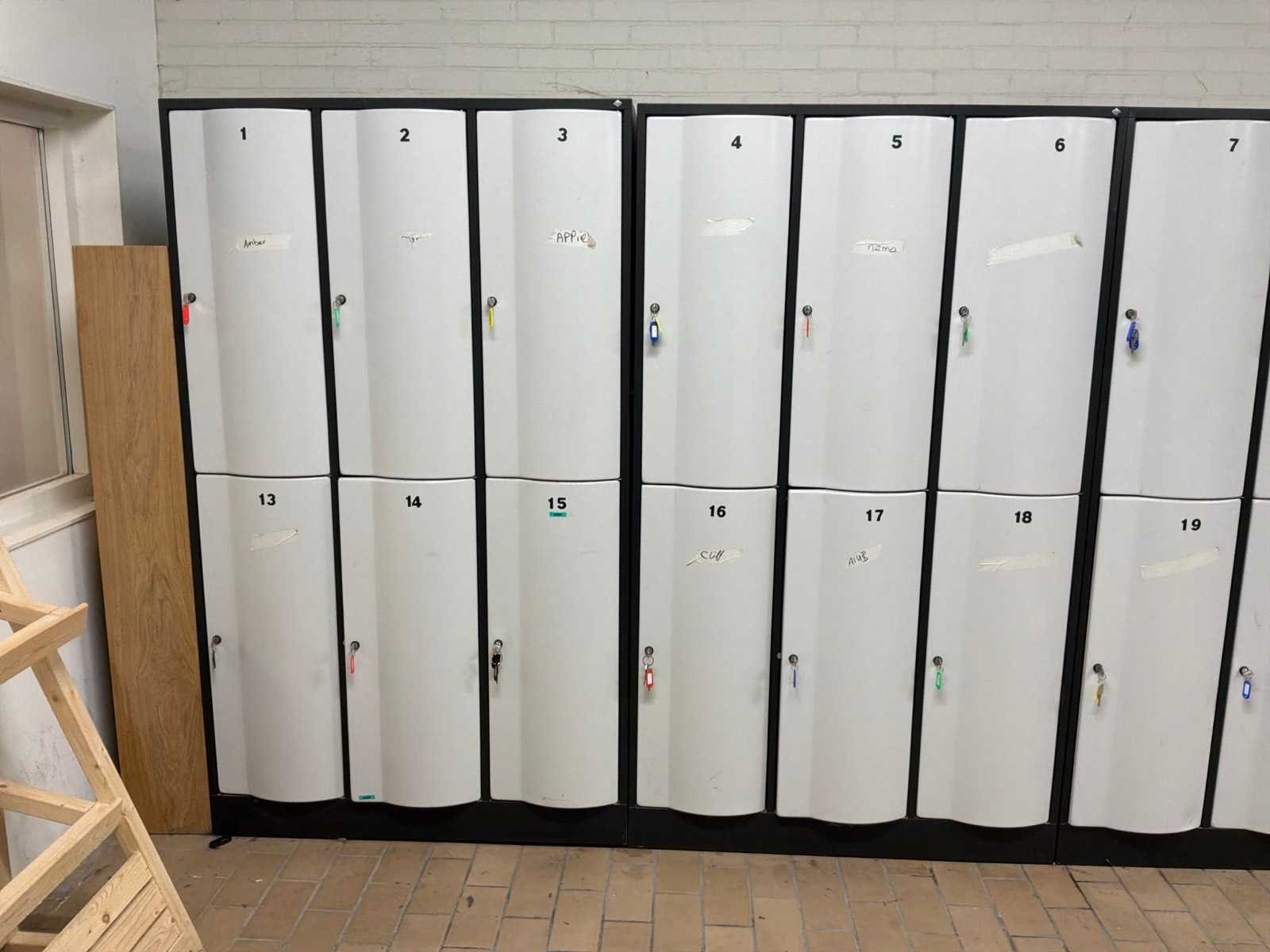 8x kleding lockers. Sleutels aanwezig. Nee Merk: CP Kleur: Zwart / Wit Lengte: 114.5cm Breedte: 72cm Hoogte: 195cm Materiaal: IJzer