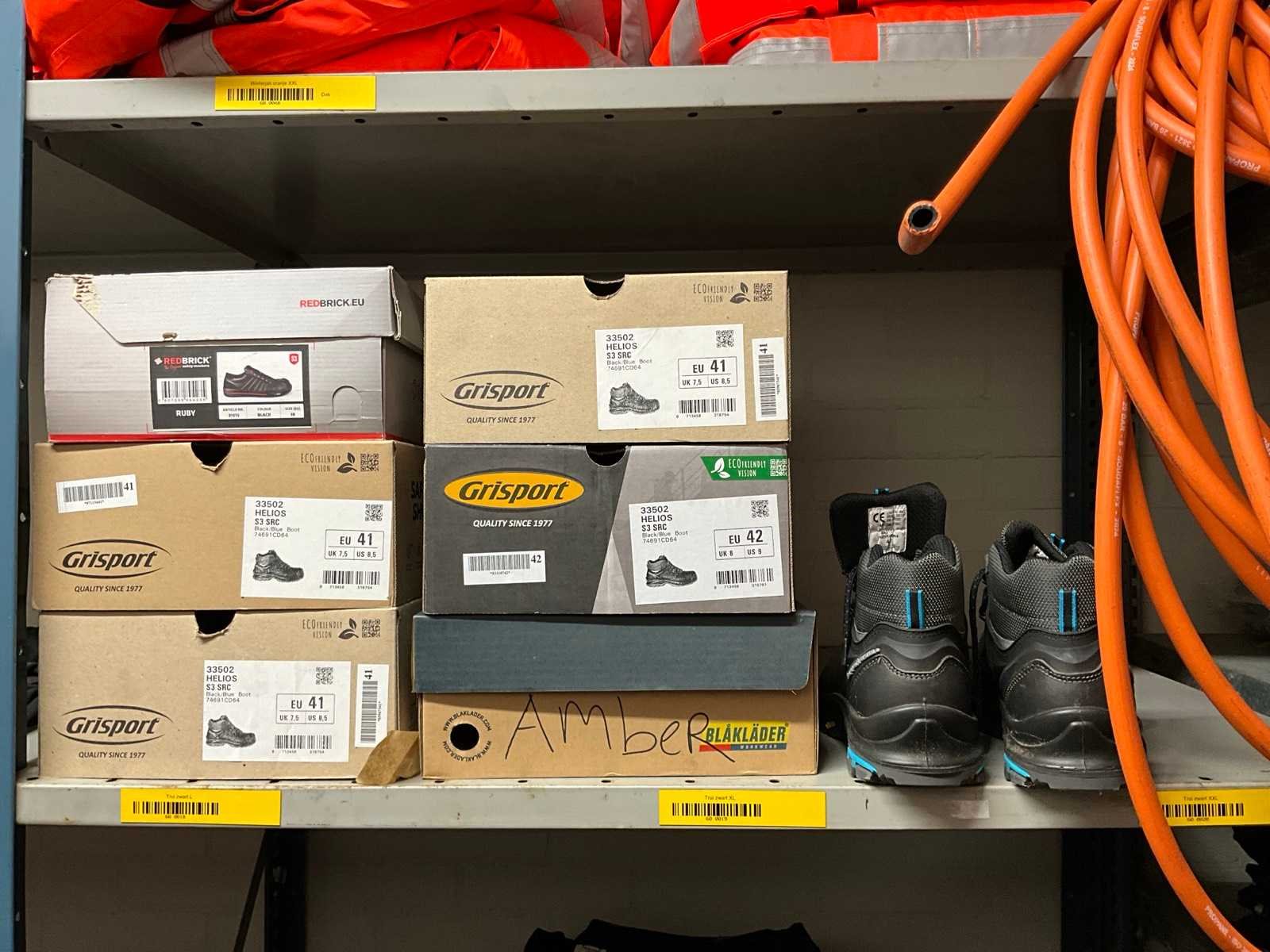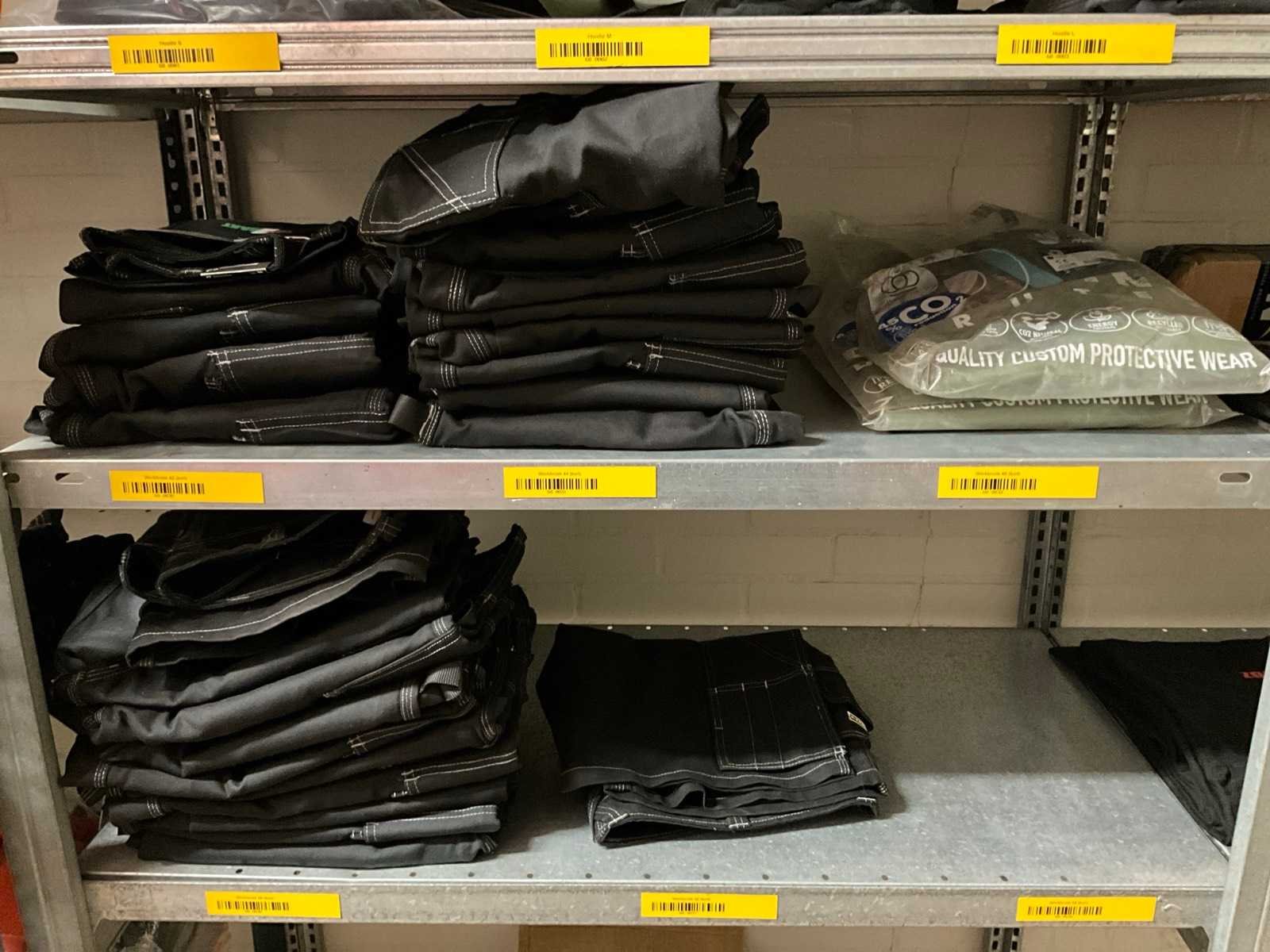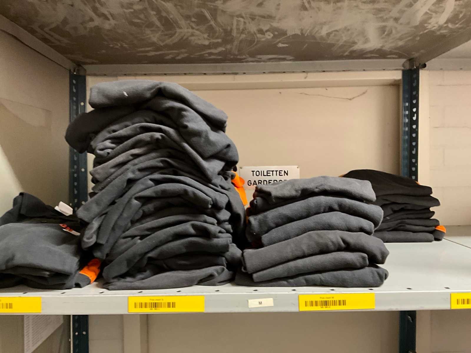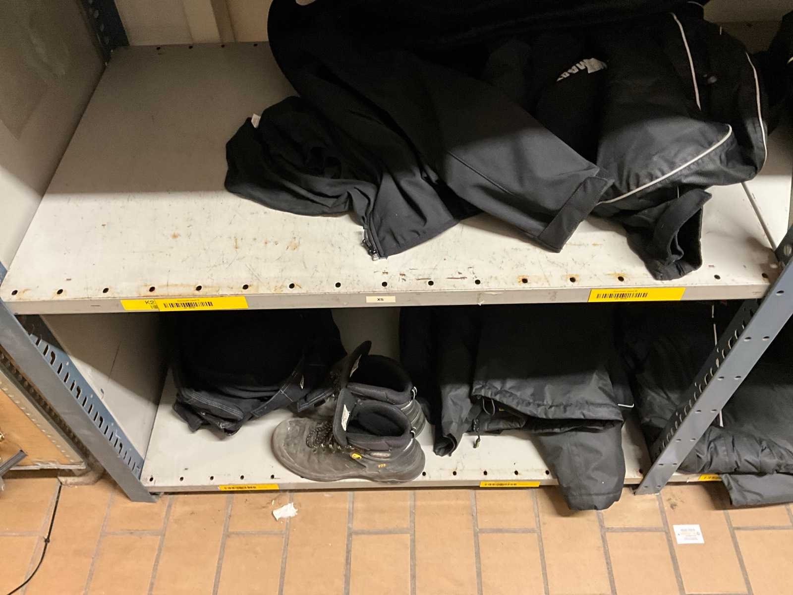 Inhoud van 5 secties legbordstelling; bestaande uit onder andere: werkbroeken, shirts, winterjassen, werkschoenen, regenkleding, veiligheidshelmen. Inclusief 5 secties legbordstelling Nee