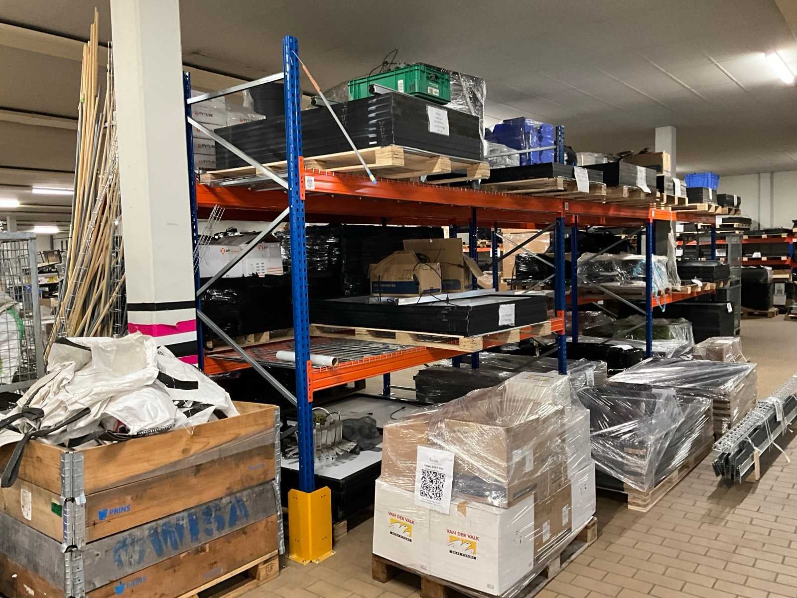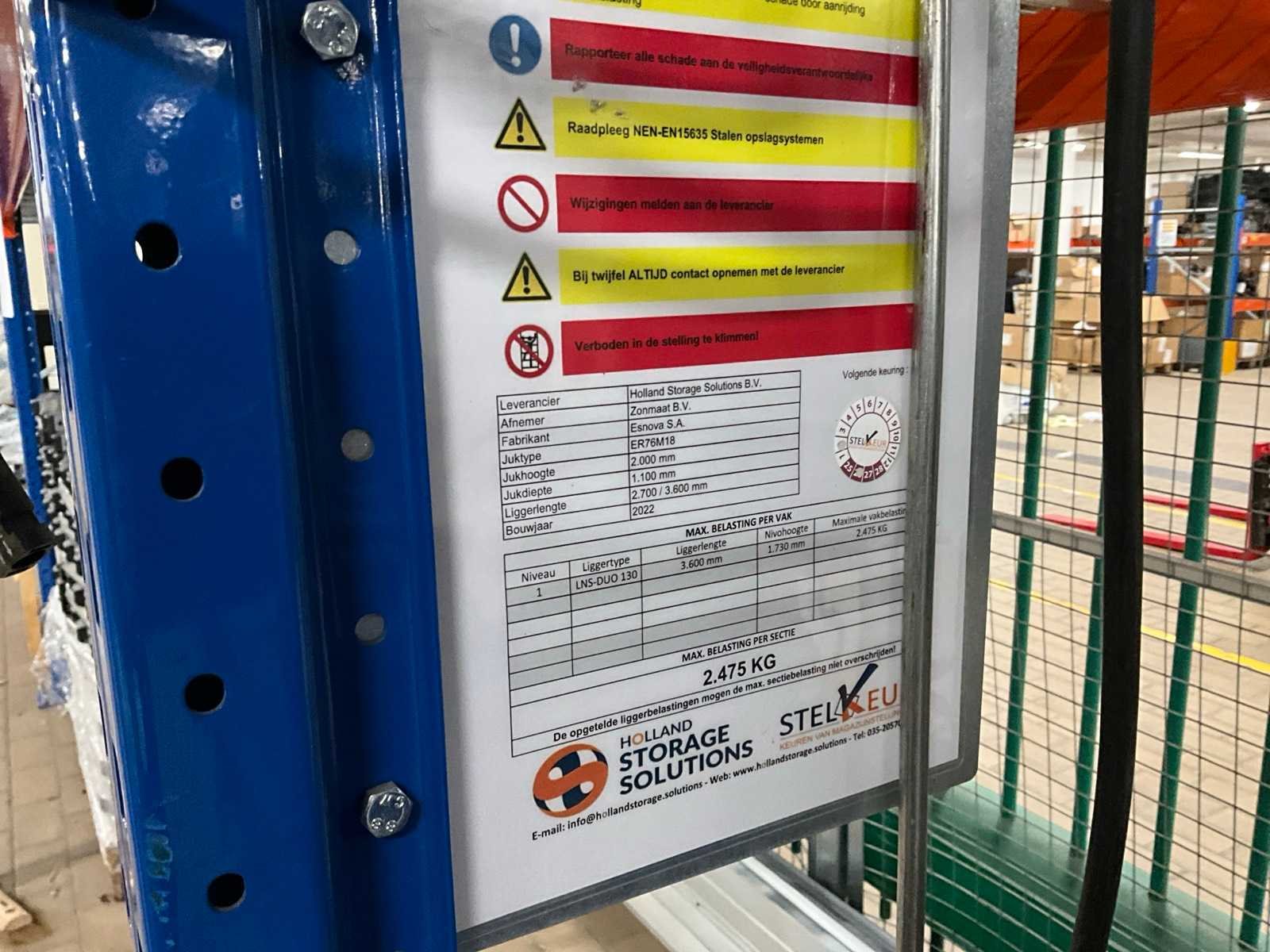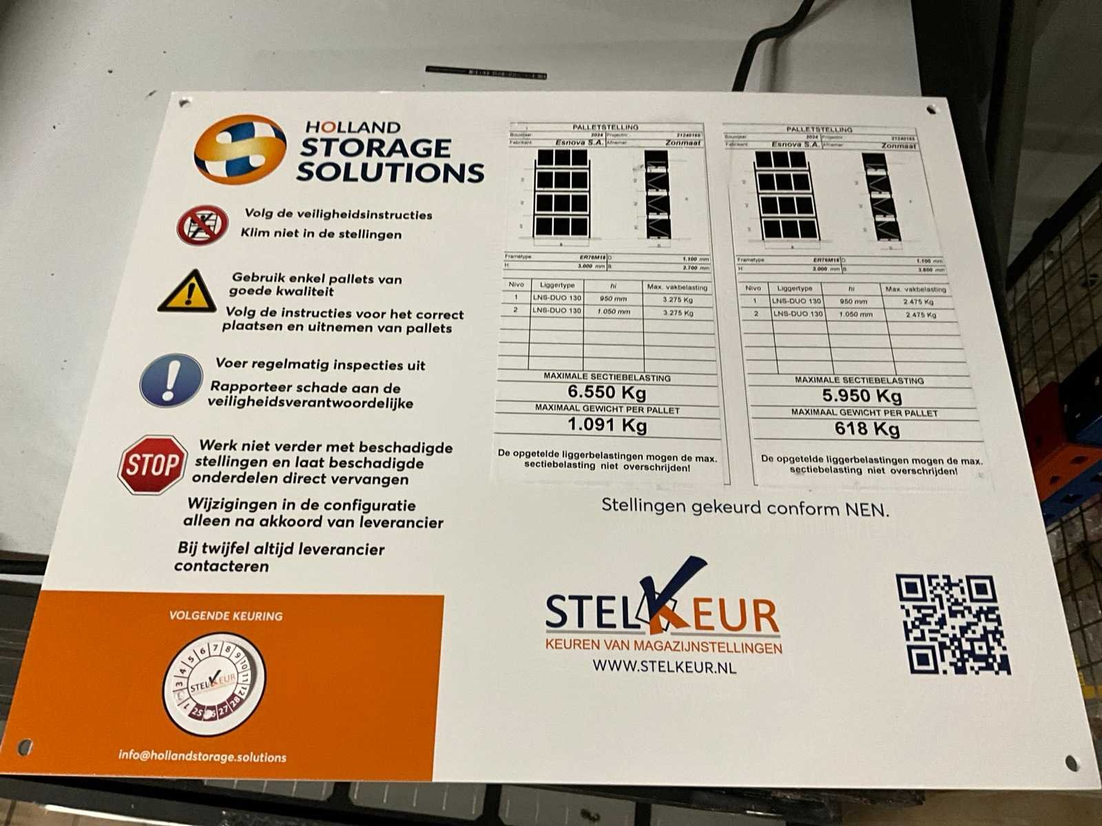 Hoge stelling: 2024 Esnova palletstelling (6 secties), 4 secties a 3600mm breed en 2 secties a 2700mm breed, 8x ER76M18 staander H3000mm en diep 1100mm belasting circa 6000kg per sectie; Lage stelling: 2022 Esnova palletstelling (16 secties), 15 secties a 3600mm breed en 1 sectie a 2700mm breed; 28x Esnova ER76M18 staander 201cm hoog x 110cm; totaal 70x Esnova LNS-DUO 130 ligger 3600mm, 6x Esnova LNS-DUO 130 ligger 2700mm maximale belasting per sectie: 2475kg; inclusief diverse draadrooster legborden en diverse aanrijdbeveiliging Nee Merk: Esnova Bouwjaar: 2022 Aantal secties: 22 Sectie diepte: 1100mm Aantal staanders: 30 Aantal liggers: 76 Demontabel: true