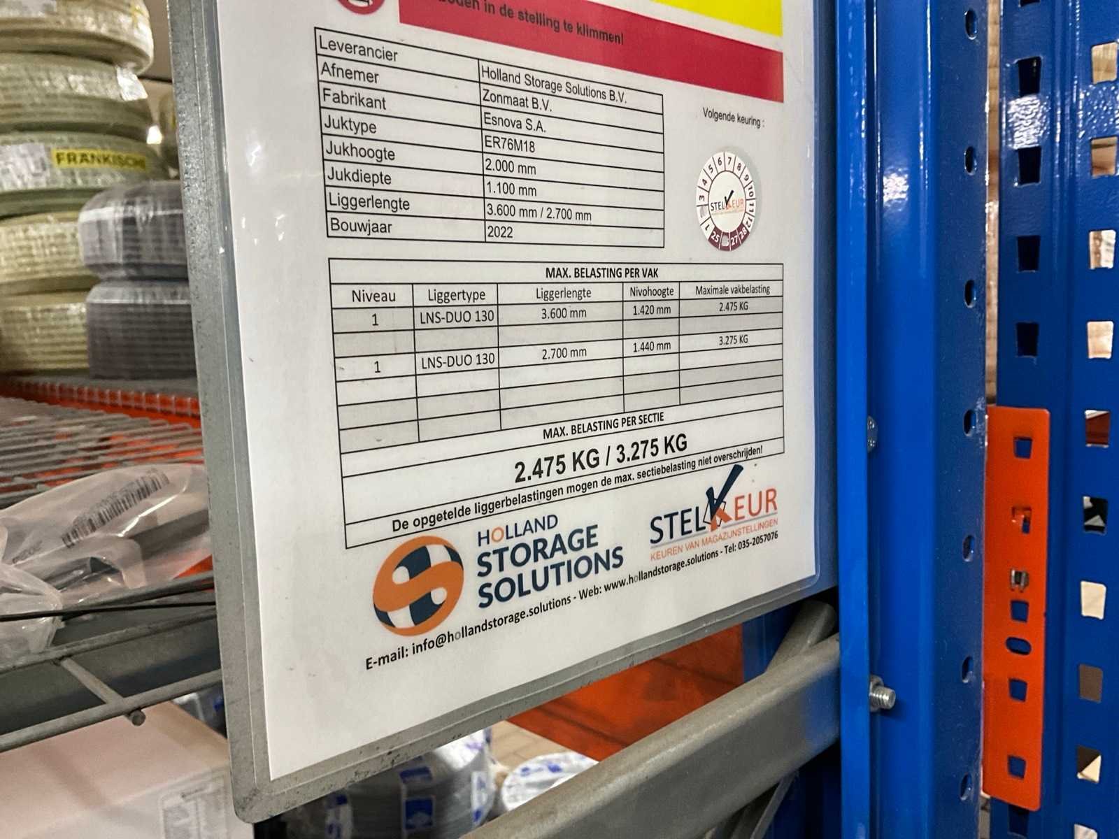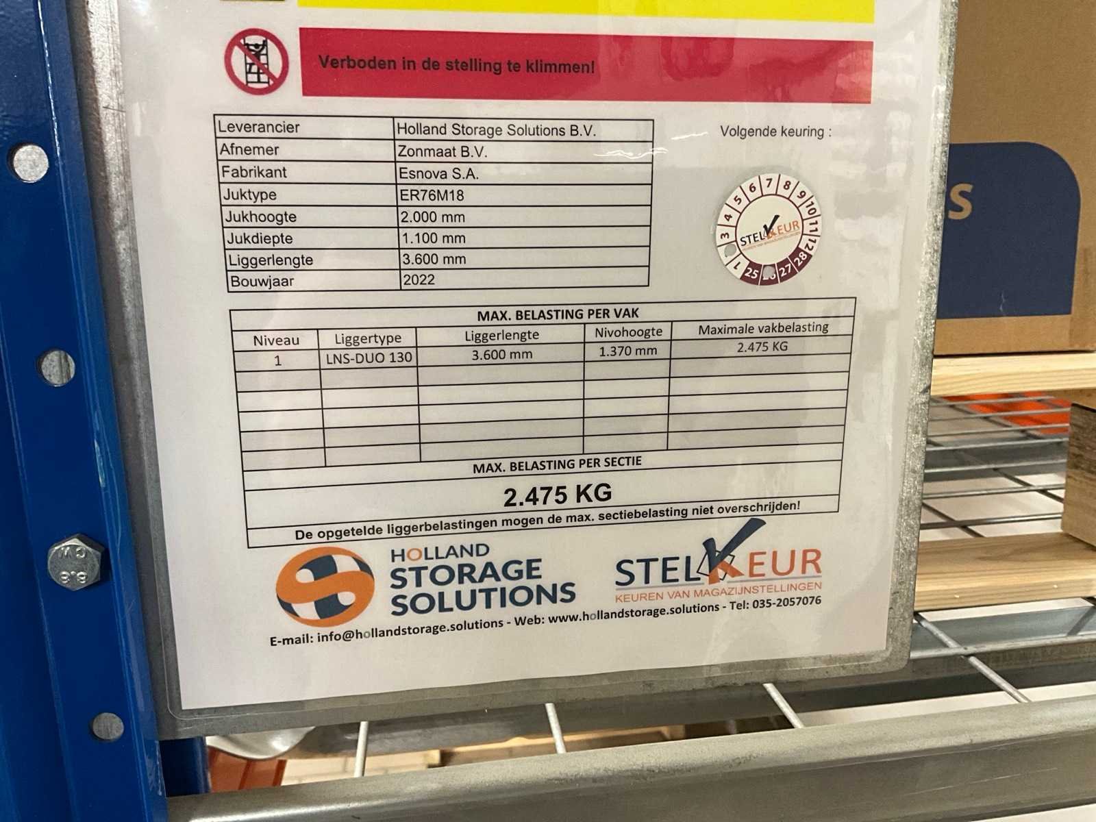 Bestaande uit 23x sectie a 3600mm en 3x sectie a 2700mm breed; bestaande uit: 36x Esnova ER76M18 staander 201cm hoog x 110cm diep; 50x Esnova LNS-DUO 130 ligger 3600mm, 6x Esnova LNS-DUO 130 ligger 2700mm maximale belasting per sectie: 2475kg; inclusief diverse draadrooster legborden en diverse aanrijdbeveiligingen Nee Merk: Esnova Bouwjaar: 2022 Aantal secties: 26 Sectie afm. b: 3600mm Sectie diepte: 1100mm Sectie afm. h: 2000mm Aantal staanders: 36 Aantal liggers: 56 Max. sectiebelasting: 2475kg Demontabel: true