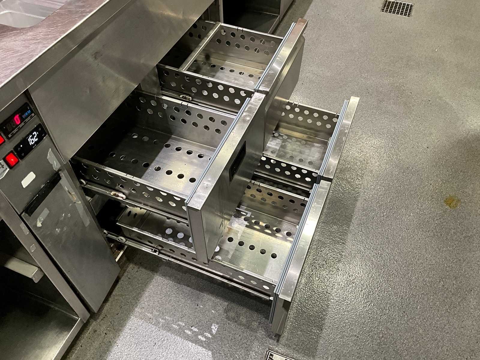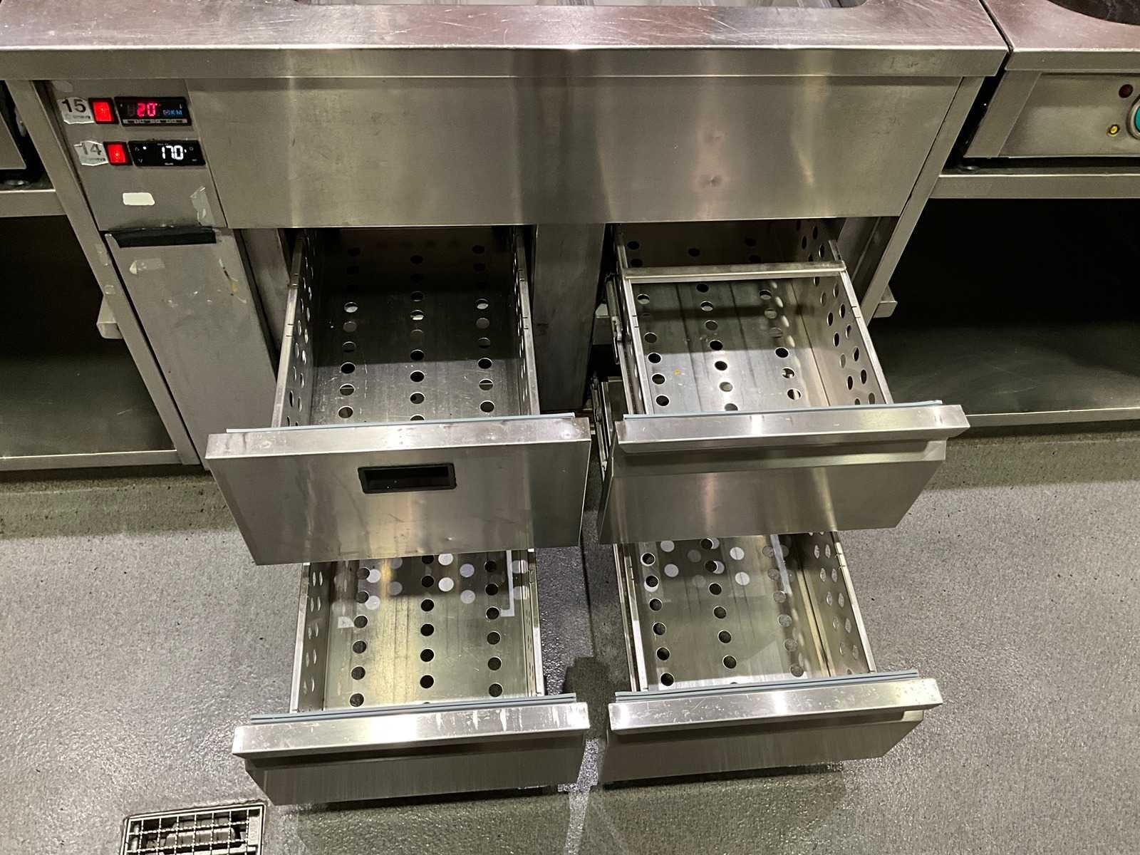 Koelwerkbanklijn met 2 saladettes en 10 gekoelde lades. LET OP! Pastakokers, inductiewokken en bakplaten behoren NIET tot de kavel. LET OP! Deze kavel maakt onderdeel uit van een combinatie kavel (kavelnummer 13) deze kavel blijft onder gunning totdat de combinatie kavel gesloten is. LET OP! Kavel betreft een apparaat wat aangesloten is op een centraal koelsysteem. Kavel heeft geen eigen koelcompressor. Het centrale koelsysteem is reeds professioneel leeg gepompt. Hiervoor zijn additionele kosten van toepassing. De koper is zelf verantwoordelijk voor het professioneel demonteren van de kavel. Kavel kan aangesloten zijn op het elektra-, water- en/of gasleidingnetwerk. Bekabeling en/of leidingen dienen netjes afgedopt en ordelijk achter gelaten te worden. Schade aan het pand of andere zaken zal op de koper worden verhaald. Wij adviseren u gebruik te maken van de kijkdag om een plan voor demontage op te stellen. Nee Merk: AKE-Ideal Digitale uitlezing: true Rvs: true Aantal laden: 10pcs Lengte: 630cm Breedte: 75cm Hoogte: 104cm