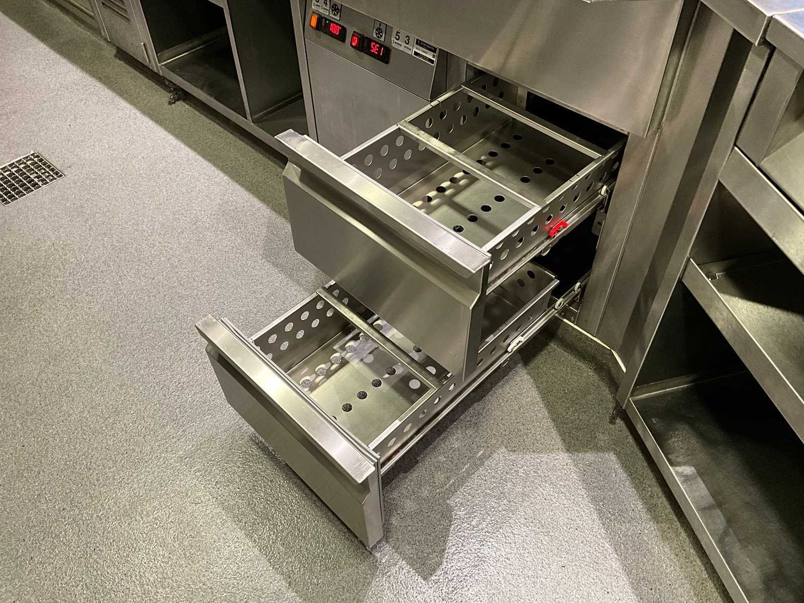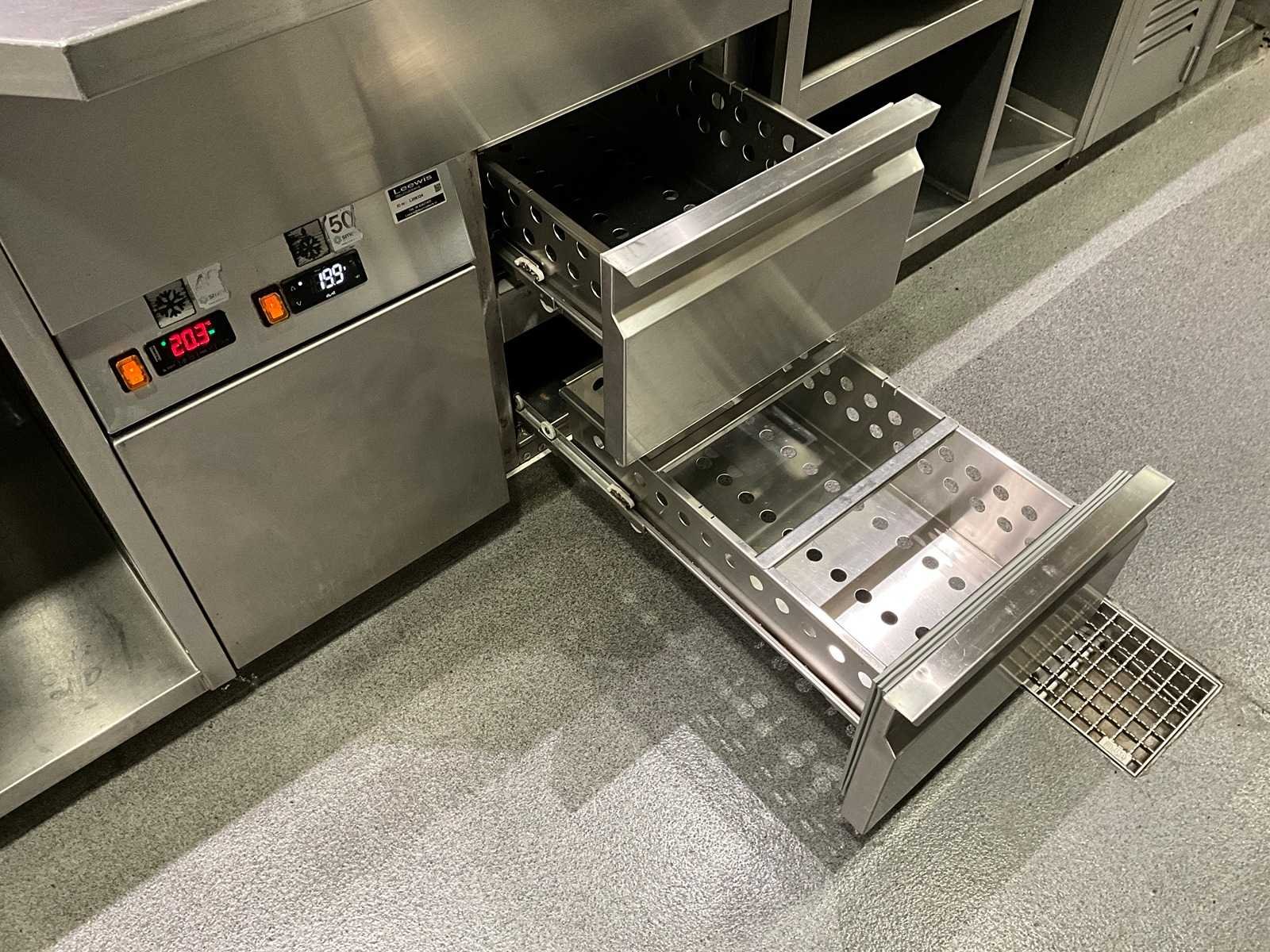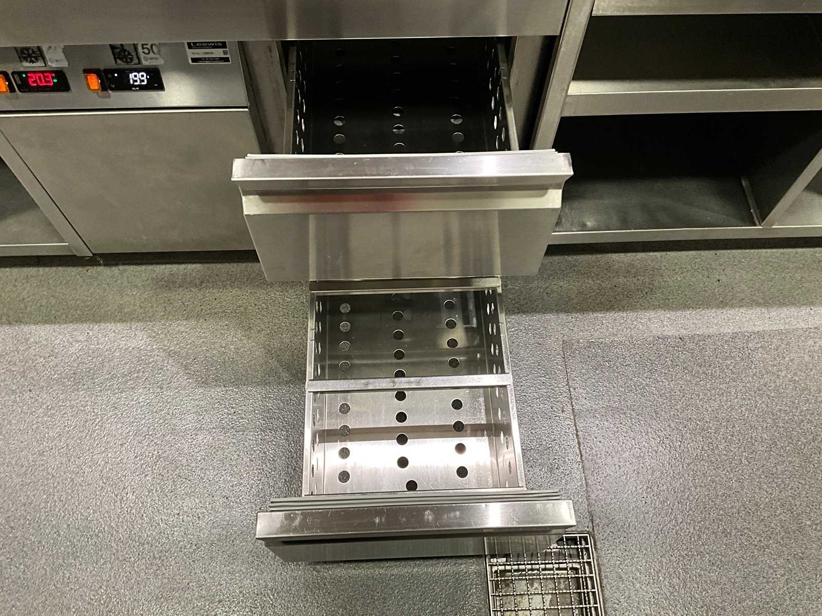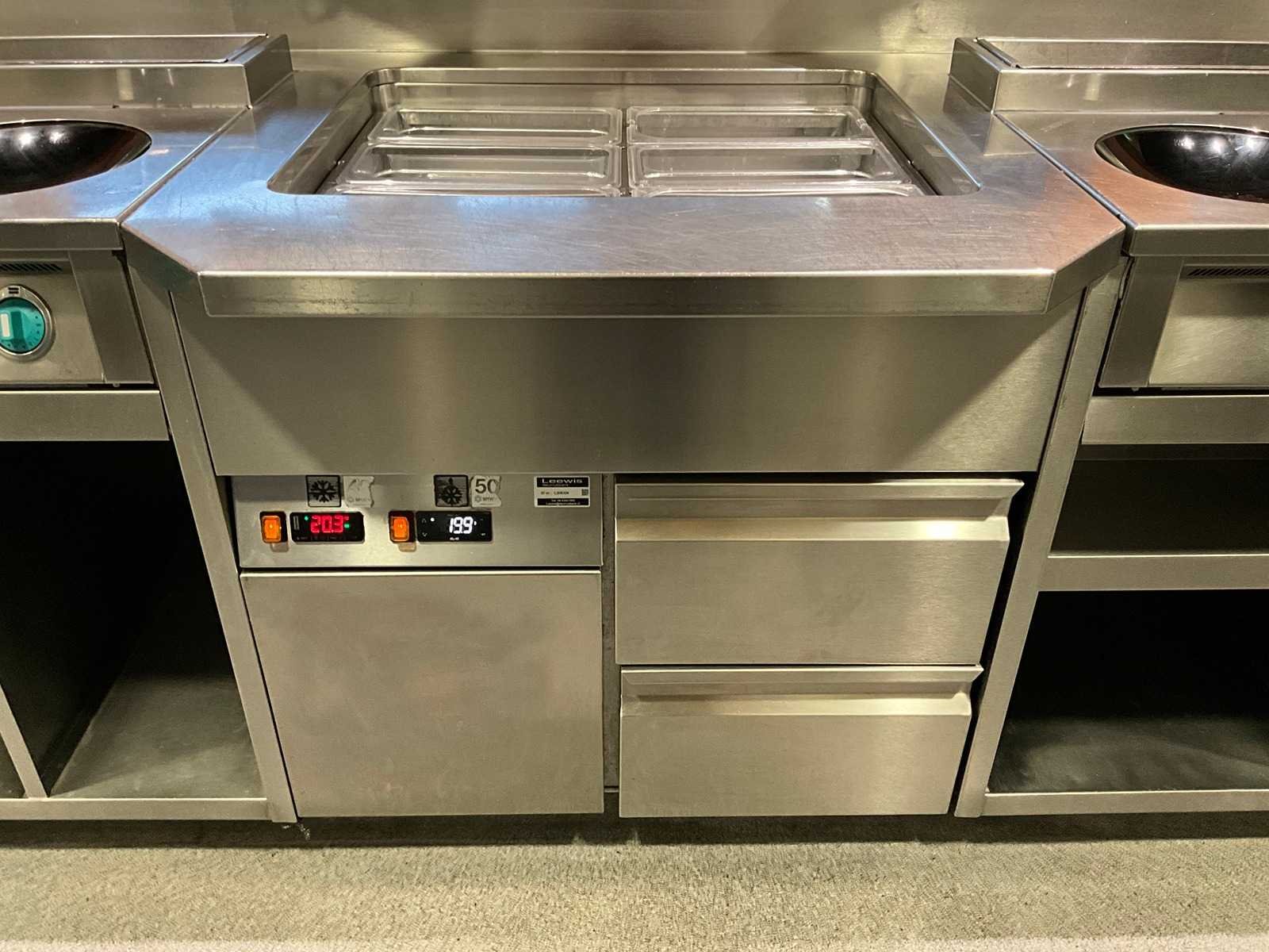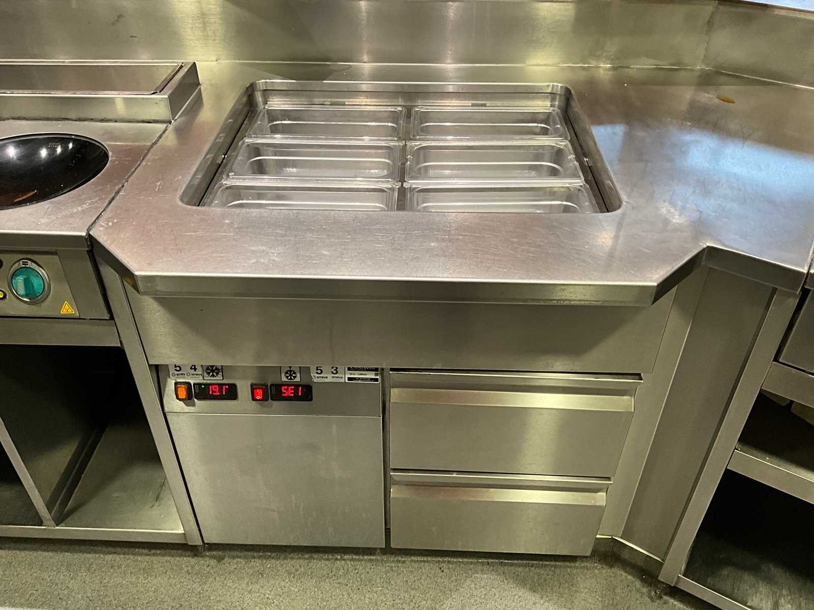 Koelwerkbanklijn met 2 saladettes en 4 gekoelde lades. LET OP! Pastakokers, inductiewokken en bakplaten behoren NIET tot de kavel. LET OP! Deze kavel maakt onderdeel uit van een combinatie kavel (kavelnummer 25) deze kavel blijft onder gunning totdat de combinatie kavel gesloten is. LET OP! Kavel betreft een apparaat wat aangesloten is op een centraal koelsysteem. Kavel heeft geen eigen koelcompressor. Het centrale koelsysteem is reeds professioneel leeg gepompt. Hiervoor zijn additionele kosten van toepassing. De koper is zelf verantwoordelijk voor het professioneel demonteren van de kavel. Kavel kan aangesloten zijn op het elektra-, water- en/of gasleidingnetwerk. Bekabeling en/of leidingen dienen netjes afgedopt en ordelijk achter gelaten te worden. Schade aan het pand of andere zaken zal op de koper worden verhaald. Wij adviseren u gebruik te maken van de kijkdag om een plan voor demontage op te stellen. Nee Merk: AKE-Ideal Digitale uitlezing: true Rvs: true Aantal laden: 10pcs Lengte: 8900cm