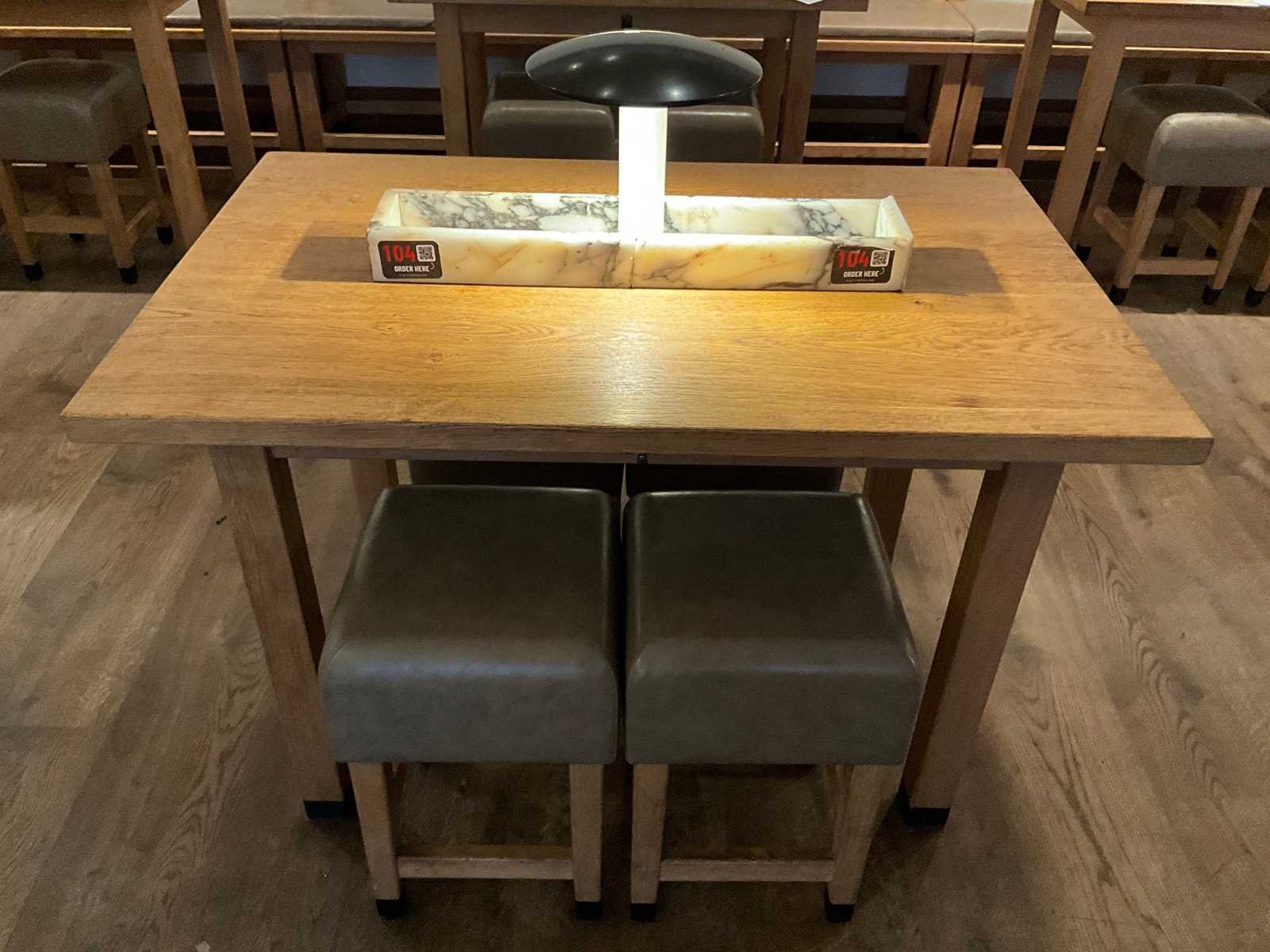 Halfhoge restauranttafel met marmeren opbouw en verlichting. Afmeting krukken: 37x37x57 cm. De tafel is reeds ontkoppeld van de vloer en elektra. Hiervoor zijn de additionele kosten van toepassing. Nee Merk: Hutten Totale afmeting L: 1250mm Totale afmeting Breedte: 800mm Totale afmeting Hoogte: 870mm Hout: true