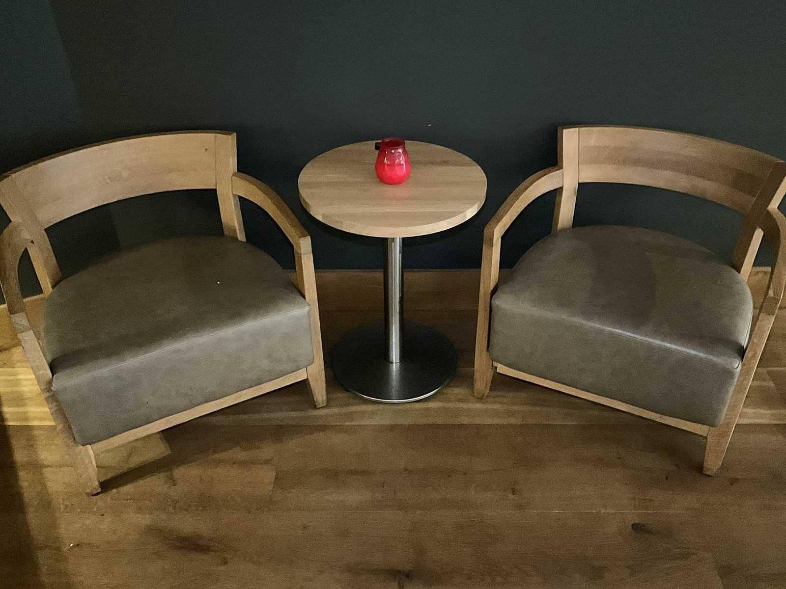 Afmeting tafel Ø 50 cm, hoogte 66 cm. Zithoogte stoelen: 40 cm. Nee Merk: Hutten Totale afmeting L: 69cm Totale afmeting Breedte: 65cm Totale afmeting Hoogte: 67cm Leder bekleed: true Hout: true