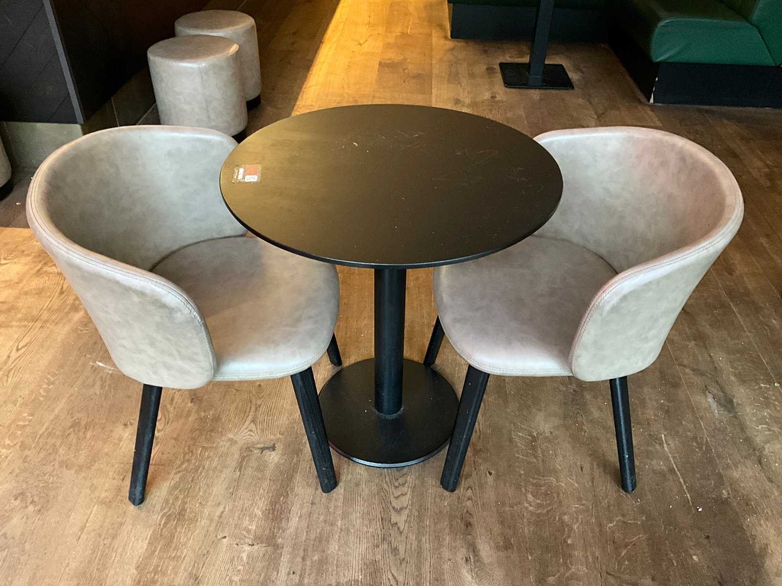 Afmeting tafel Ø 70 cm, hoogte 74 cm. Afmeting stoelen: 64x48x78 cm, zithoogte 45 cm. Nee Merk: Hutten