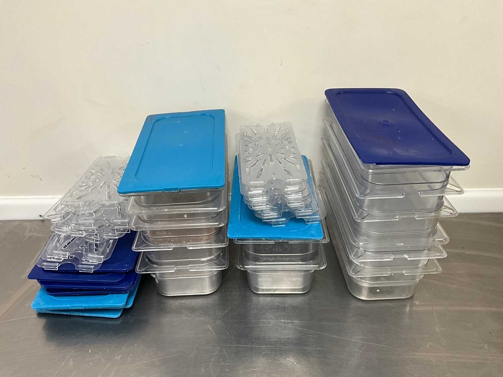 Partij betreft 12x bak, 18x deksel en 12x uitlekrooster. Nee Merk: Carlisle Type: GN 1/3