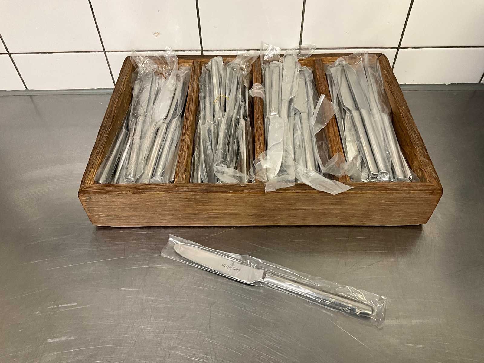 * Ongebruikt. Partij betreft ca. 100 stuks incl. houten bestekbak. Nee Merk: Picard & Wielpütz Totale afmeting L: 22cm