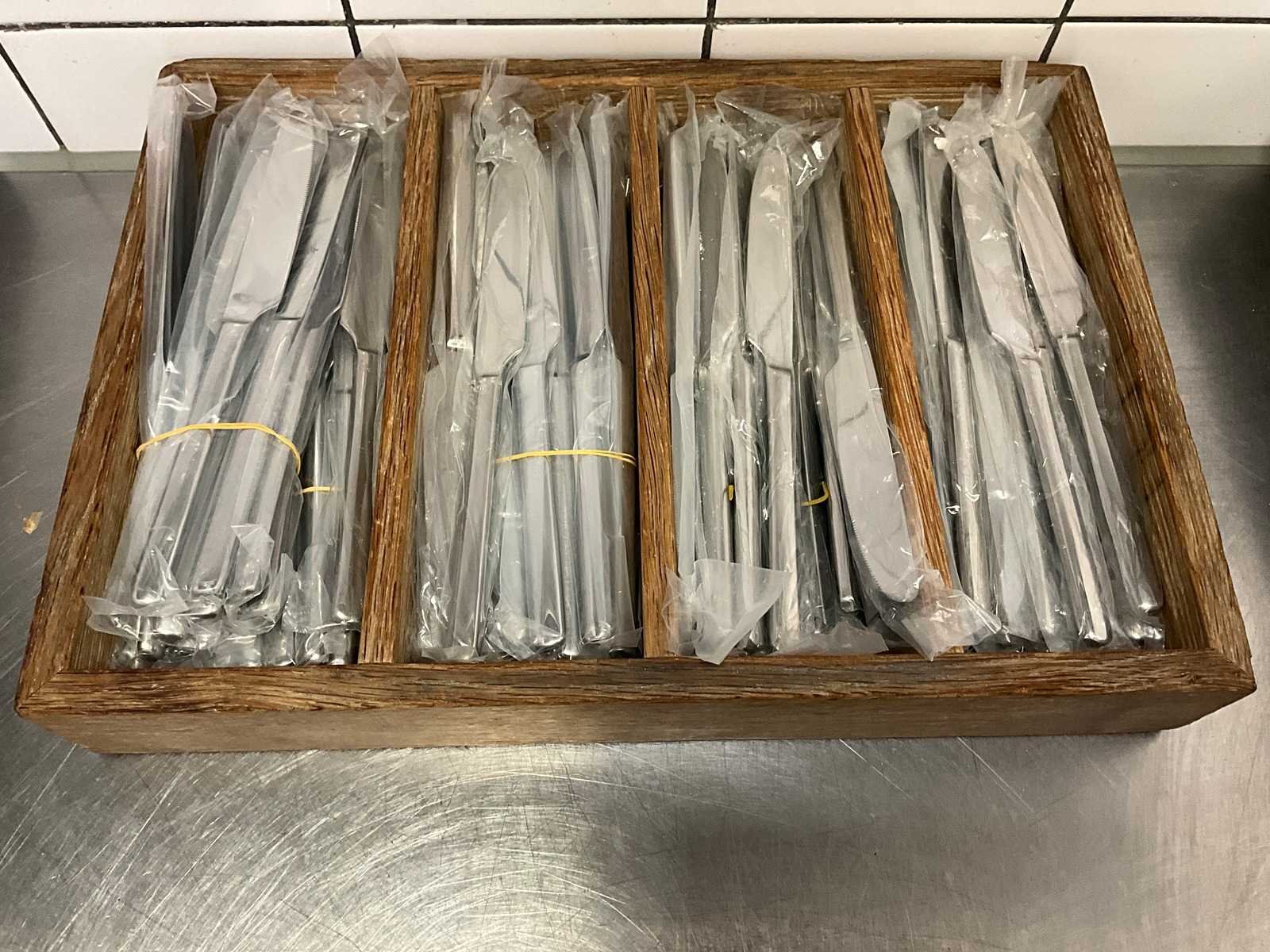 * Ongebruikt. Partij betreft ca. 100 stuks incl. houten bestekbak. Nee Merk: Picard & Wielpütz Totale afmeting L: 22cm