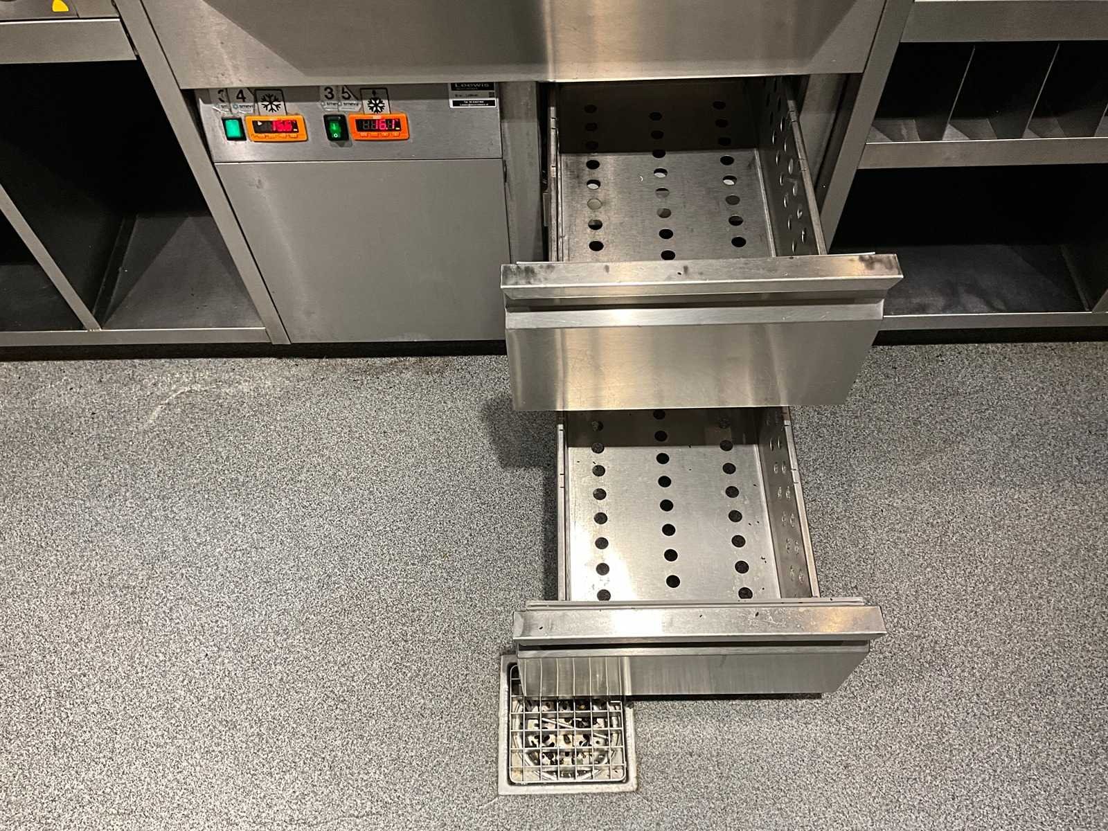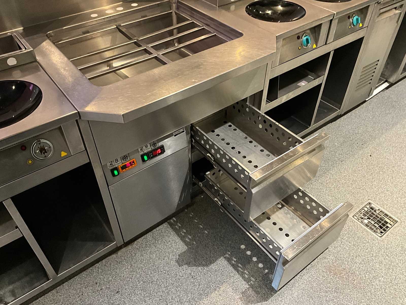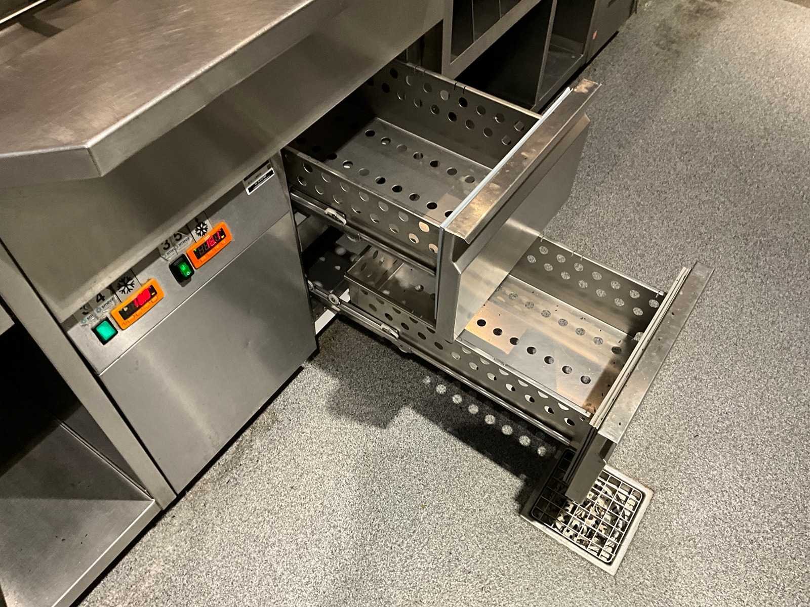 Koelwerkbanklijn met saladettes en gekoelde lades. LET OP! Pastakokers, inductiewokken en bakplaten behoren NIET tot de kavel. LET OP! Deze kavel maakt onderdeel uit van een combinatie kavel (kavelnummer 17) deze kavel blijft onder gunning totdat de combinatie kavel gesloten is. LET OP! Kavel betreft een apparaat wat aangesloten is op een centraal koelsysteem. Kavel heeft geen eigen koelcompressor. Het centrale koelsysteem is reeds professioneel leeg gepompt. Hiervoor zijn additionele kosten van toepassing. De koper is zelf verantwoordelijk voor het professioneel demonteren van de kavel. Kavel kan aangesloten zijn op het elektra-, water- en/of gasleidingnetwerk. Bekabeling en/of leidingen dienen netjes afgedopt en ordelijk achter gelaten te worden. Schade aan het pand of andere zaken zal op de koper worden verhaald. Wij adviseren u gebruik te maken van de kijkdag om een plan voor demontage op te stellen. Nee Merk: AKE-Ideal Digitale uitlezing: true Rvs: true Aantal laden: 10pcs Lengte: 630cm Breedte: 75cm Hoogte: 104cm