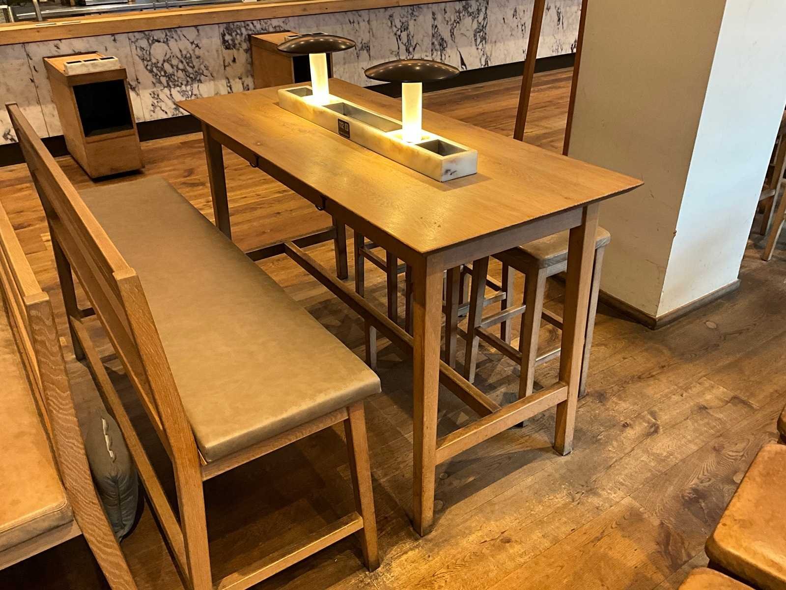 Bartafel met marmeren opbouw en verlichting. Afmeting bank: 180x50x112 cm, zithoogte 75 cm. Afmeting krukken 37x37x75 cm. De tafel is reeds ontkoppeld van de vloer en elektra. Hiervoor zijn de additionele kosten van toepassing. Nee Merk: Hutten Totale afmeting L: 1800mm Totale afmeting Breedte: 800mm Totale afmeting Hoogte: 1050mm Hout: true