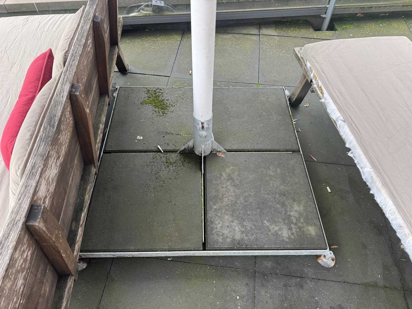 V.v. verlichting, inclusief voet met tegels. LET OP! 1 hoek hangt scheef. Kavel bevindt zich op het dakterras. De koper is zelf verantwoordelijk voor het professioneel demonteren van de kavel. Kavel kan aangesloten zijn op het elektra-, water- en/of gasleidingnetwerk. Bekabeling en/of leidingen dienen netjes afgedopt en ordelijk achter gelaten te worden. Schade aan het pand of andere zaken zal op de koper worden verhaald. Wij adviseren u gebruik te maken van de kijkdag om een plan voor demontage op te stellen. Nee Merk: Uhlmann Model: Giant 4x3 Vorm: Rechhoekig Parasolvoet: true Lengte: 300cm Breedte: 300cm
