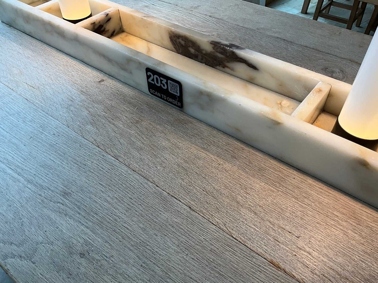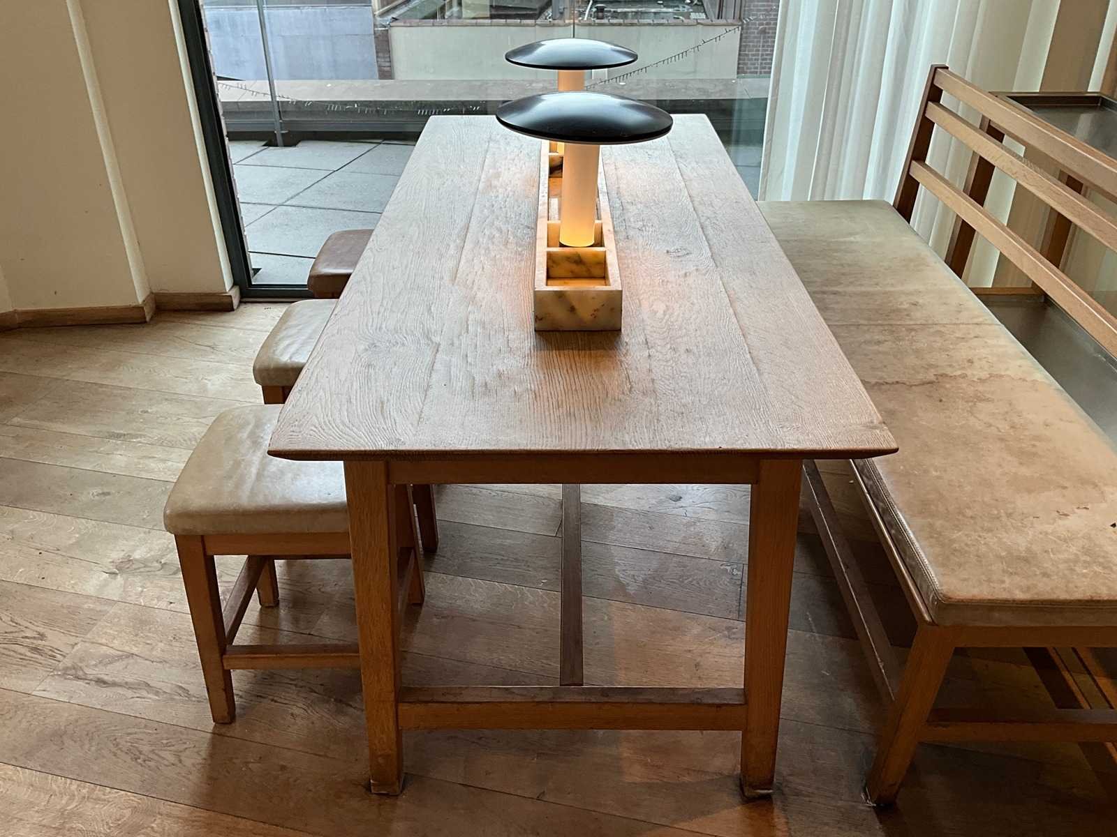 Restauranttafel met marmeren opbouw en verlichting. Afmeting bank: 180x50x90 cm. Zithoogte 50 cm. Afmeting krukken: 37x37x50 cm. De tafel is reeds ontkoppeld van de vloer en elektra. Hiervoor zijn de additionele kosten van toepassing. Nee Merk: Hutten Totale afmeting L: 1800mm Totale afmeting Breedte: 800mm Totale afmeting Hoogte: 760mm