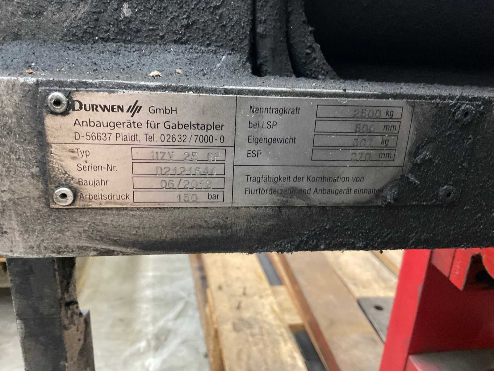 Maximale druk: 150 Bar, ESP 250mm. Lepellengte: 1600mm. Nee Merk: Durwen Type: UZV25CF Bouwjaar: 2012 Serienummer: D2123250 Eigen gewicht: 503kg