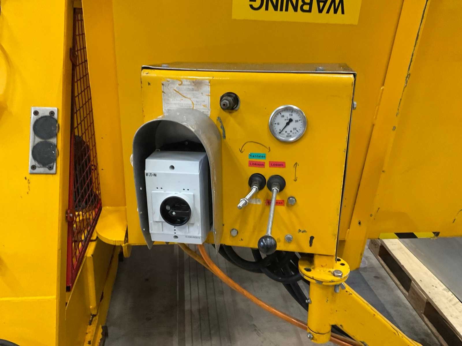 Serienummer: C06A3096, Maximale verlading: 2000kg, Vermogen: 4kW, Voltage: 400V Nee Merk: Premier Model: Pallet Inverter Kleur: Geel Lengte: 210cm Breedte: 200cm Hoogte: 290cm Materiaal: Staal