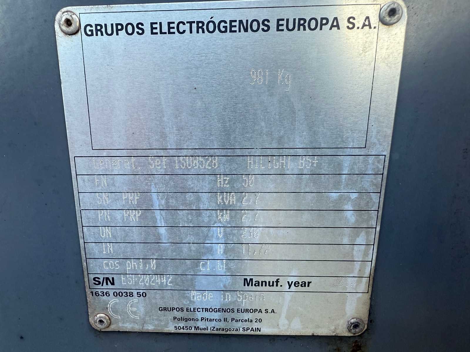 Atlas Copco HiLight B5+ 2.7 KVA / 1 Cilinder Hatz Engine Voltage 230 Hertz 50 Ampere 11.72 KVA 2.7 Werking: onbekend No Merk: Atlas Copco Type: HiLight B5+ Bouwjaar: 2016 LED: true Eigen gewicht: 981kg