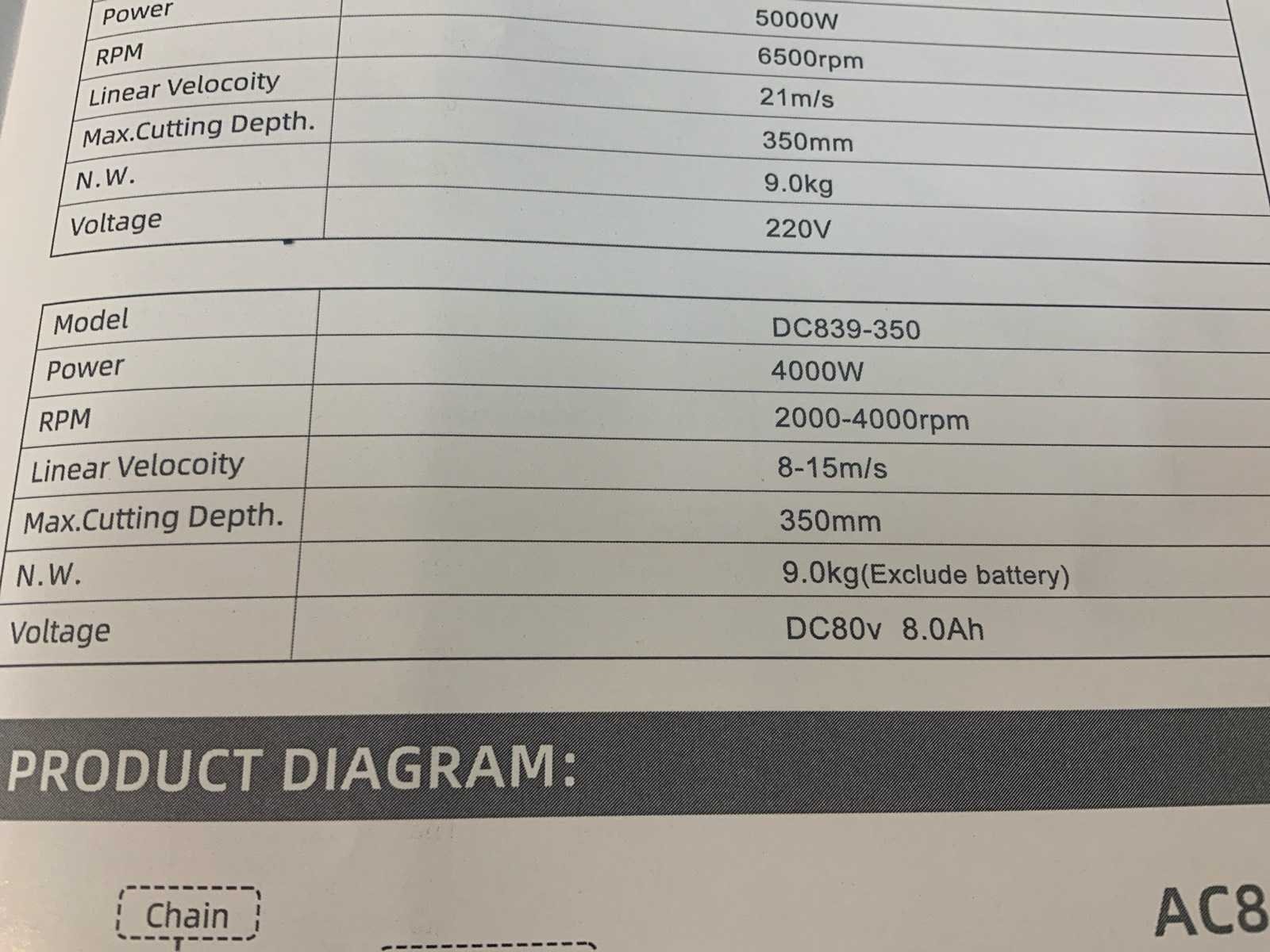 Incl. Waterpomp Power: 4000WATT RPM: 2000-4000RPM Max zaagdiepte: 350MM Accu: 80V 8.0AH Accu en acculader meegeleverd Nee Merk: Ultra Force Equipment Type: DC839 Bouwjaar: 2026 Eigen gewicht: 9kg Totale afmeting L: 770mm Totale afmeting Breedte: 290mm Totale afmeting Hoogte: 280mm