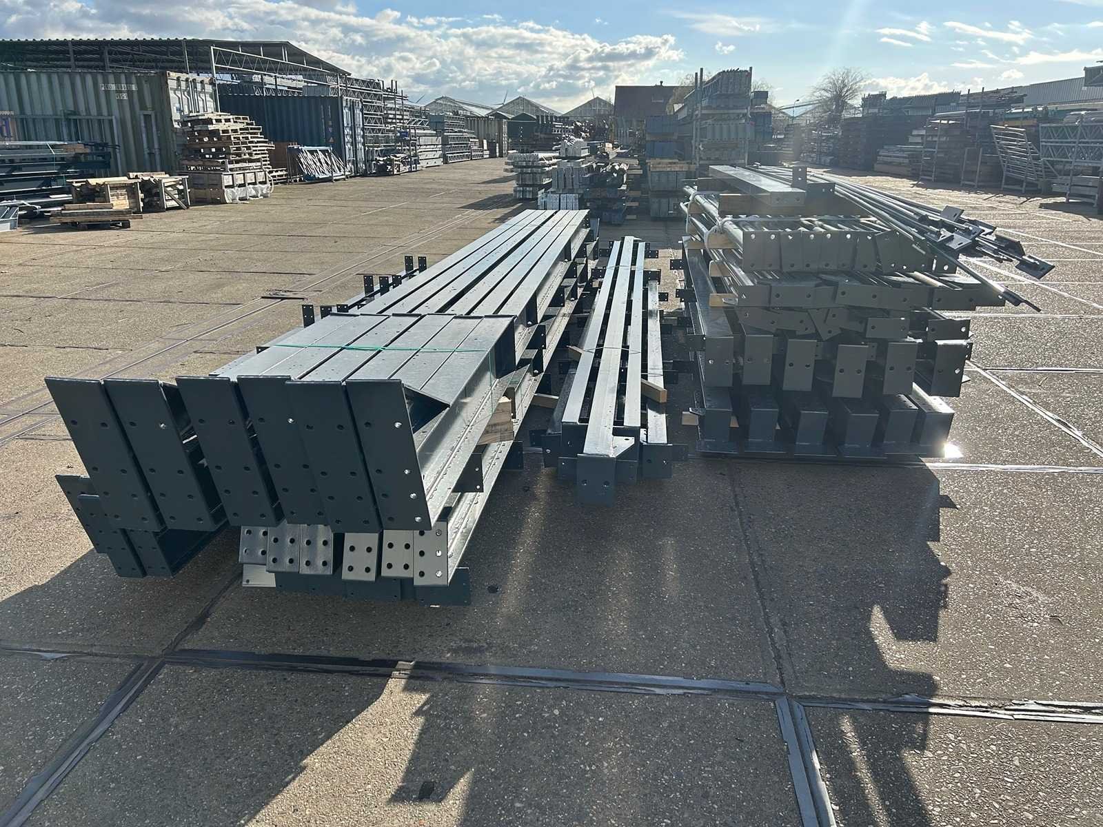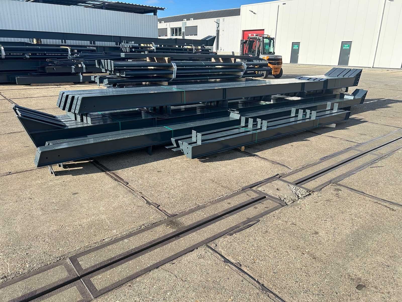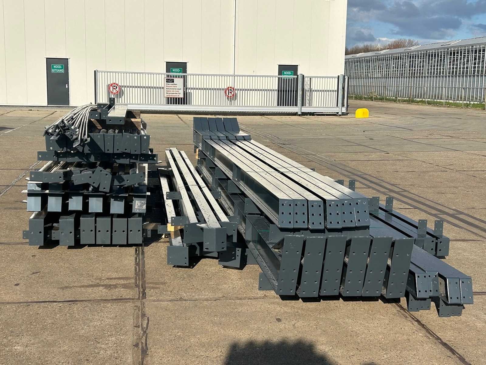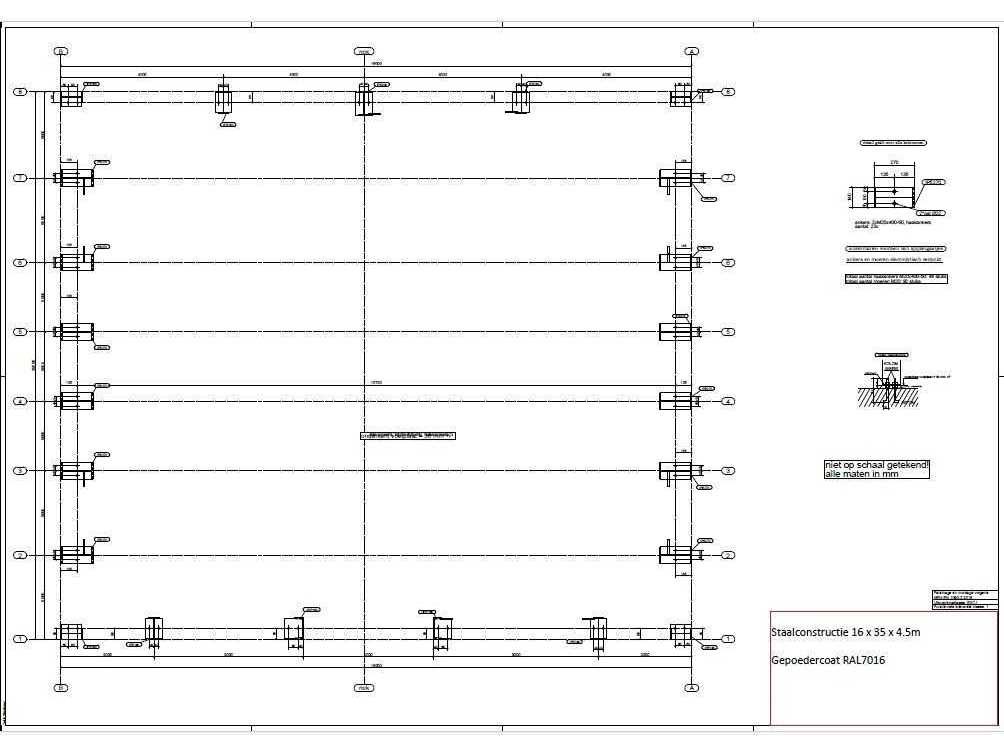 Nederlandse productie; vrije overspanning; spanten h.o.h. 5000mm; staalberekeningen; staaltekeningen; montagetekeningen; ankerplan; staal genummerd volgens montageplan; dakhelling 20 graden; 6 sets tussenspanten IPE 270/220; 2 sets eindspanten IPE 180 met windstijlen waarvan 1 set voorzien is van een deursparing; voorzien van drukkokers; windverbanden; gordinglippen; bouten en moeren; meestort ankers; staalconstructie volgens productnorm EN1090 (Certificaat na aankoop verkrijgbaar); kavel ligt netjes transportklaar en dient met 1 trailer opgehaald te worden; kavel wordt gratis met een heftruck geladen No Materiaal: gepoedercoat staal kleur antraciet Bouwjaar: 2025 Totaal oppervlakte: 560m² Nok hoogte: 7412mm Goot hoogte: 4500mm Totale afmeting L: 35000mm Totale afmeting Breedte: 16000mm