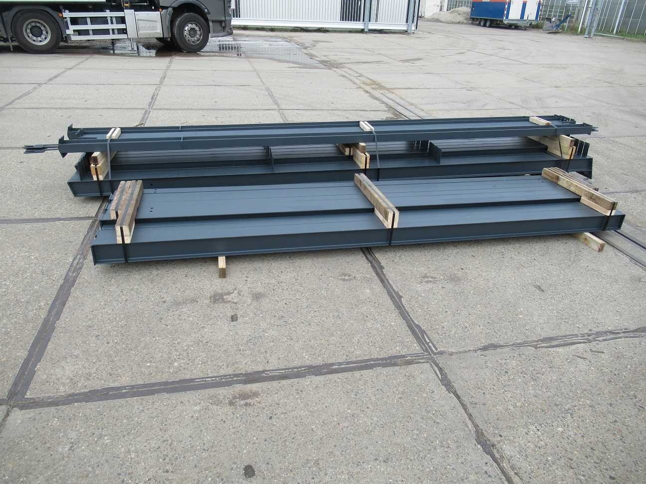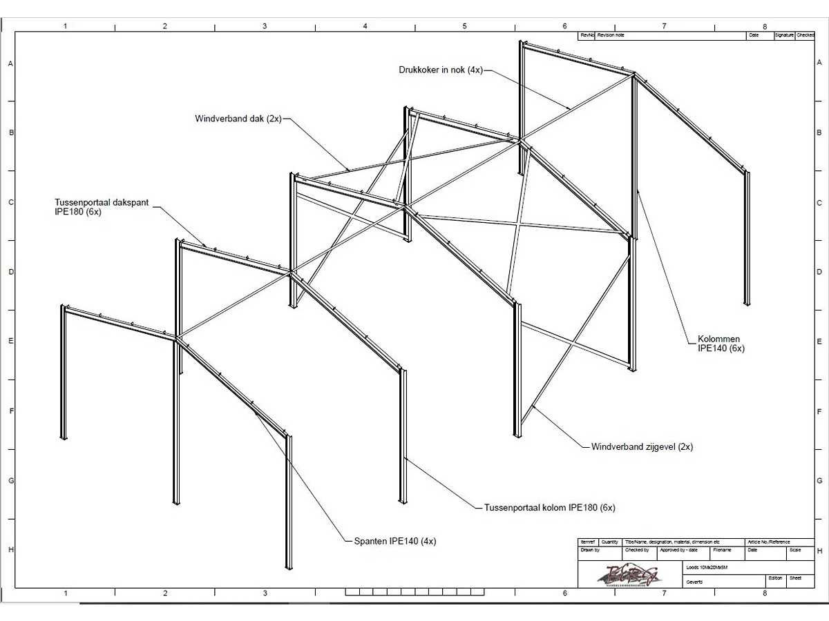 Vrije overspanning; spanten h.o.h. 5000mm; dakhelling 15 graden; 3 sets tussenspanten IPE180; 2 sets eindspanten met windstijlen IPE140; staaltekening; 3D-tekening; voorzien van drukkokers; windverbanden; gordinglippen op de spanten; kavel ligt netjes transportklaar en dient met 1 trailer opgehaald te worden; kavel wordt gratis met een heftruck geladen No Materiaal: Geschilderd staal kleur antraciet Totaal oppervlakte: 200m² Nok hoogte: 5350mm Goot hoogte: 4000mm Totale afmeting L: 20000mm Totale afmeting Breedte: 10000mm