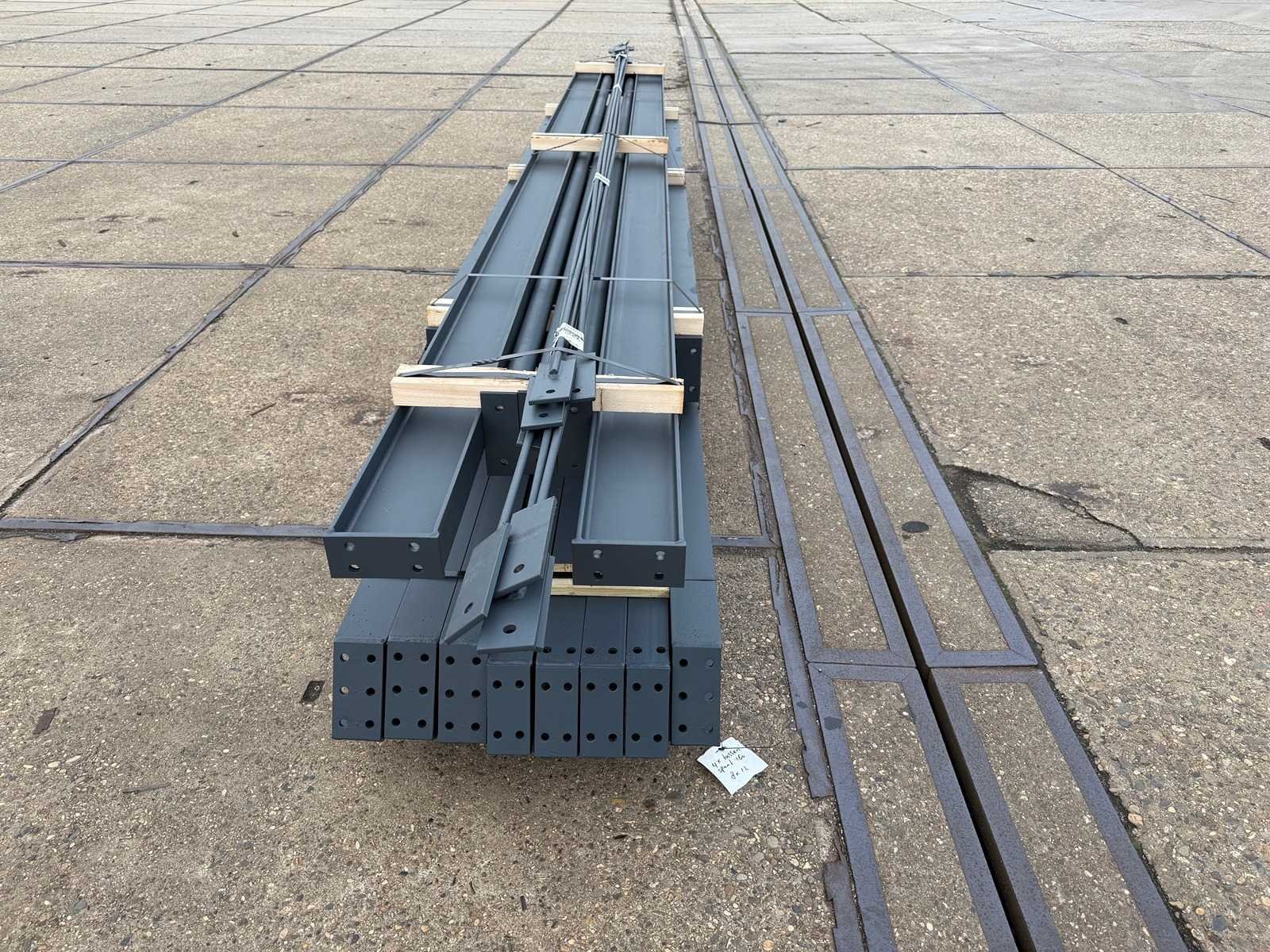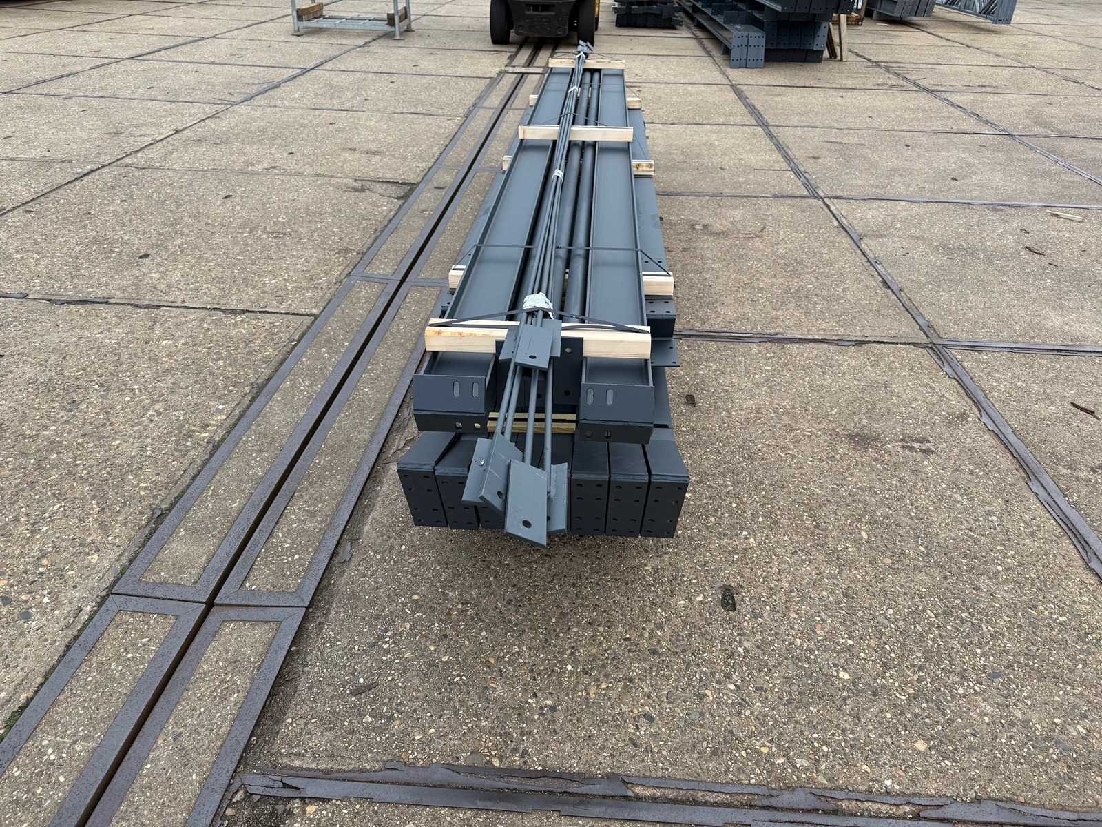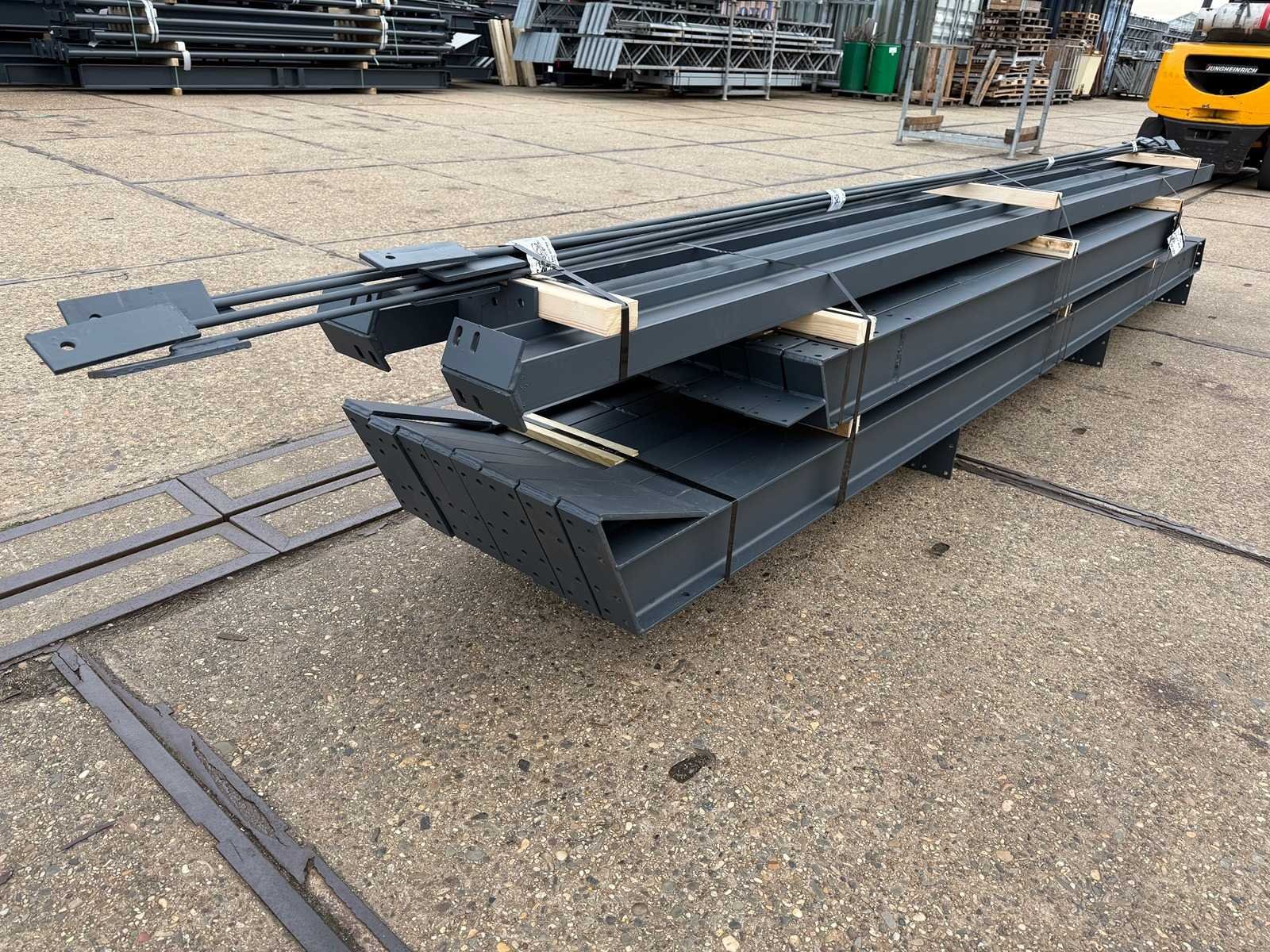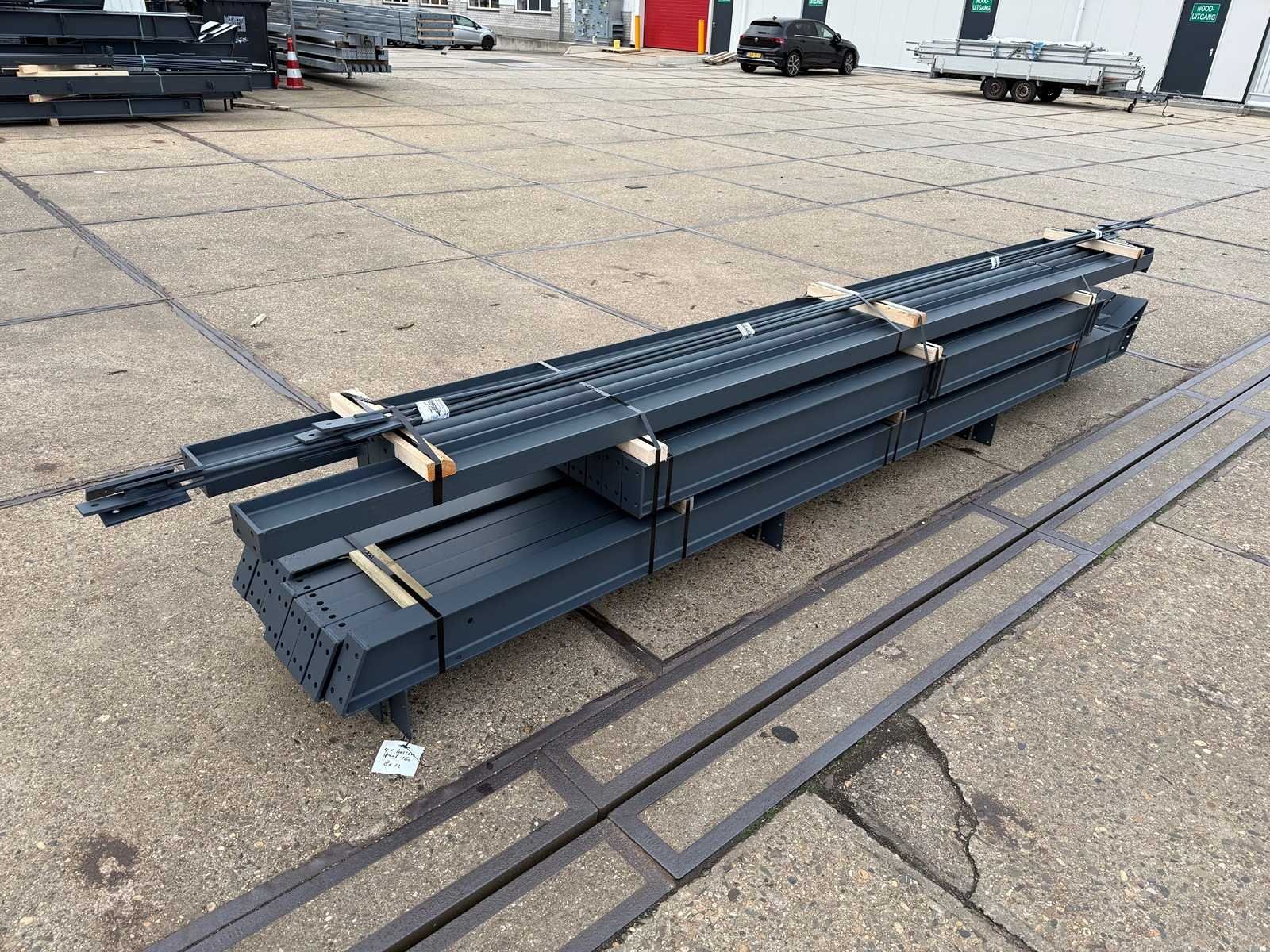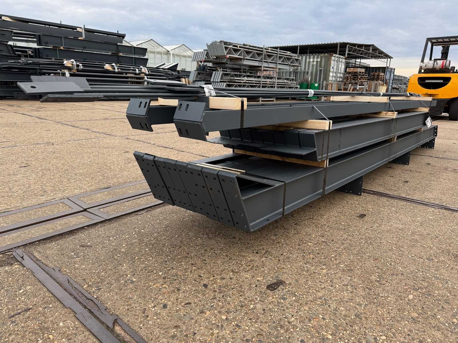Vrije overspanning; spanten h.o.h. 4000mm; dakhelling 25 graden; 2 sets tussenspanten IPE160; 2 sets kopgevelspanten IPE140 met windstijlen; voorzien van drukkokers; windverbanden; gordinglippen op de spanten; kavel ligt netjes transportklaar en dient met 1 trailer opgehaald te worden; kavel wordt gratis met een heftruck geladen No Materiaal: Geschilderd staal kleur antraciet Totaal oppervlakte: 96m² Nok hoogte: 4650mm Goot hoogte: 2800mm Totale afmeting L: 12000mm Totale afmeting Breedte: 8000mm