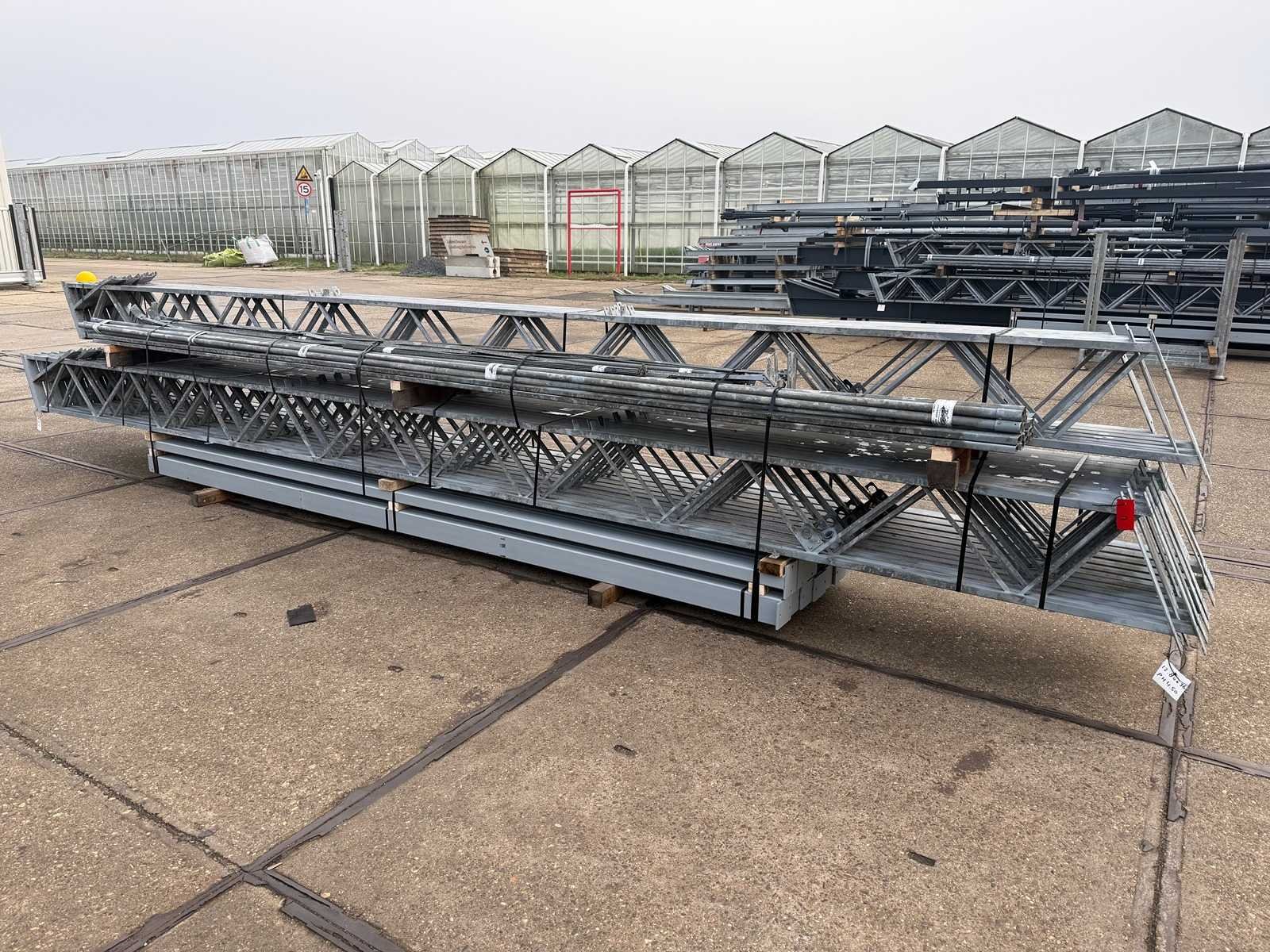 Overspanning trekstang tussen de spanten; spanten h.o.h. 4000mm; kokerprofiel als staanders en traliespanten; staaltekening; 3D-tekening; dakhelling 25 graden; 10 sets tussenspanten; voorzien van trekstangen met ophangstrips; windverbanden; kavel ligt netjes transportklaar en dient met 1 trailer opgehaald te worden; kavel wordt gratis met een heftruck geladen No Materiaal: gegalvaniseerd en geschilderd staal Totaal oppervlakte: 460m² Nok hoogte: 7000mm Goot hoogte: 4500mm Totale afmeting L: 36000mm Totale afmeting Breedte: 12800mm