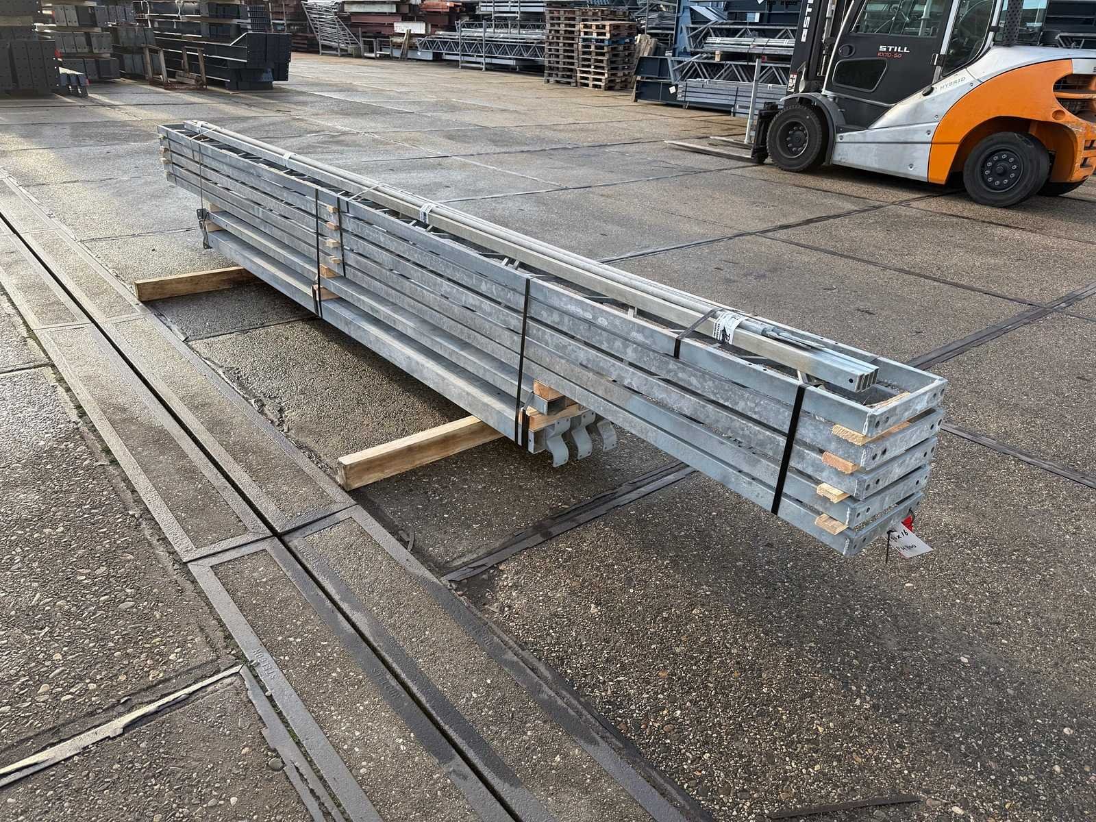 Platdak staalconstructie; vrije overspanning; spanten h.o.h. 4000mm; bestaande uit 5 sets tralieliggers met kokers als staanders; voorzien van windverbanden en kruisschoren; staalconstructie ligt netjes transportklaar en dient met 1 trailer opgehaald te worden; kavels wordt gratis met een heftruck geladen No Materiaal: Gegalvaniseerd staal Type: Platdak Totaal oppervlakte: 78m² Nok hoogte: 3000mm Goot hoogte: 3000mm Totale afmeting L: 16000mm Totale afmeting Breedte: 4900mm