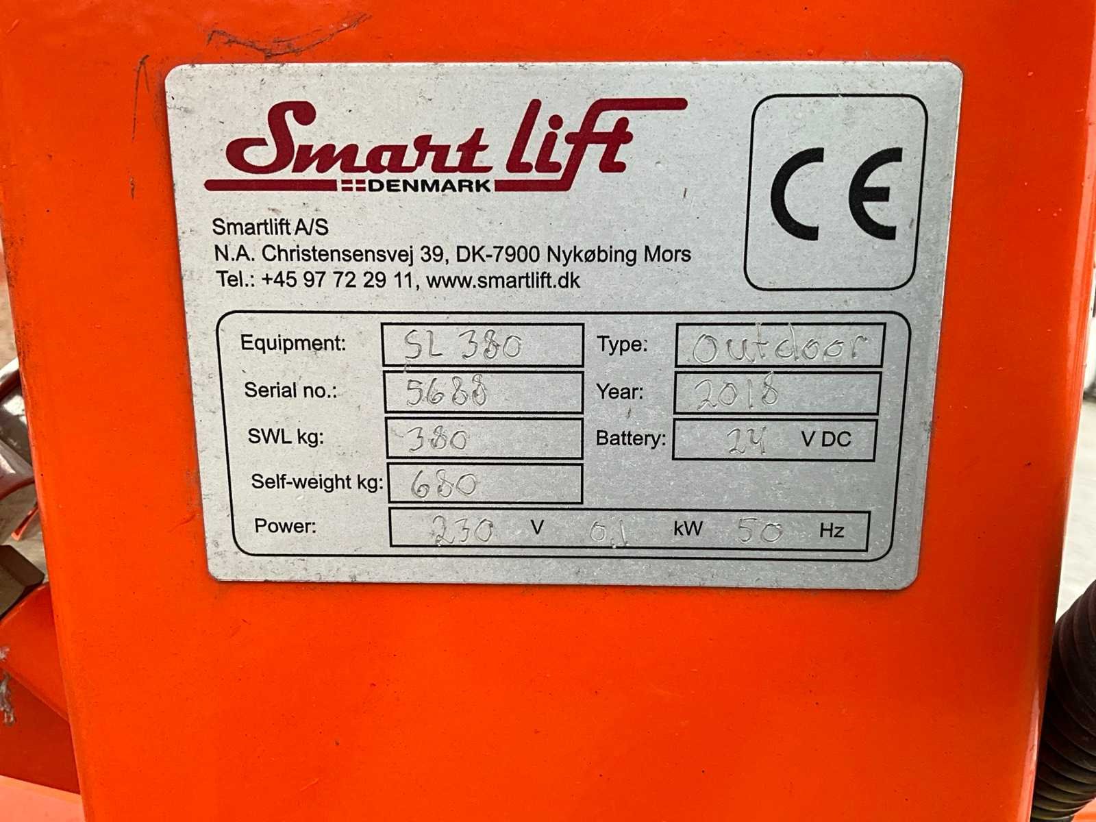 Liftbare telescopische / kantelbare arm; voorzien van 2 onafhankelijke vacuüm units; voorzien van 4 verstelbare zuignappen diameter 300 mm; 4 wielig; standaard voorzien van stabilisatoren; gebruik indoor en outdoor; acculader 230 Volt; draadbediening; afgelezen urenstand 2907 uur; working condition; Nee Merk: Smartlift Type: SL380 Bouwjaar: 2018 Hijsvermogen: 380kg Max. hefhoogte: 2900m Eigen gewicht: 700kg Totale afmeting L: 2200mm Totale afmeting Breedte: 850mm Totale afmeting Hoogte: 1350mm