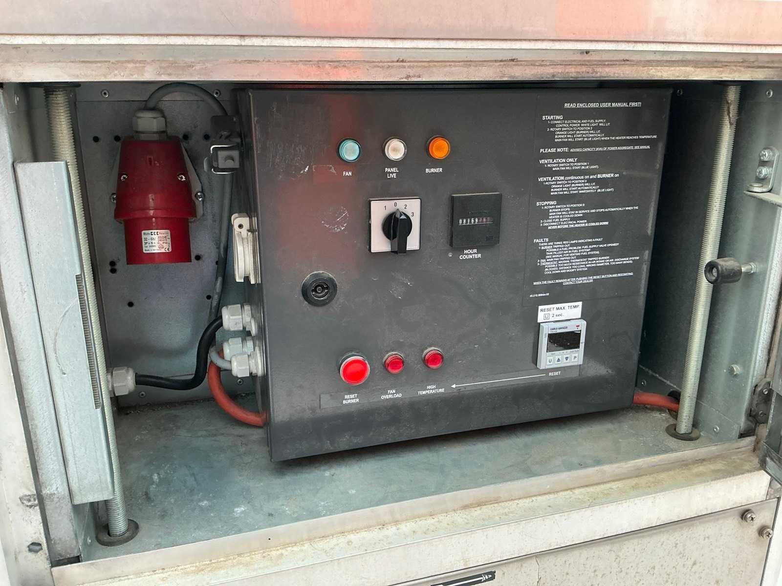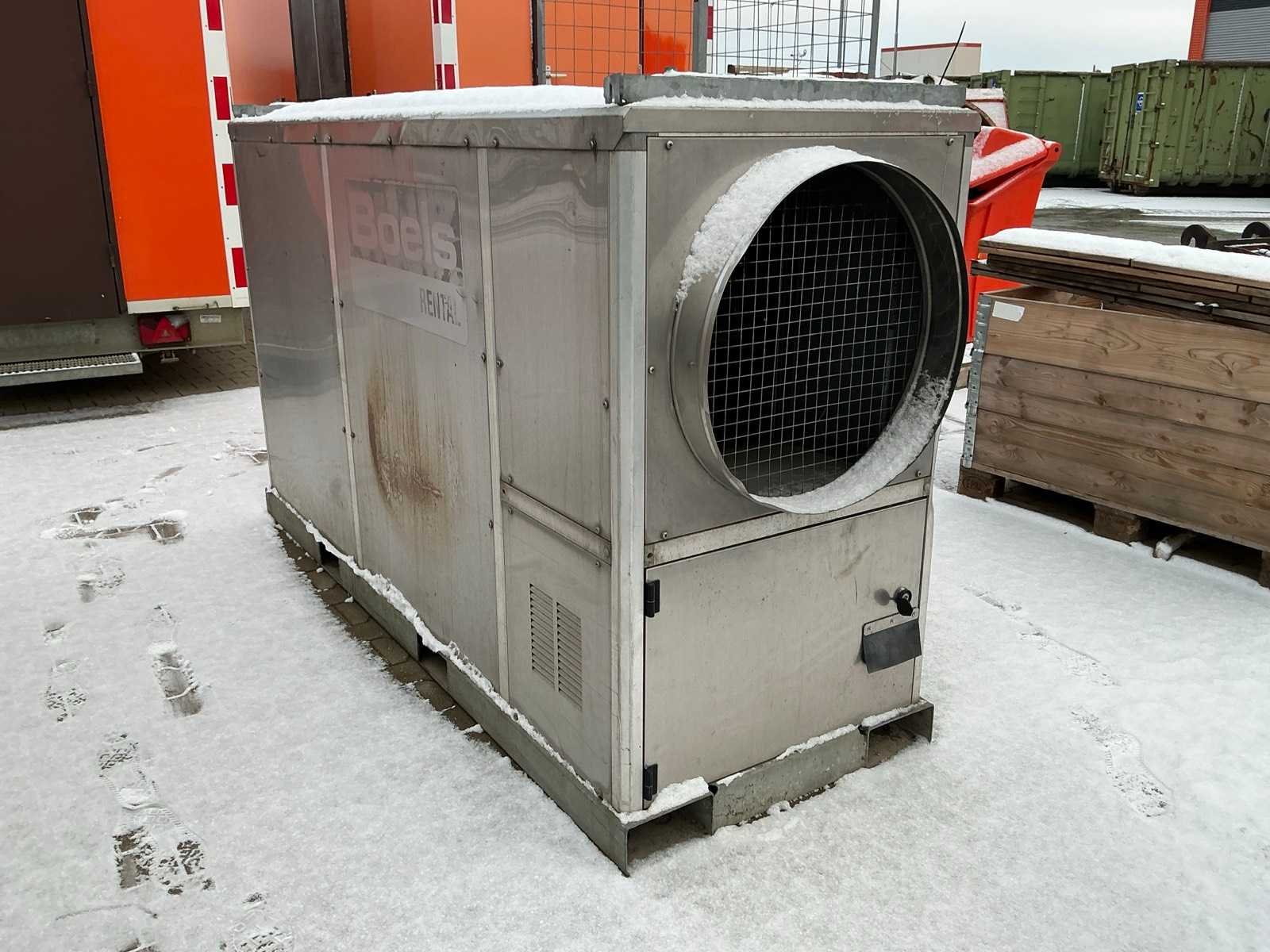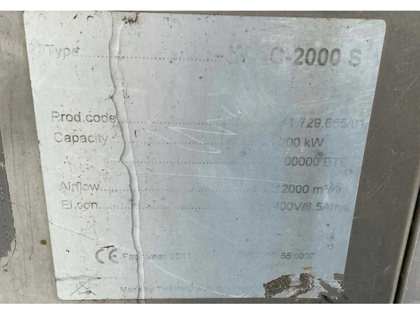 Verwarmen en ventileren; roestvast staal behuizing; demonteerbare zijpanelen; stookolie / diesel gestookt; aansluiting externe brandstoftank; volumestroom 12000 m3 / uur; lucht uitlaat diameter 550 mm; verbruik bij maximale belasting 20,9 liter / uur; afgelezen urenstand 8170 uur; hijsogen; onderslede voorzien van heftruck vorksleuven; working condition; Nee Merk: Thermobile Type: IMAC-2000 S Bouwjaar: 2011 Vermogen: 200kW Ventilator: true Eigen gewicht: 545kg Totale afmeting L: 2300mm Totale afmeting Breedte: 800mm Totale afmeting Hoogte: 1370mm Aansluiting: 400V