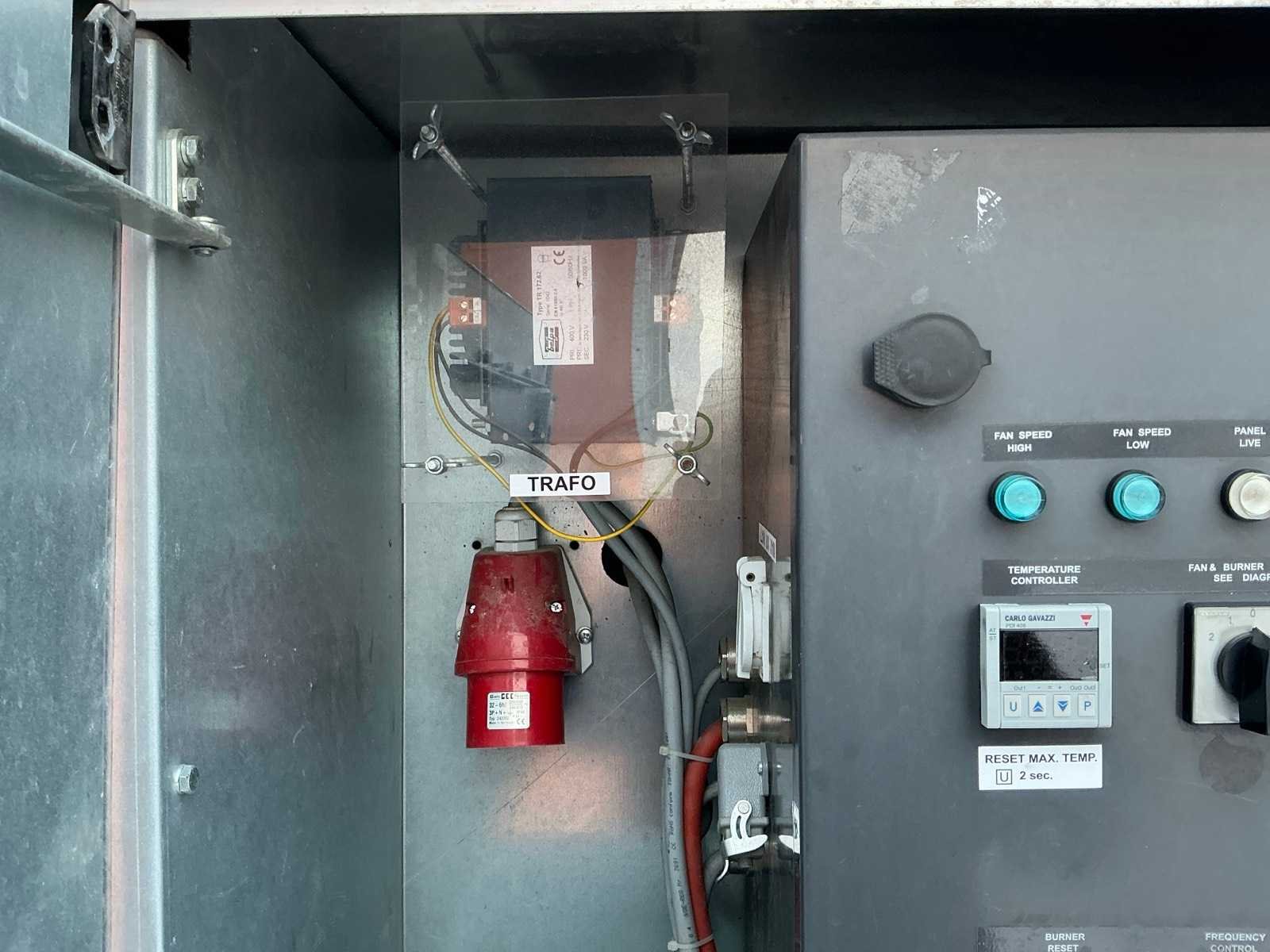 Gegalvaniseerd staal onderstel; gegalvaniseerd staal hijsframe; heftruck vorksleuven; roestvast staal behuizing; diesel gestookt; aansluiting externe brandstoftank; verbruik circa 38 liter brandstof / uur; volumestroom 24000 m3 / uur; afgelezen urenstand 9143 uur; gebruiksporen; not working; Nee Merk: Thermobile Type: IMAC-4000 E Bouwjaar: 2011 Serienummer: 550002 Vermogen: 350kW Ventilator: true Totale afmeting L: 3900mm Totale afmeting Breedte: 1200mm Totale afmeting Hoogte: 2050mm Aansluiting: 400V