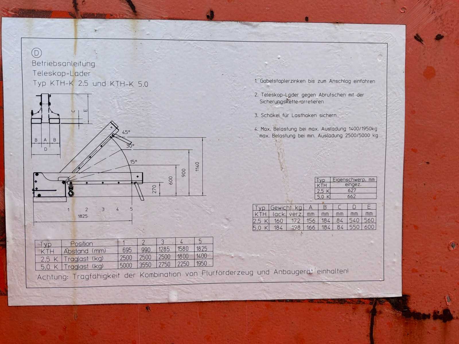 Hijsvermogen 560 - 2500 kg; hijshoek verstelbaar; telescopisch uitschuifbaar 2000 - 3700 mm; hijshaak; Nee Merk: Bauer Type: KTH 2,5 Bouwjaar: 2013 Eigen gewicht: 218kg Totale afmeting L: 2150mm Totale afmeting Breedte: 540mm Totale afmeting Hoogte: 570mm