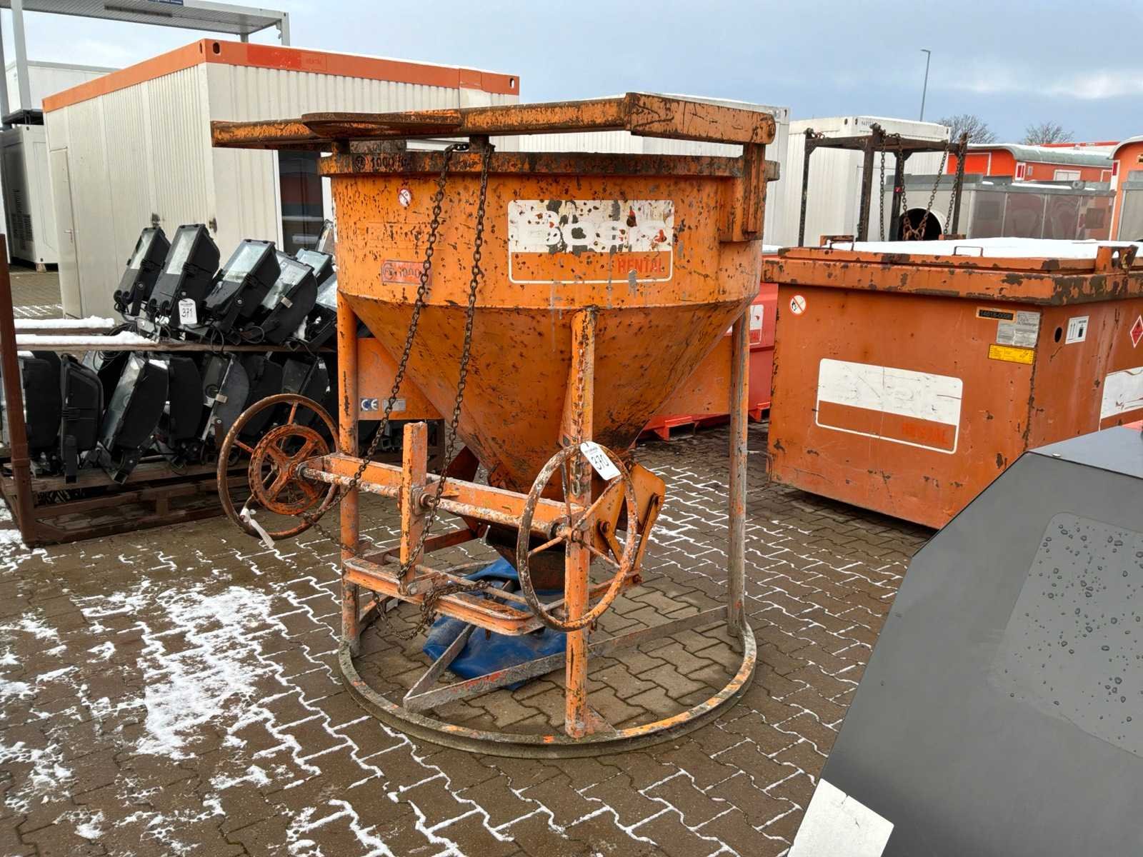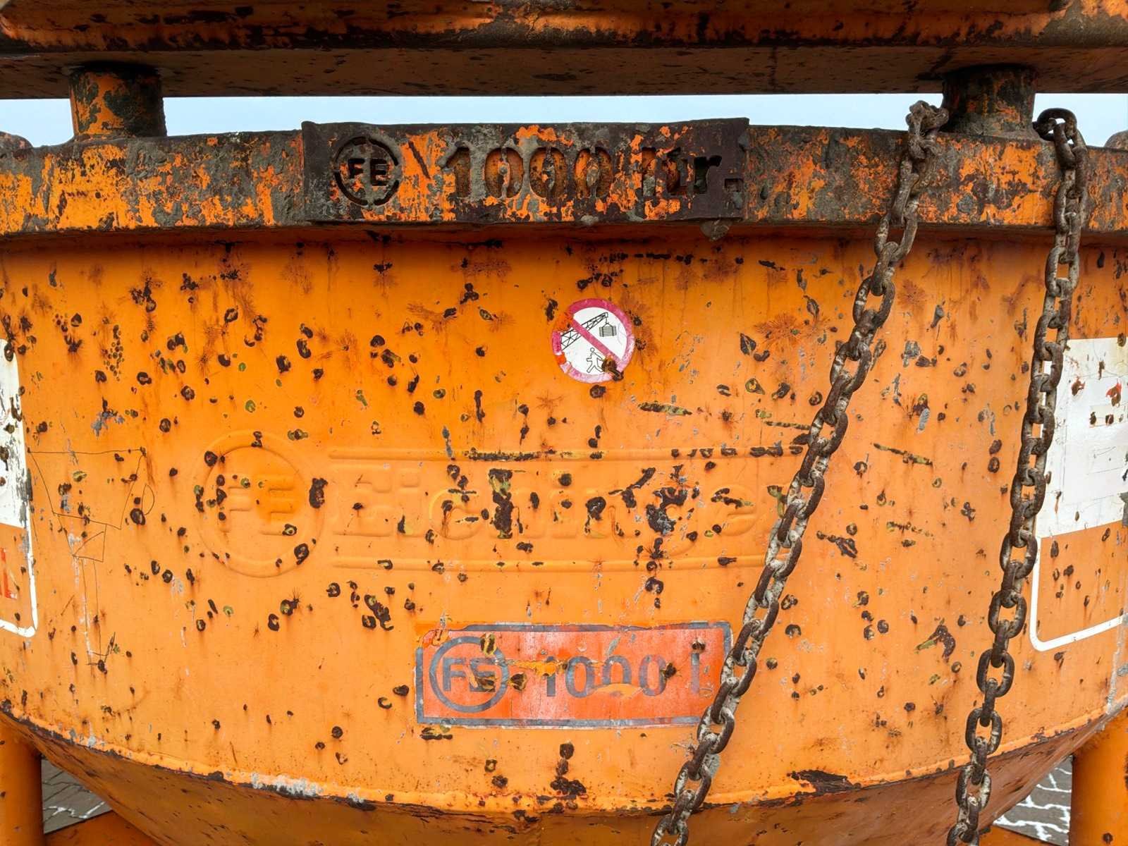 Hijsbeugel; onderlosser; voorzien van losslurf Nee Merk: Eichinger Type: 1016H.12 Bouwjaar: 2017 Inhoud (volume): 1000l Eigen gewicht: 360kg Totale afmeting L: 1550mm Totale afmeting Breedte: 1750mm Totale afmeting Hoogte: 1950mm