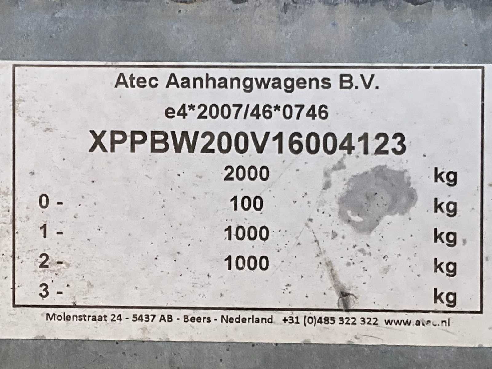 Lengte 4650 mm; breedte 1800 mm; hoogte 1650 mm; gegalvaniseerd staal frame; hout schotten; koprek; neuswiel; geremd; (de koper dient bij transport over de weg zelf te voorzien in een geldig kenteken; een 7 of 9 polige aansluitstekker of verloopstuk met kabel (verlengsnoer kan ter plaatse tegen betaling aangekocht worden); eventueel extra lichtbalk; Nederlandse kentekenpapieren; zonder gelijkvormigheidsattest; Nee Merk: Atec Type: EB2 2-1 Bouwjaar: 2017 Chassisnummer: XPPBW200V16004123 Aantal assen: 2 Laadbak afmeting l: 305cm Laadbak afmeting b: 135cm Ledig gewicht: 460kg Laadvermogen: 1540kg Datum eerste toelating: 2016-08-30 Datum eerste toelating (NL): 2016-08-30 Kenteken: 09-WP-JV