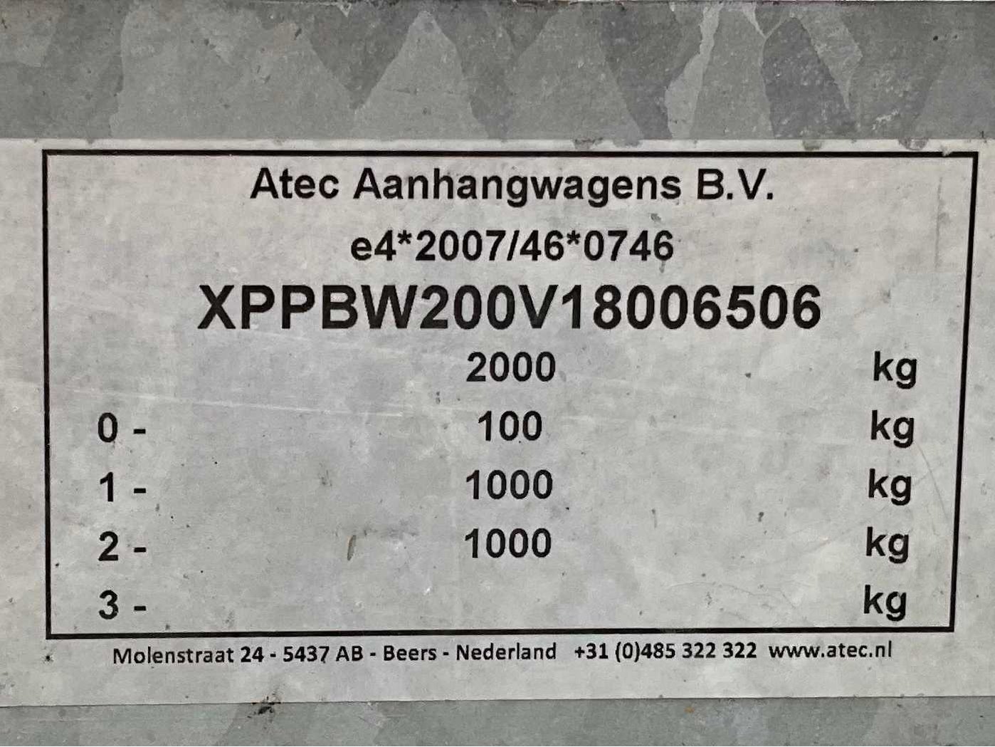 Lengte 4650 mm; breedte 1800 mm; hoogte 1650 mm; gegalvaniseerd staal frame; hout schotten; koprek; neuswiel; geremd; achterlicht te herstellen; (de koper dient bij transport over de weg zelf te voorzien in een geldig kenteken; een 7 of 9 polige aansluitstekker of verloopstuk met kabel (verlengsnoer kan ter plaatse tegen betaling aangekocht worden); eventueel extra lichtbalk; Nederlandse kentekenpapieren; zonder gelijkvormigheidsattest; Nee Merk: Atec Type: EB2 2-1 Bouwjaar: 2018 Chassisnummer: XPPBW200V18006506 Aantal assen: 2 Laadbak afmeting l: 305cm Laadbak afmeting b: 135cm Ledig gewicht: 460kg Laadvermogen: 1540kg Datum eerste toelating: 2018-06-11 Datum eerste toelating (NL): 2018-06-11 Kenteken: 38-WS-ND