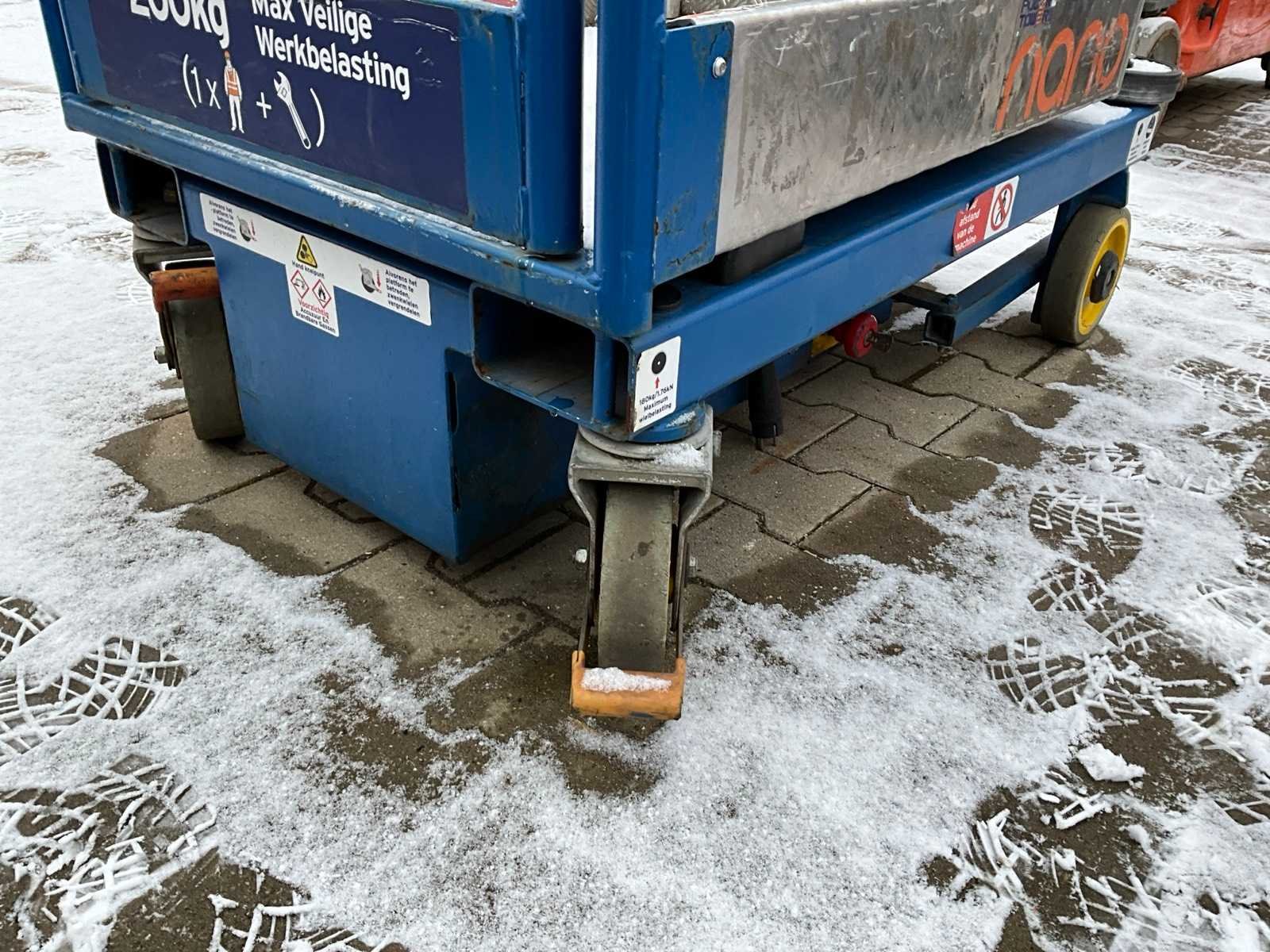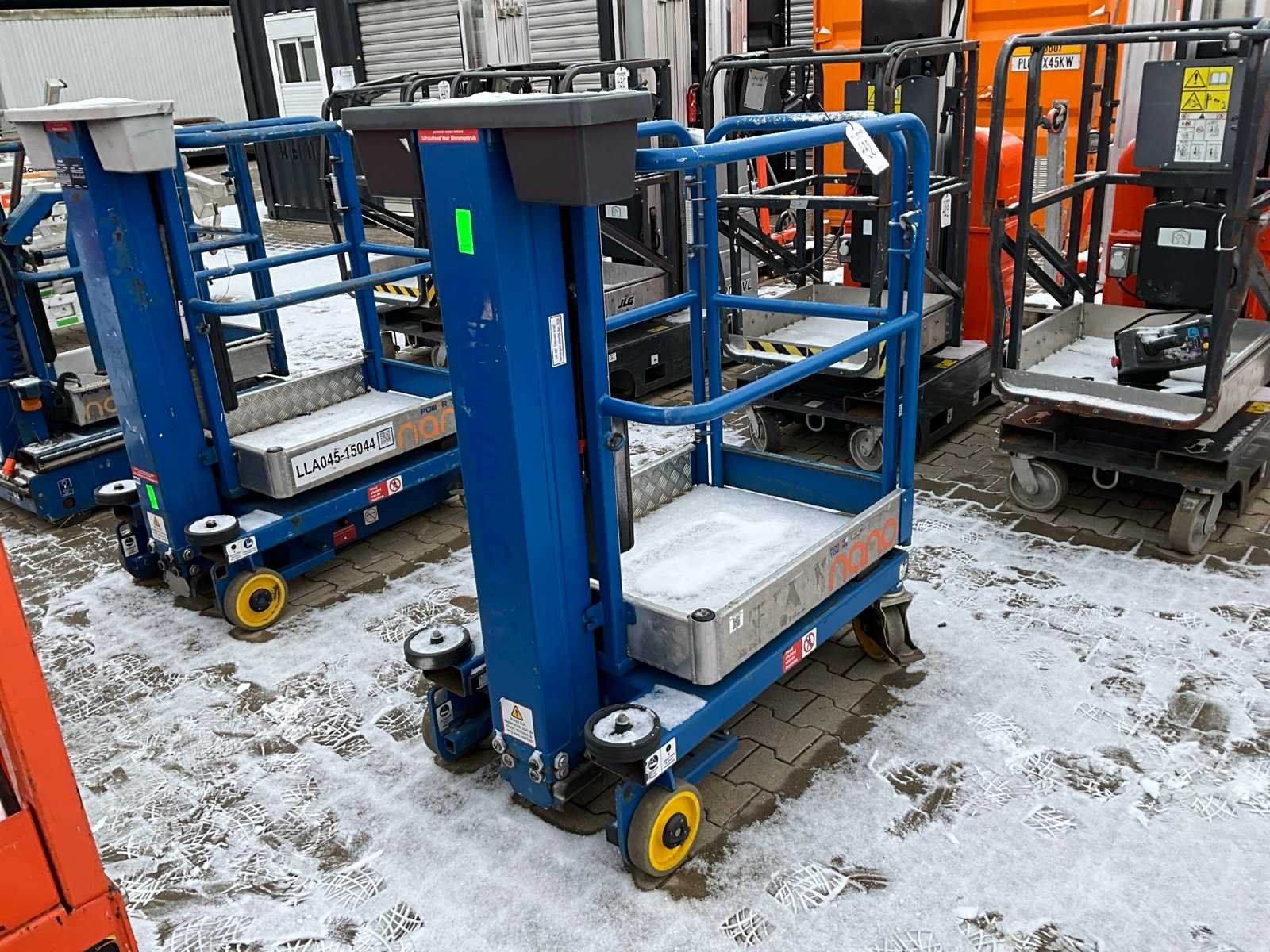 Gebruik: binnen; platform vloerhoogte 2500 mm; elektrisch verticaal liftmechanisme; accu 12 Volt DC; kooibediening; uitschuifbaar platform afmeting 1500x730 mm; handbediend verrijdbaar; voorzien heftruck vorksleuven; working condition, accu leeg Nee Merk: JLG Power Tower Type: Nano Bouwjaar: 2015 Serienummer: 27063115C Elektrisch: true Masthoogwerker: true Werkhoogte: 4500mm Plateau afm. l: 900mm Plateau afm. b: 670mm Platform capaciteit: 200kg Eigen gewicht: 285kg Totale afmeting L: 1250mm Totale afmeting Breedte: 750mm Totale afmeting Hoogte: 1600mm