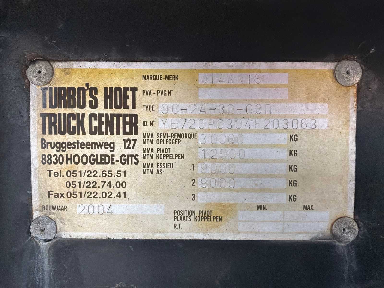 Oplegger voorzien van container plateau; afmetingen plateau 6,10mx2,43m; working not verified Let op! Dit voertuig heeft een kentekenregristratie, bij afhalen dient u dit ter plaatse bij een derde partij te naam te stellen of te exporteren. Hier zijn extra kosten aan verbonden. Lxl Nee Merk: Jiannis Type: YE720PC304H203063 Bouwjaar: 2004 Kenteken: OH-09-NP Datum eerste toelating (NL): 2004-05-28 Datum eerste toelating: 2004-05-28 APK vervaldatum: 2025-09-20 Aantal assen: 2 Laadvermogen: 27140kg Totale afmeting L: 7030mm Totale afmeting Breedte: 2430mm Totale afmeting Hoogte: 2460mm No self drive export!: true
