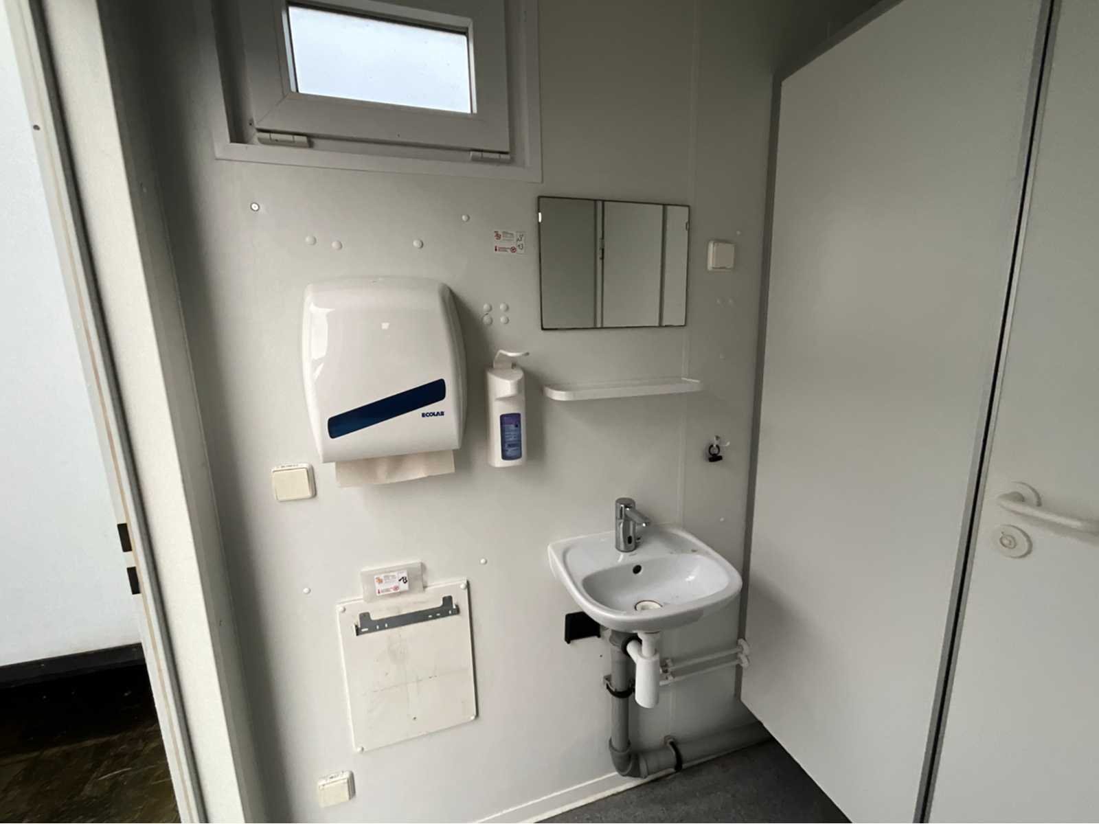 Staal frame; 1x buitendeur; 1x toilet; 1x douche; 2x wastafel; boiler; verwarming; verlichting; stroom aansluiting; wateraansluiting; afvoer; 1x toiletdeur; 1x binnendeur; 3x klein raam; twistlocks; de koper dient zelf te zorgen voor transport en open vrachtauto met laadkraan; Nee Aantal toiletten: 1 Totale afmeting L: 3000mm Totale afmeting Breedte: 2450mm Totale afmeting Hoogte: 2800mm