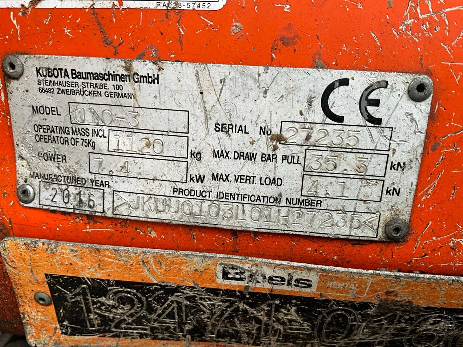 Zonder cabine; neerklapbare rolbeugel; rubber rupsbanden; rupsen hydraulisch in breedte verstelbaar 750 - 990 mm; binnendraaier; maximale uitstorthoogte 2200 mm; extra hydraulische functie; not working; motor slaat af na enkele minuten Nee Merk: Kubota Type: U10-3 Bouwjaar: 2016 Merk motor: Kubota Motorvermogen (kW): 7.4kW Aantal cilinders: 3 Brandstof: Diesel Max. werkbereik: 3300mm Max. graafdiepte: 1800mm Graafbak afm. l: 700mm Graafbak afm. b: 240mm Graafbak afm. h: 300mm Rups breedte: 180mm Afgelezen urenstand: 2827 Eigen gewicht: 1150kg Totale afmeting L: 3000mm Totale afmeting Breedte: 1000mm Totale afmeting Hoogte: 2250mm