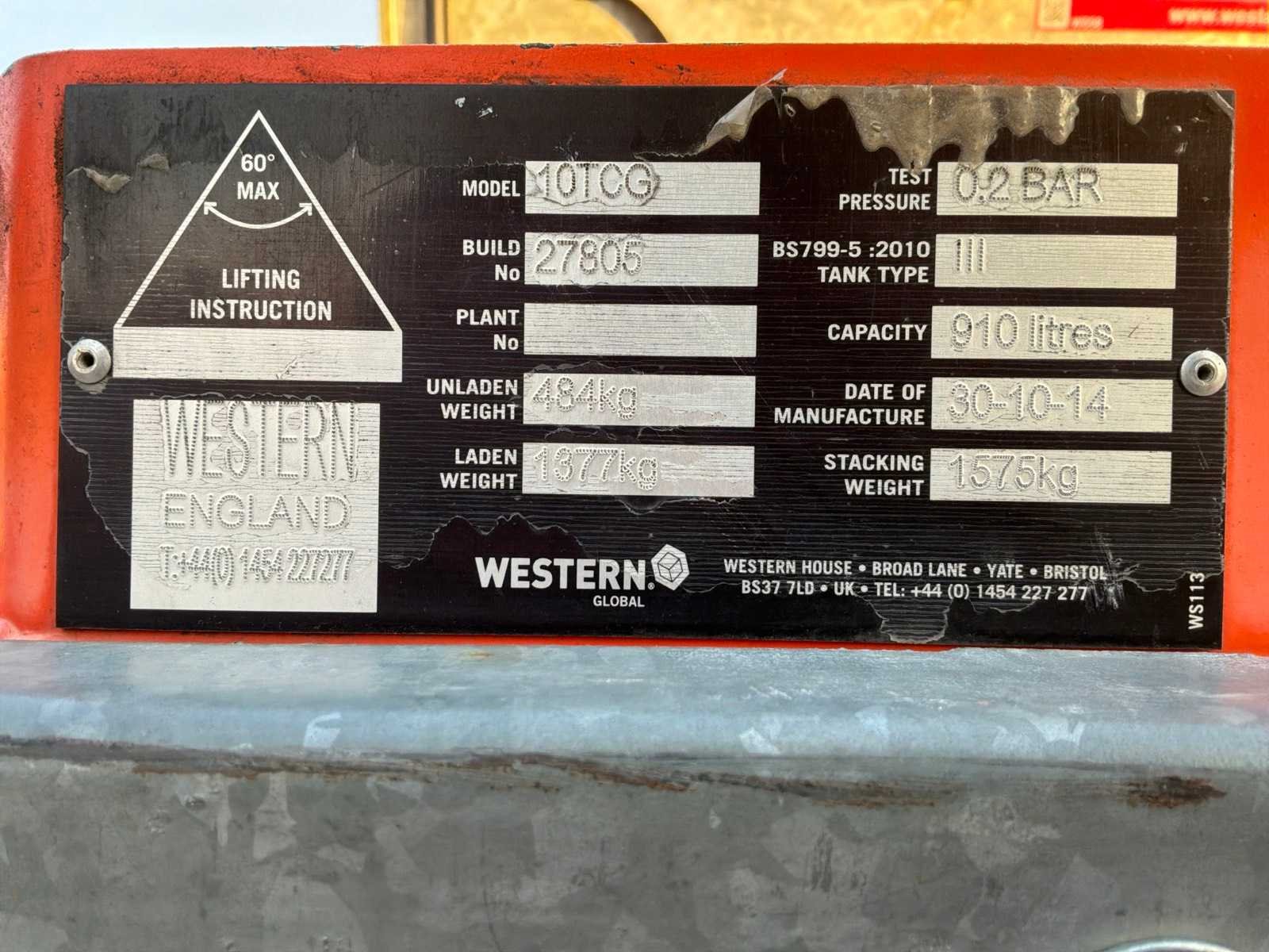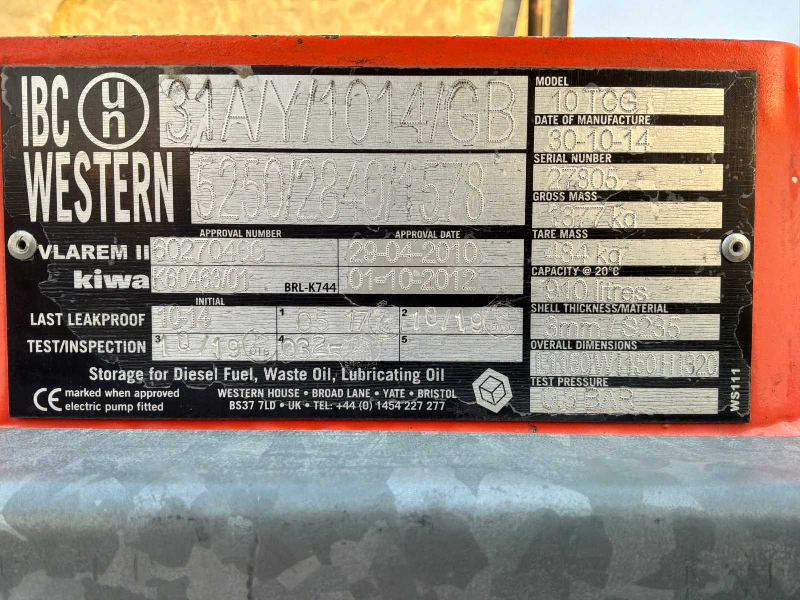 Stapelbaar; capaciteit 910 liter; opklapbaar klep; diverse aansluitslangen; heftruck vorksleuven; working condition not verified; Nee Merk: IBC Western Gewicht: 448kg Type: 10TCG Bouwjaar: 2014 Staal: true Totale afmeting L: 1150mm Totale afmeting Breedte: 1150mm Totale afmeting Hoogte: 1320mm