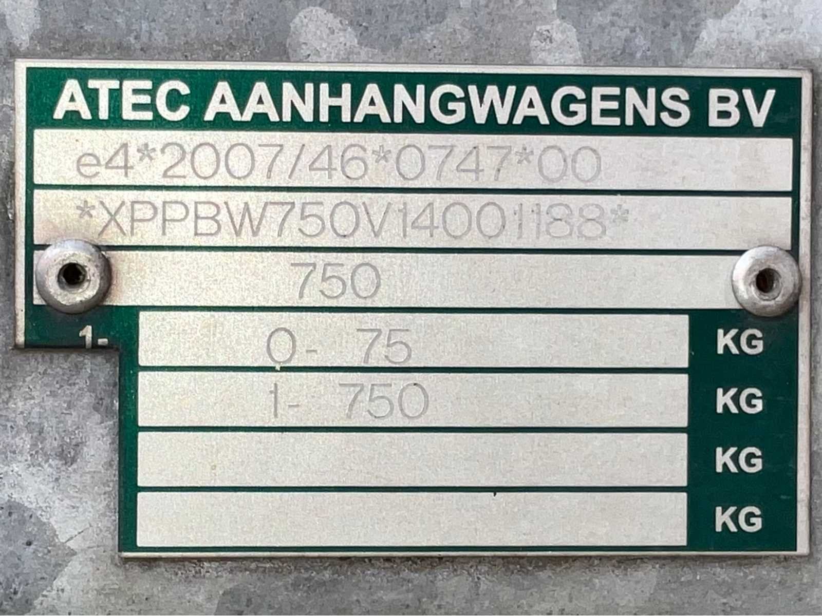 Lengte 3900 mm; breedte 1750 mm; hoogte 1500 mm; gegalvaniseerd staal frame; hout schotten; koprek; neuswiel; (de koper dient bij transport over de weg zelf te voorzien in een geldig kenteken; een 7 of 9 polige aansluitstekker of verloopstuk met kabel (verlengsnoer kan ter plaatse tegen betaling aangekocht worden); eventueel extra lichtbalk); zonder kentekenpapieren; zonder gelijkvormigheidsattest; Nee Merk: Atec Type: EO1300 Bouwjaar: 2014 Chassisnummer: XPPBW750V14001188 Aantal assen: 1 Laadbak afmeting l: 250cm Laadbak afmeting b: 130cm